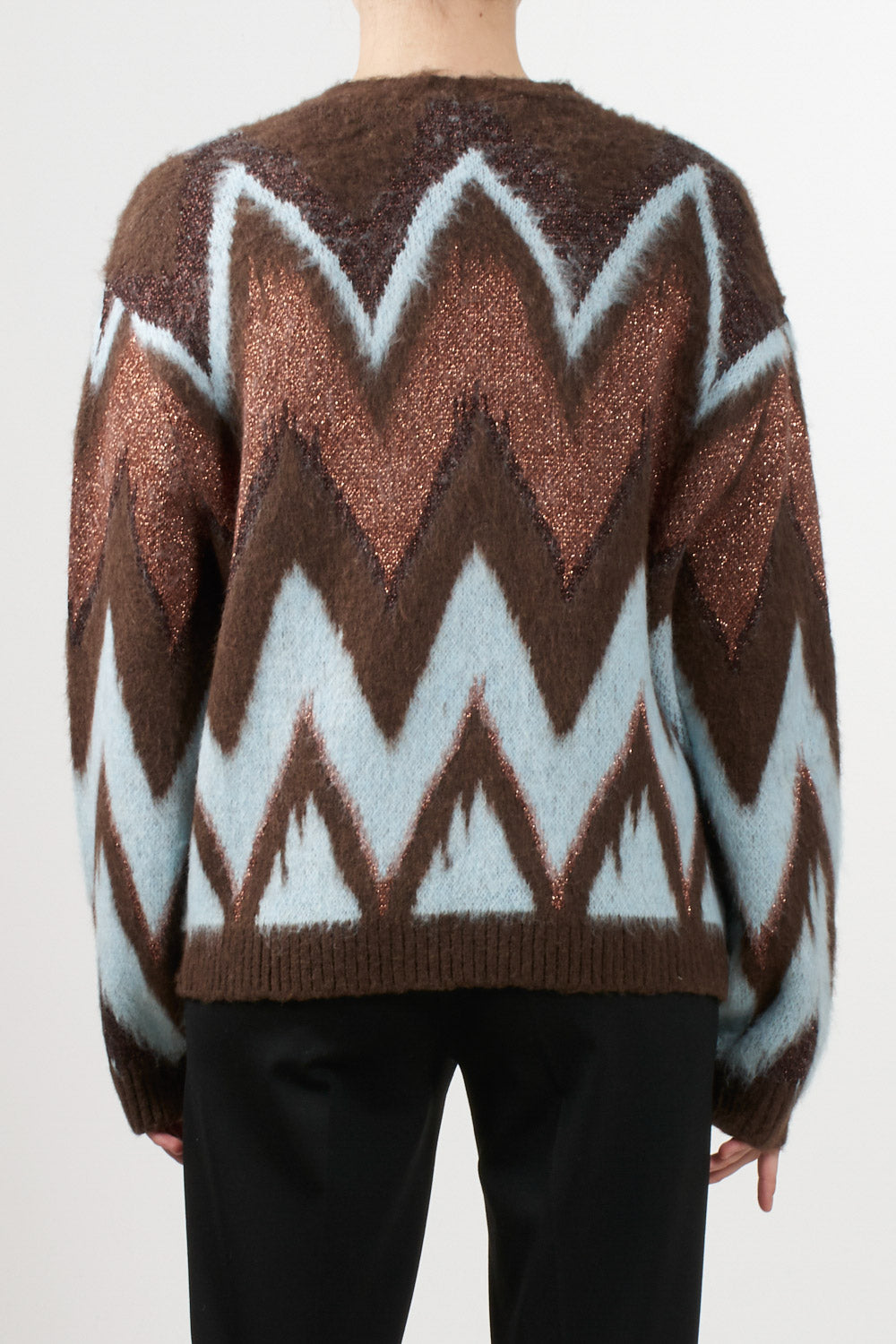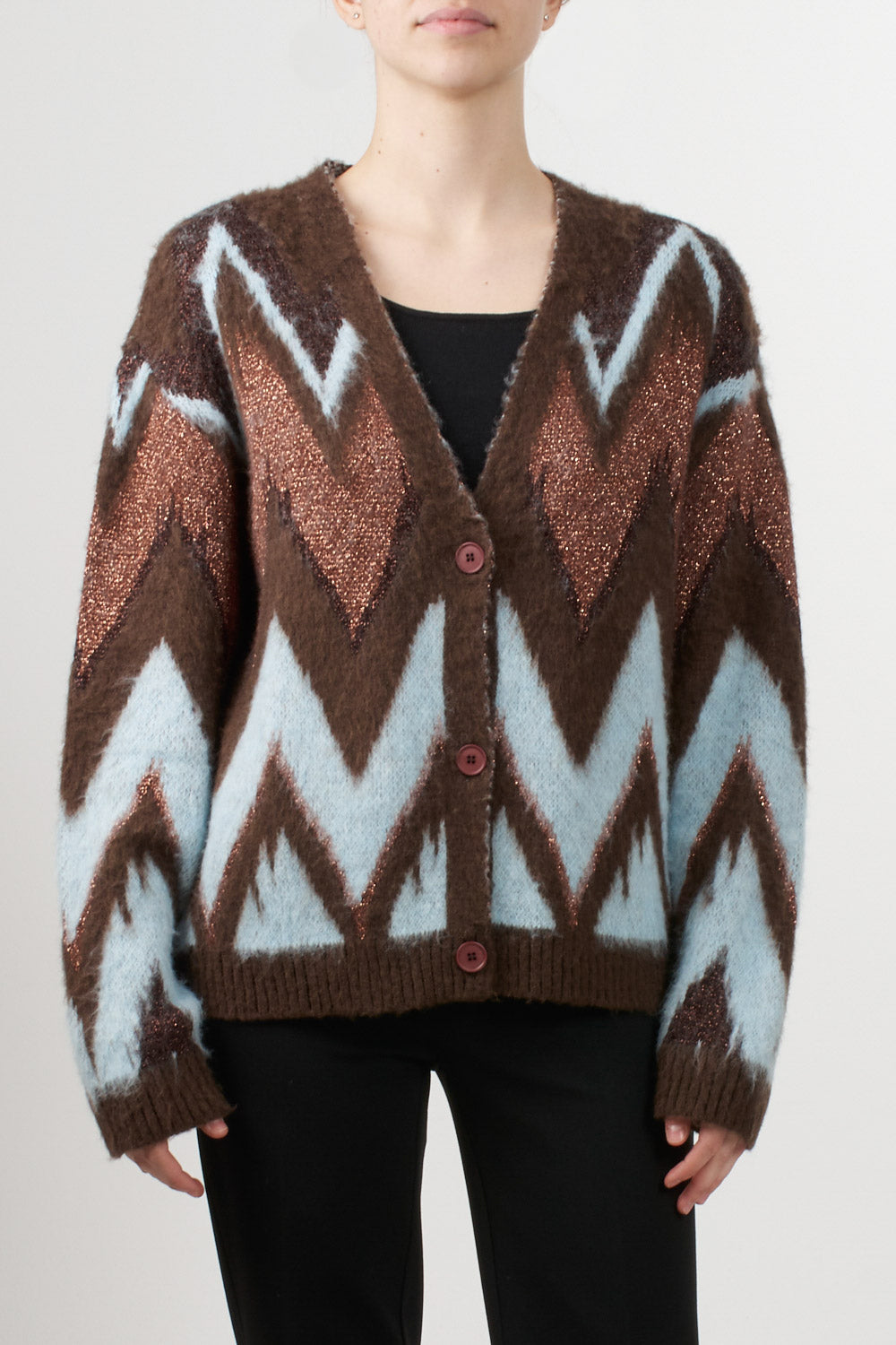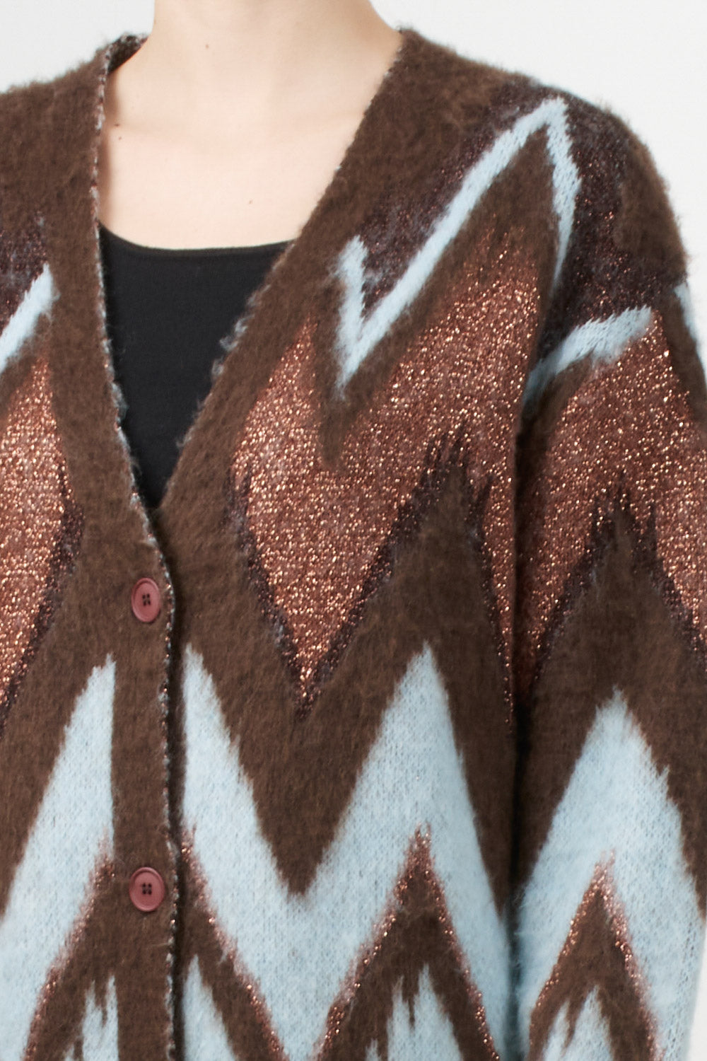 Tensione In knitted cardigan with a geometric zigzag pattern in shades of brown, light blue and copper lurex.