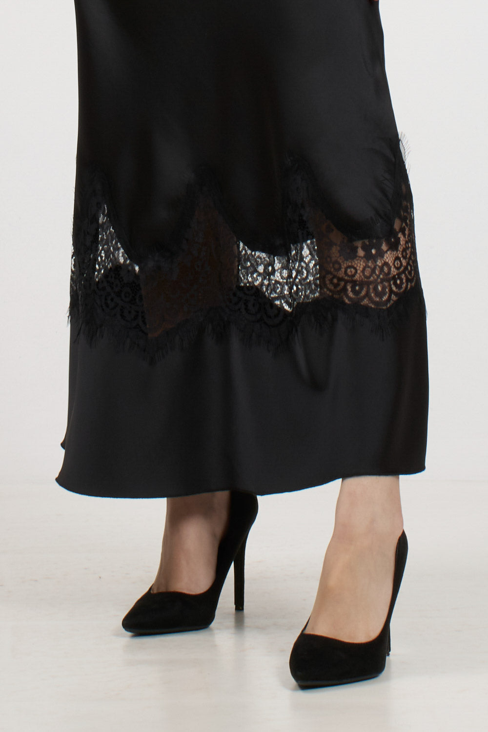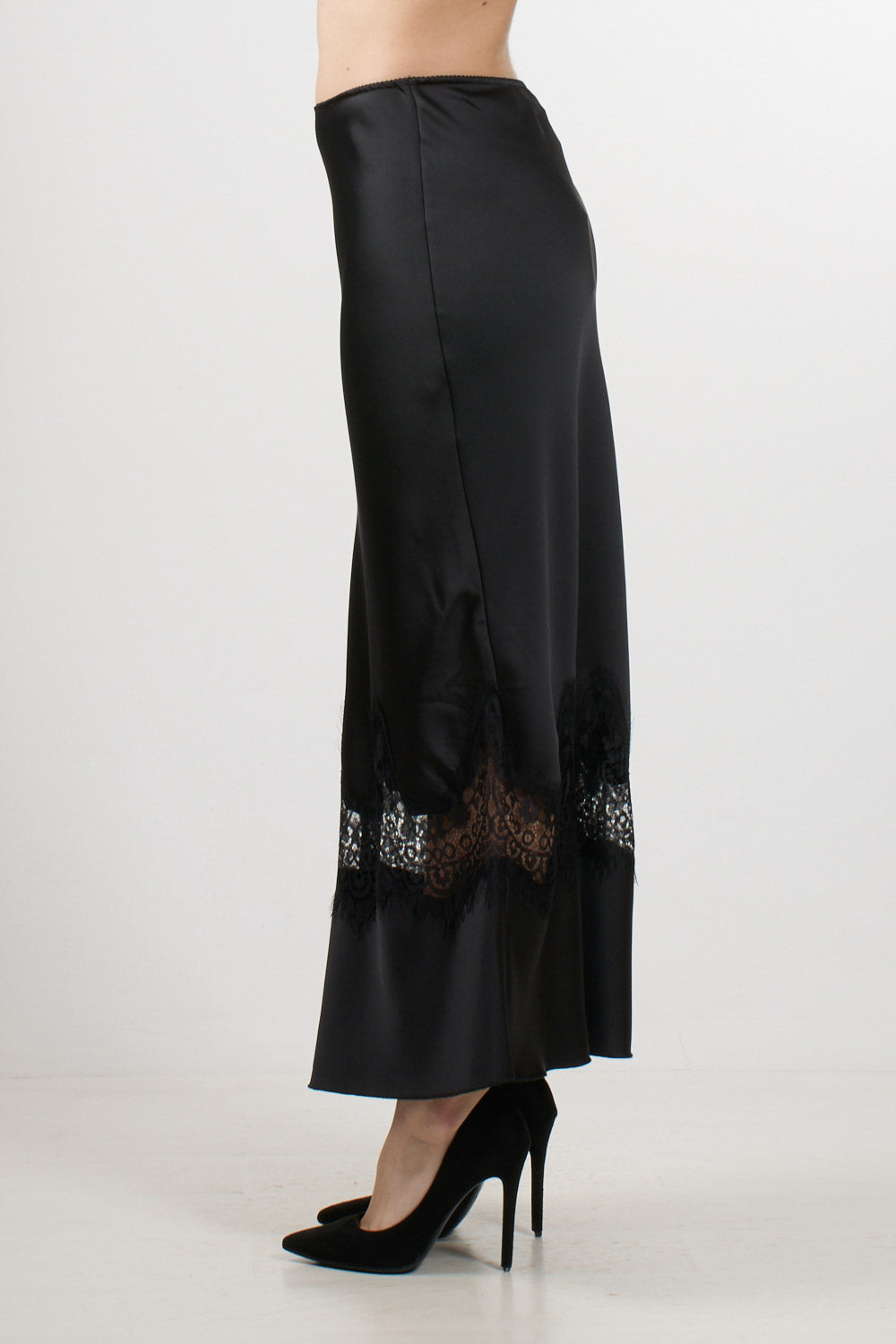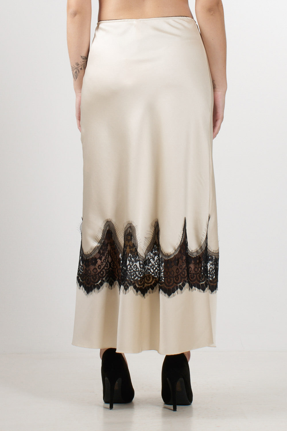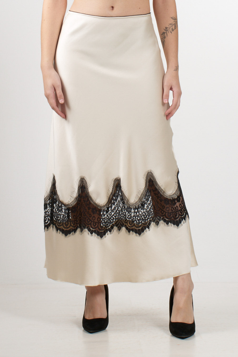 Satin-effect midi skirt with a flowing and feminine silhouette. The design is embellished with an embroidered lace insert with a wave motif, adding a sophisticated touch to the hem. The sleek waist and flared cut flatter the silhouette, perfect for elegant or casually chic looks.