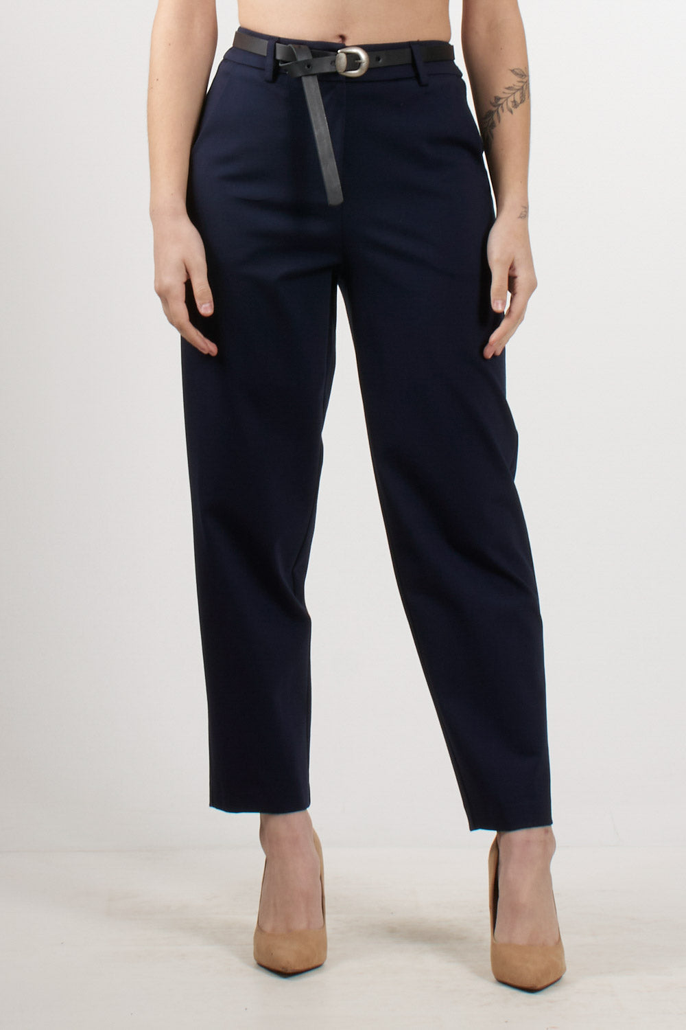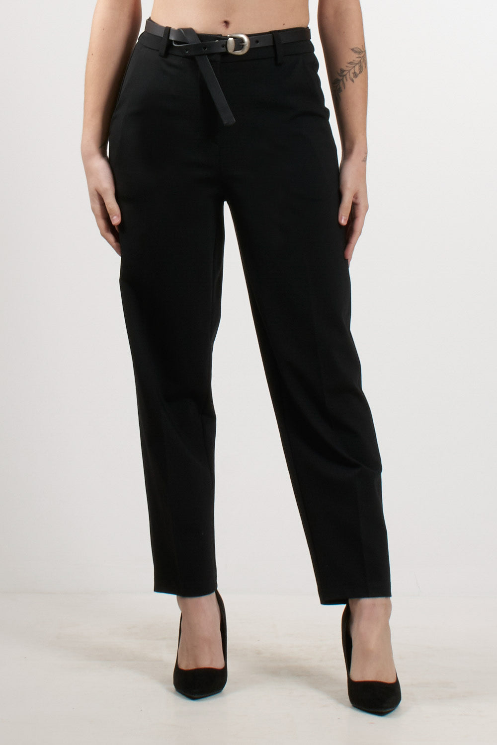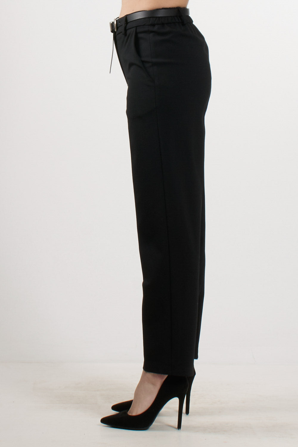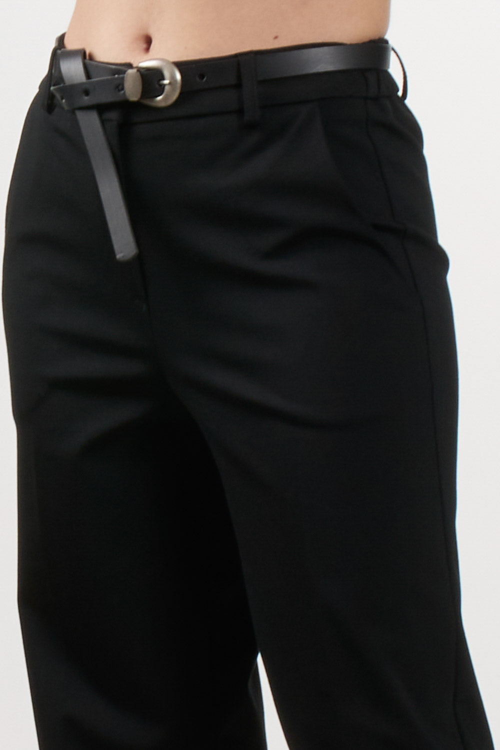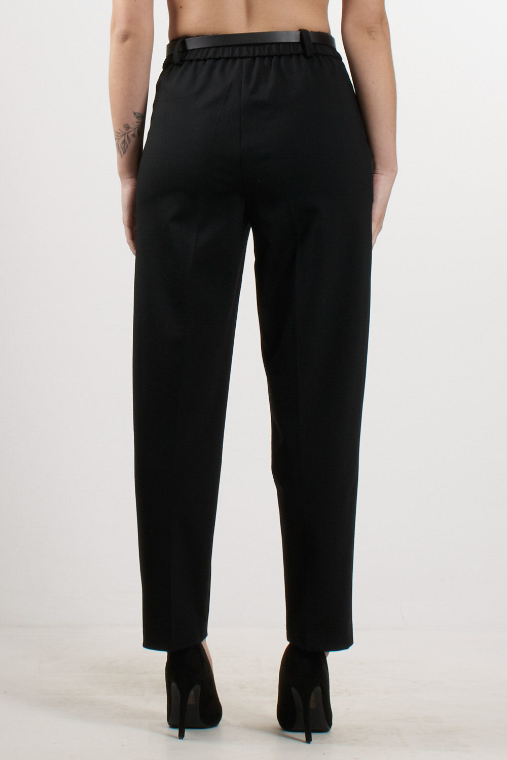 Motel trousers with elasticated mid-rise at the back, side pockets, a thin faux leather belt that adds a bold touch to the garment, Concealed front fastening.