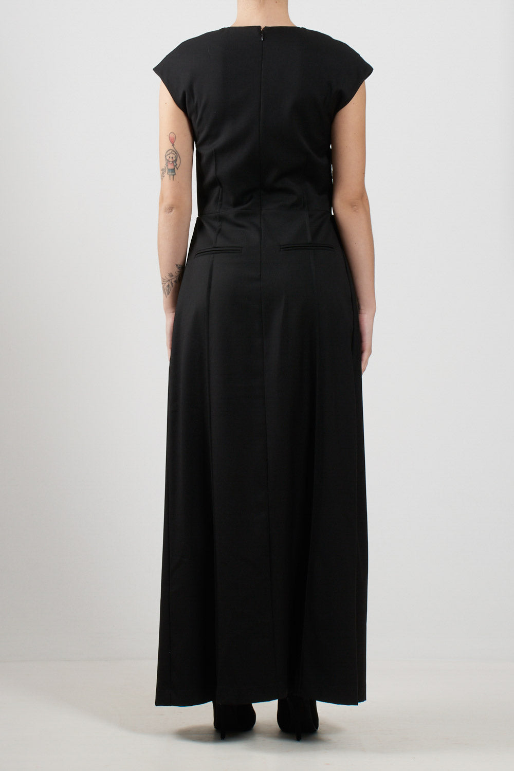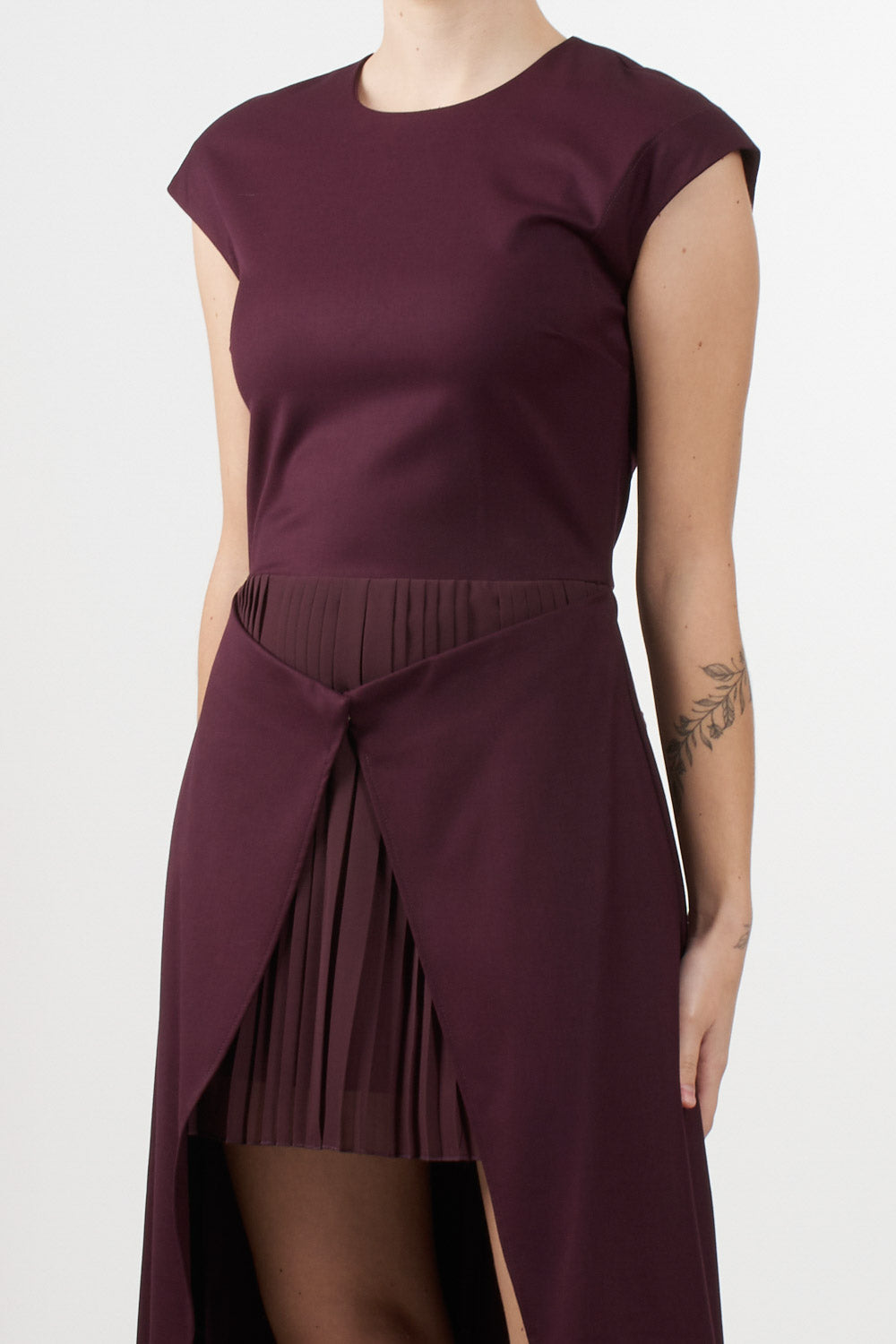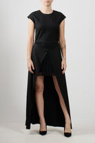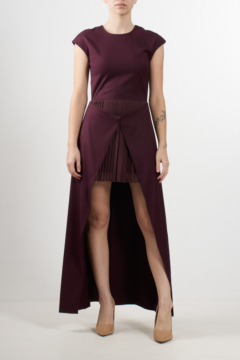 The elegant Jijil long dress features a short-sleeved bodice and a clean silhouette. The lower half features a sophisticated long overskirt with a front opening that reveals the pleated miniskirt underneath, creating a refined interplay of volumes and lengths. A dramatic and feminine design, perfect for special occasions.