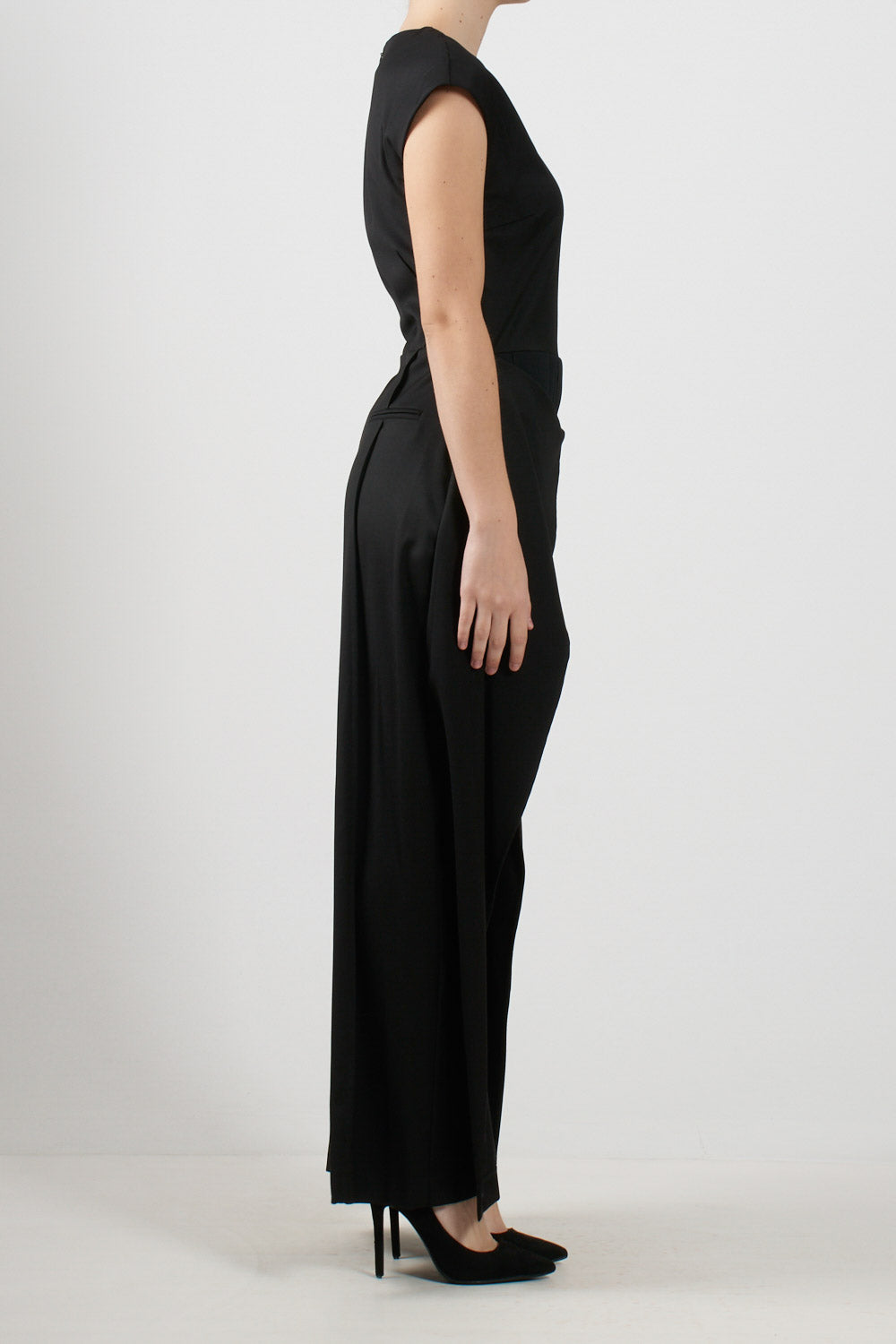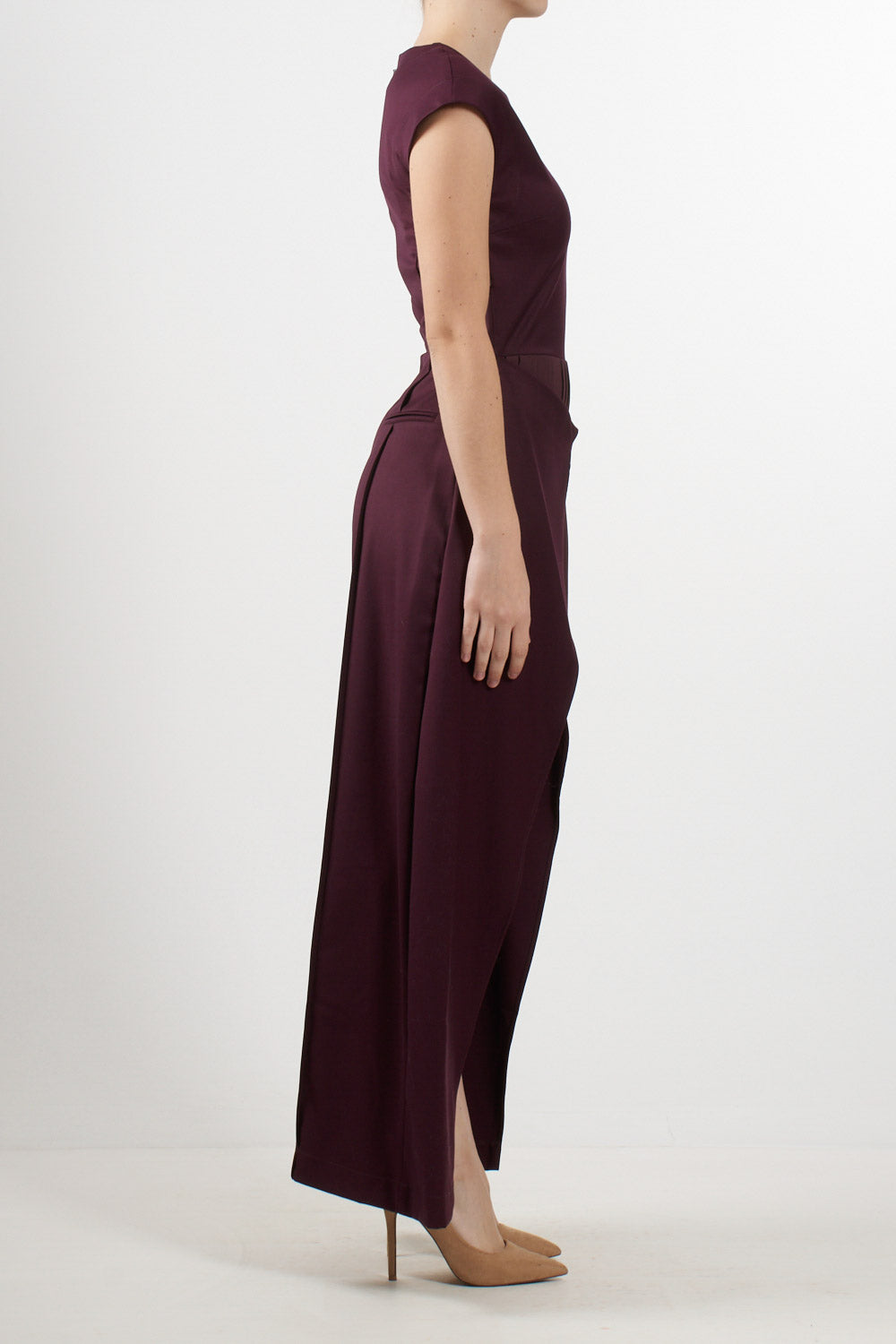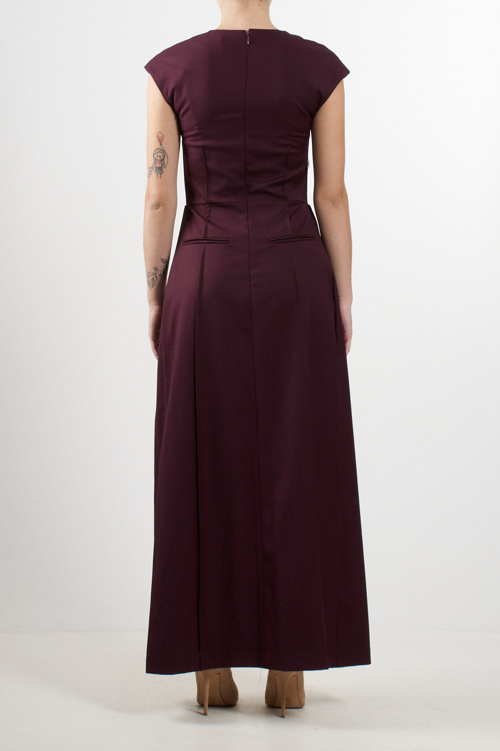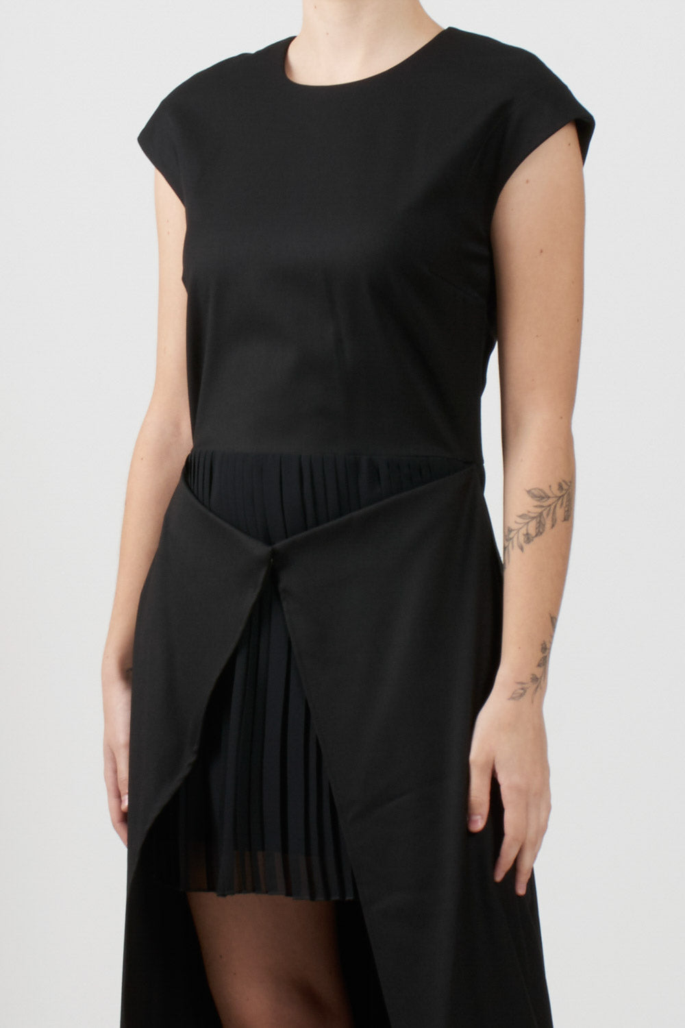 The elegant Jijil long dress features a short-sleeved bodice and a clean silhouette. The lower half features a sophisticated long overskirt with a front opening that reveals the pleated miniskirt underneath, creating a refined interplay of volumes and lengths. A dramatic and feminine design, perfect for special occasions.