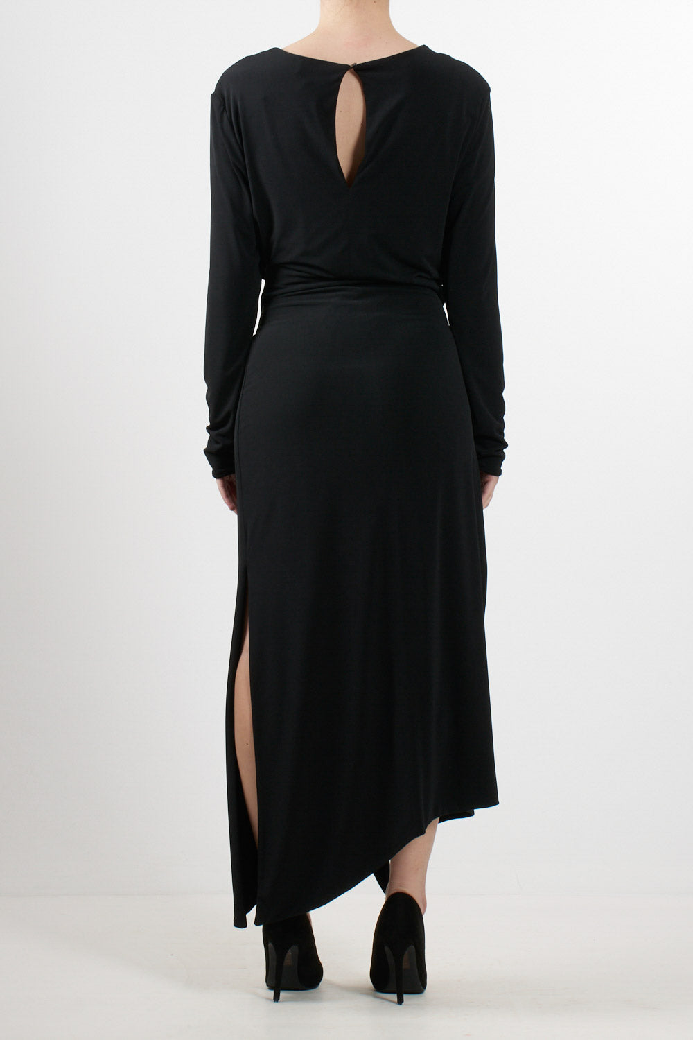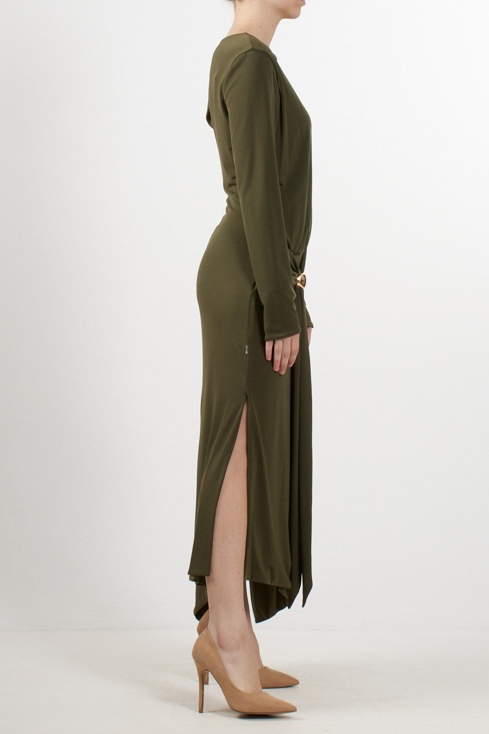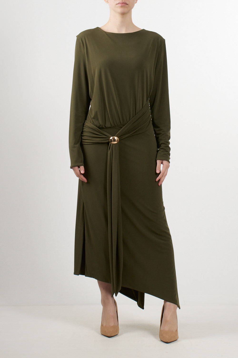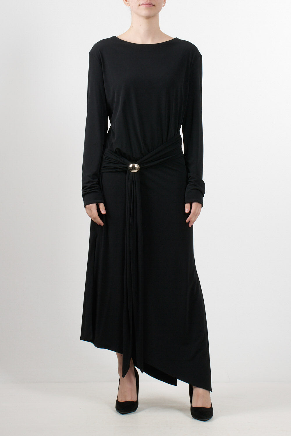 Long dress in lightweight fabric by Jijil, featuring long sleeves, a side slit, and a central draped detail secured with a decorative metal buckle. The asymmetrical hem adds movement and enhances the silhouette.