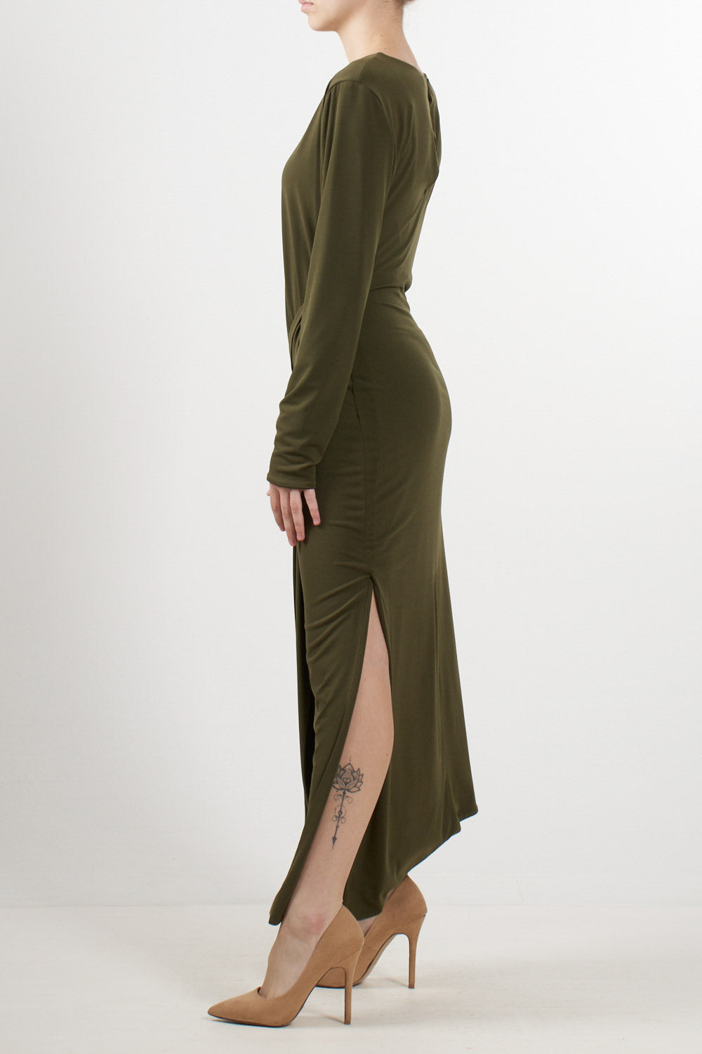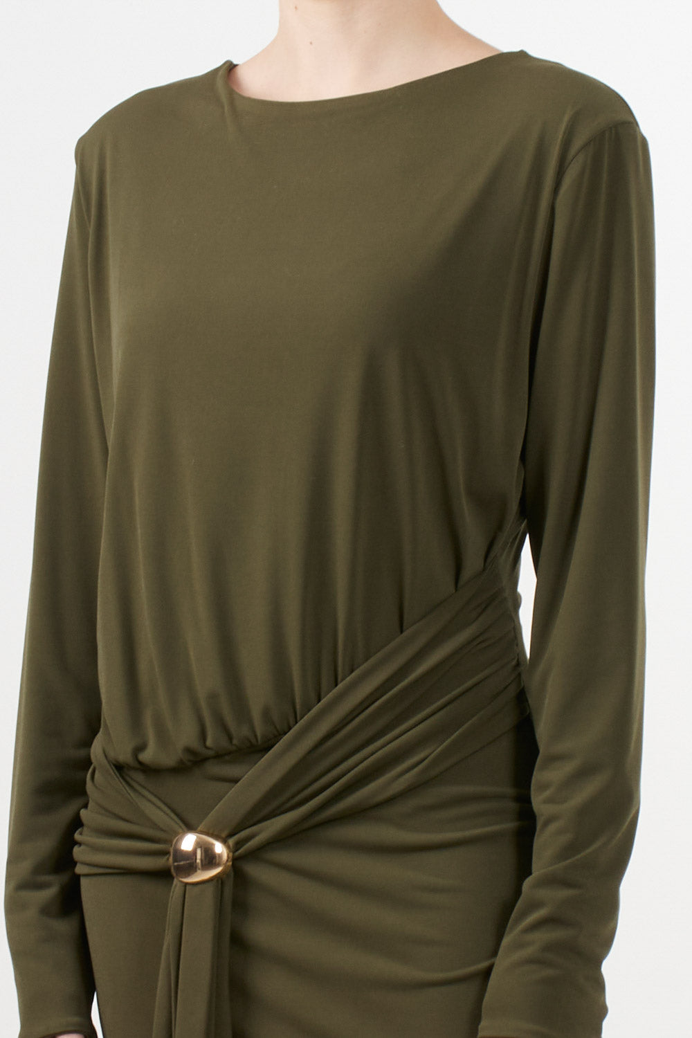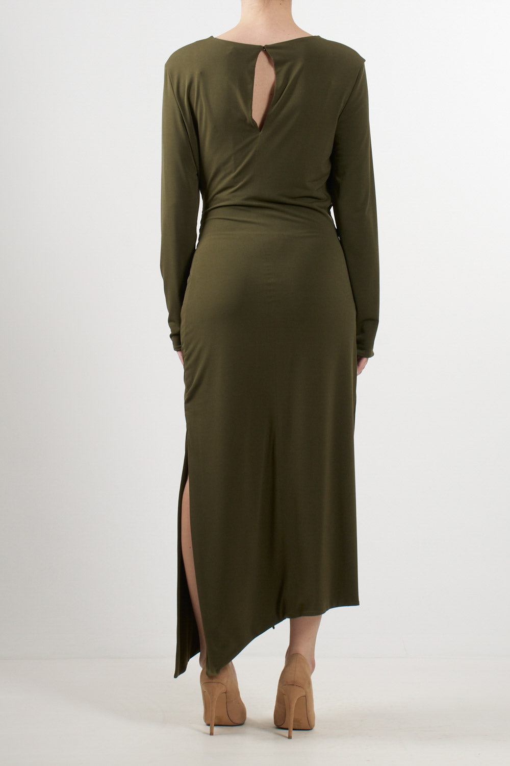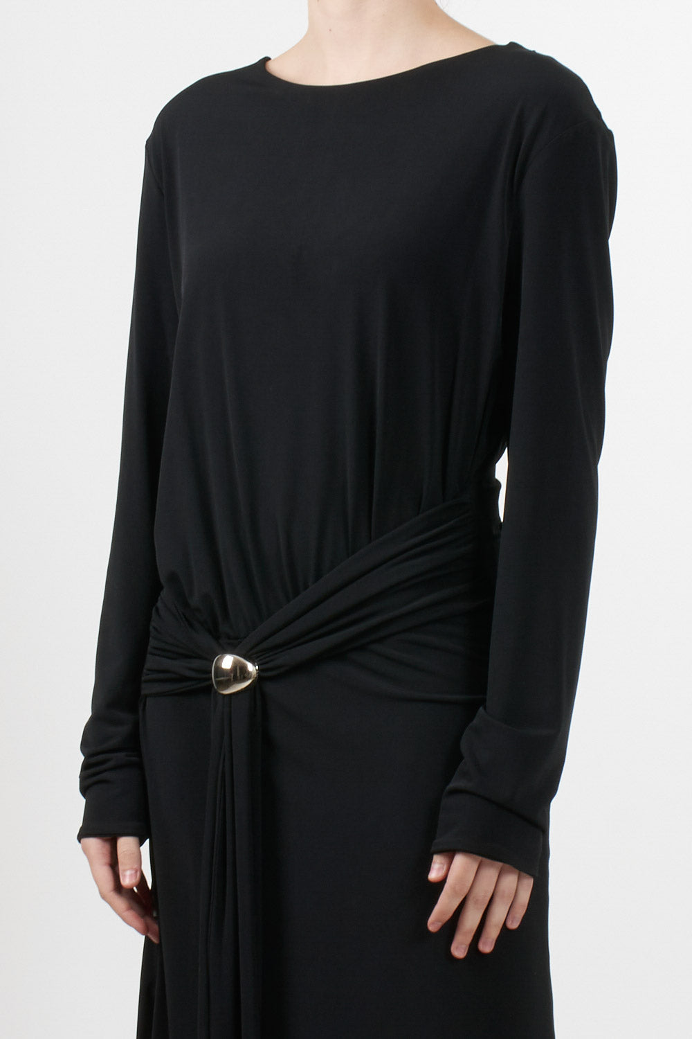Long dress in lightweight fabric by Jijil, featuring long sleeves, a side slit, and a central draped detail secured with a decorative metal buckle. The asymmetrical hem adds movement and enhances the silhouette.