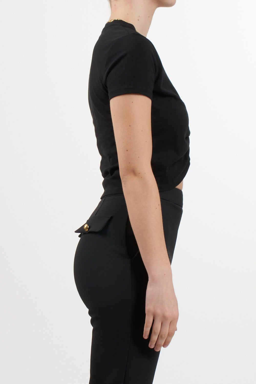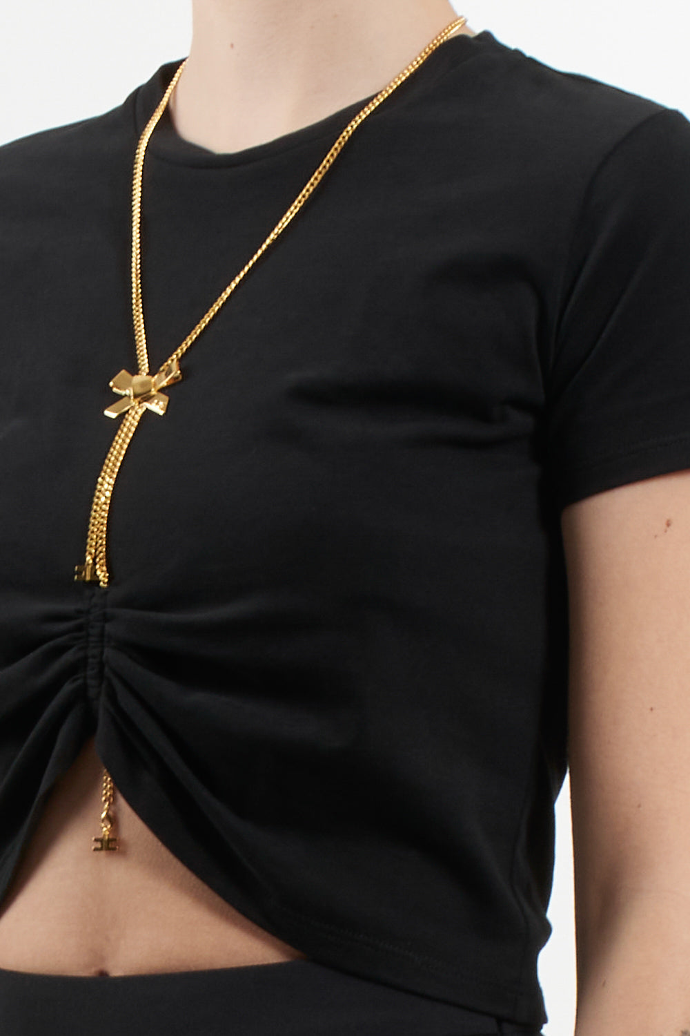 Cropped T-shirt in cotton jersey with a slim fit, embellished with a gold metal necklace with a bow and logo charms at the ends. The model features a logo print on the back of the neck, offering an elegant and sophisticated look.