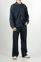 I'M BRIAN oversized denim jacket, featuring a raw wash that adds rigidity and structure. It features a front button fastening with exposed buttons, long sleeves, and a large patch pocket on the chest. Finished with contrasting stitching for a contemporary touch.