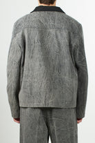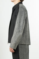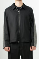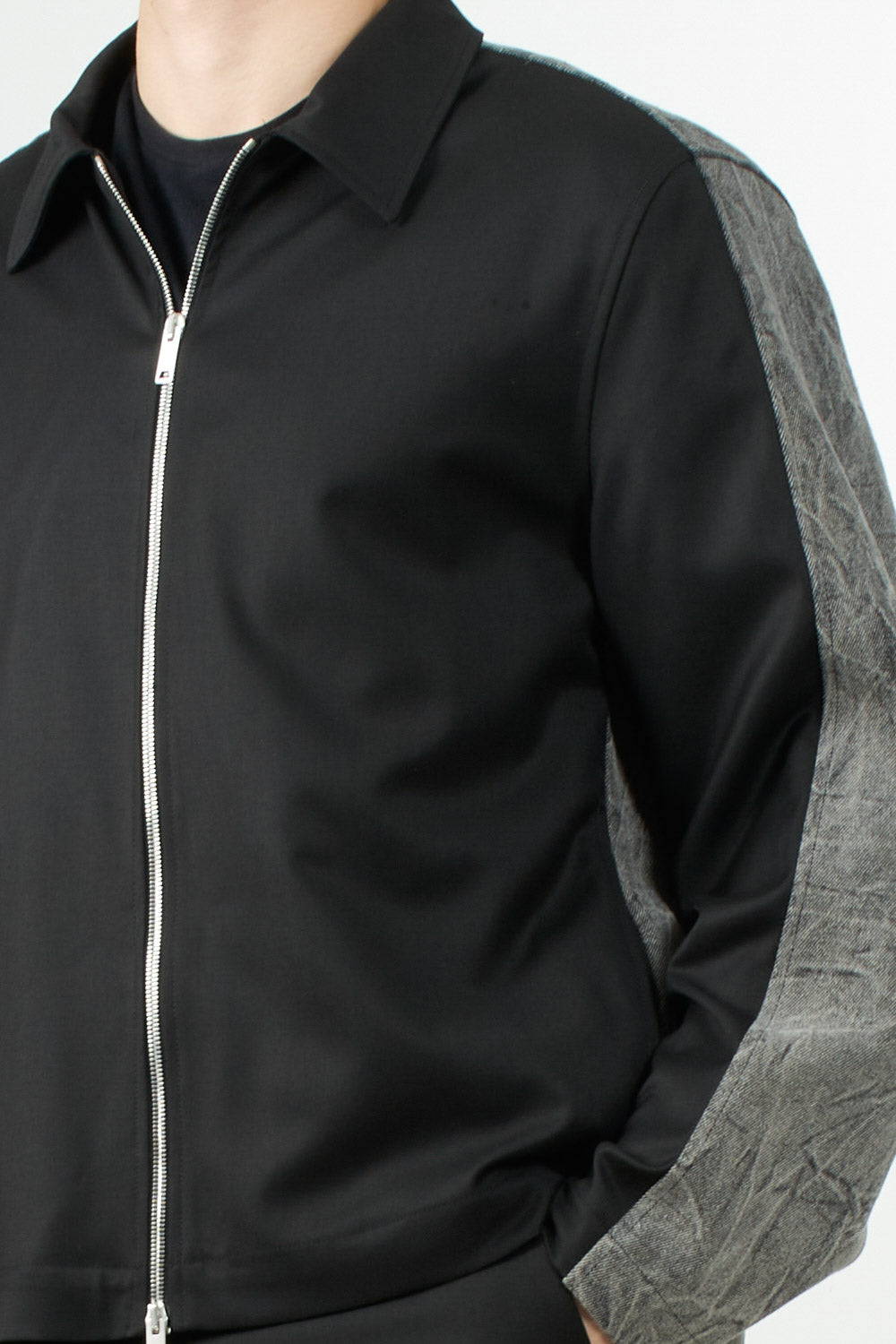 I'M BRIAN jacket with a modern design, featuring a zip-front fastening and a shirt collar. The sleeves are embellished with 100% cotton retro-effect denim inserts, creating a unique contrast. A relaxed and versatile fit, ideal for contemporary casual looks. Complete the look with the matching trousers, code pa3483.