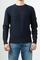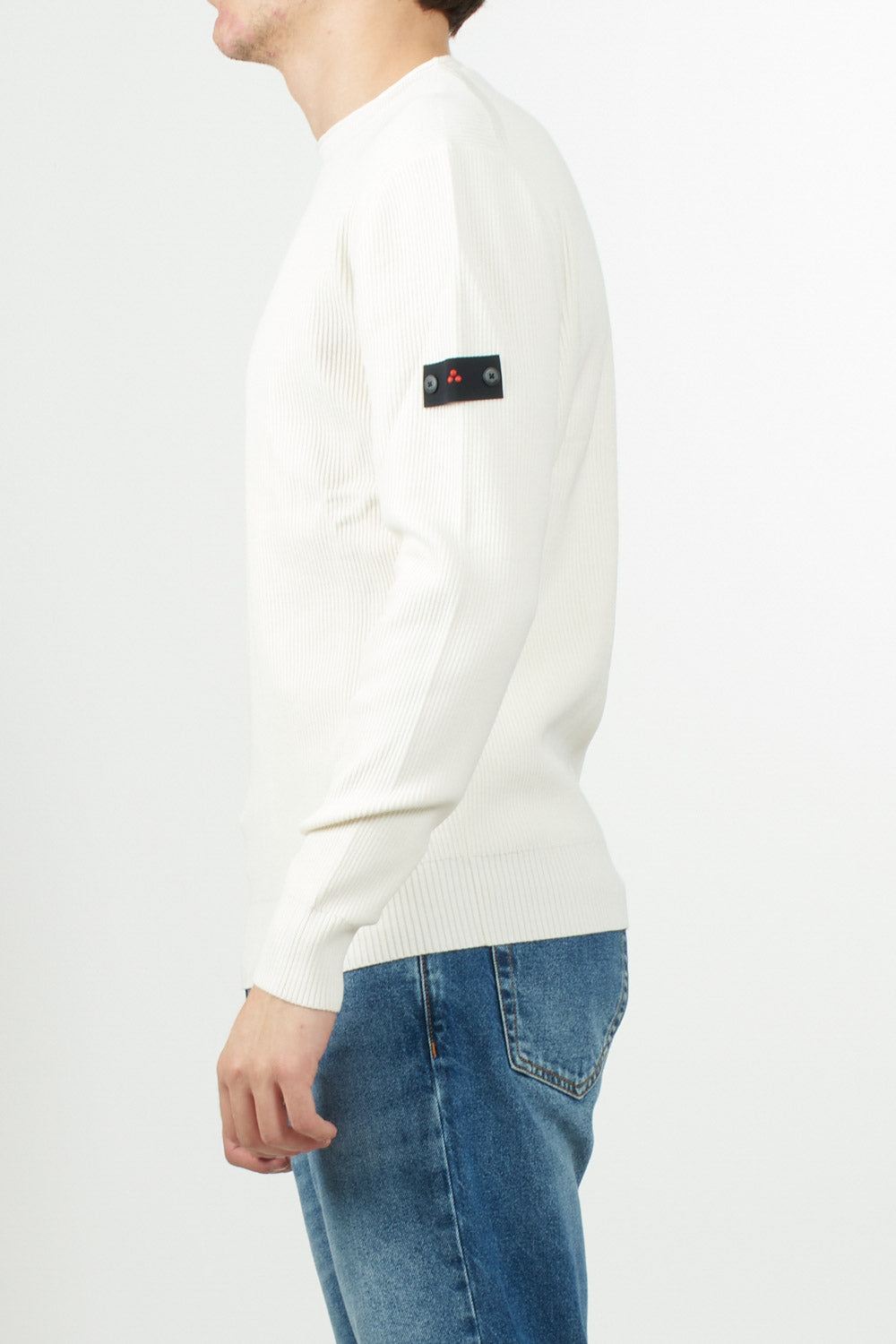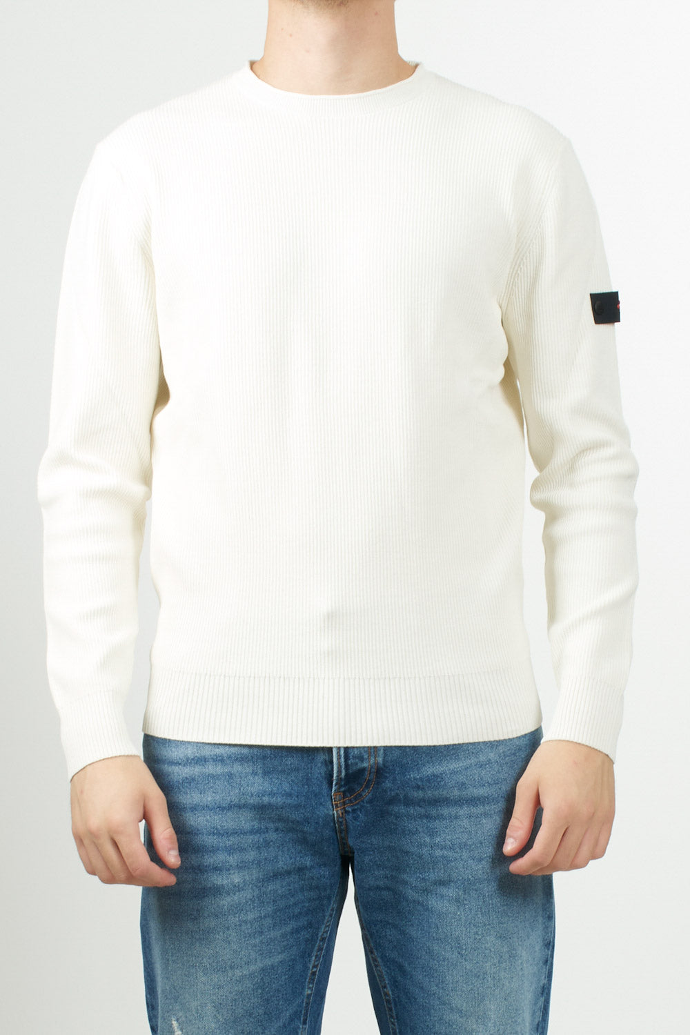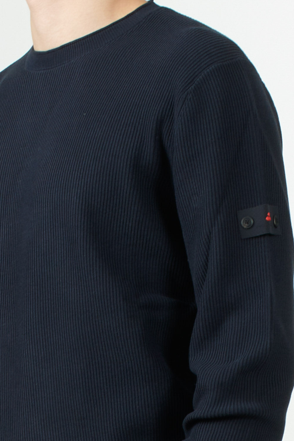 Maglia girocollo di Peuterey in tricot di cotone con lavorazione a costa inglese, logo Peuterey Trilogy, applicato con bottoncini sulla manica sinistra, completa il design con un tocco distintivo e raffinato.
