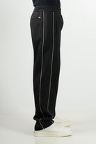Emporio Armani double jersey trousers. The elastic waistband with internal drawstring and a concealed faux zip ensure comfort and practicality. The design is completed by side and back welt pockets, decorative piping, and the EA logo plaque that marks the piece.