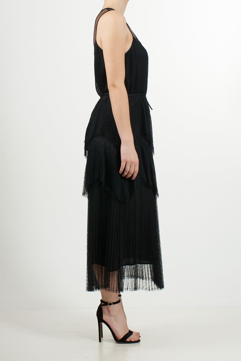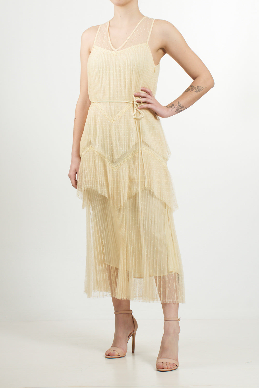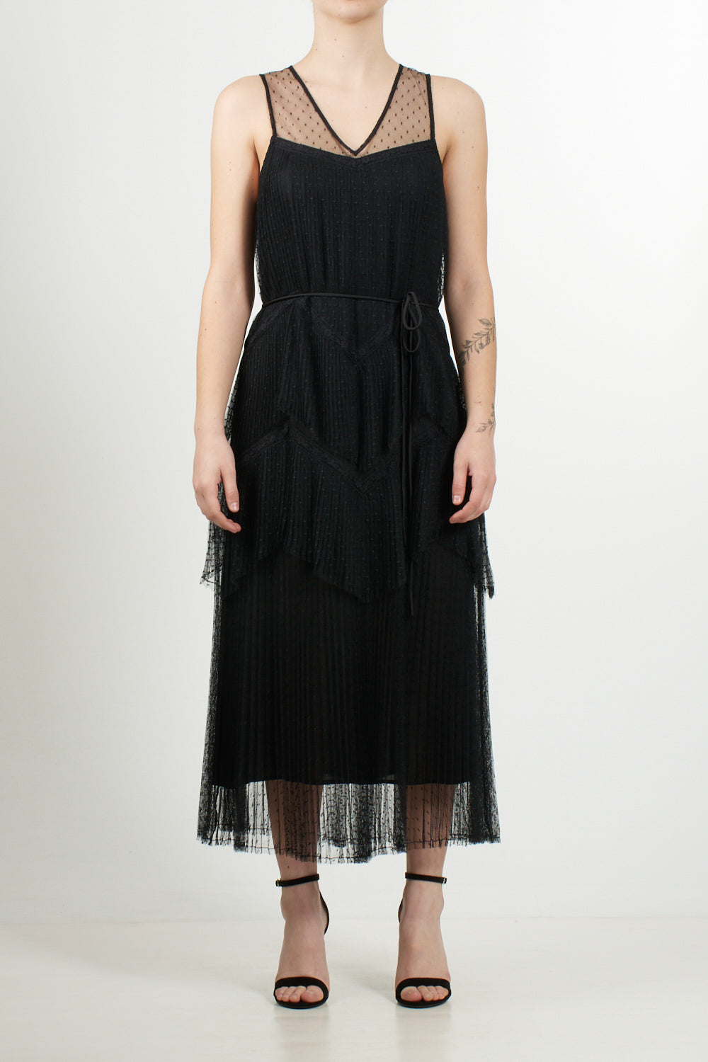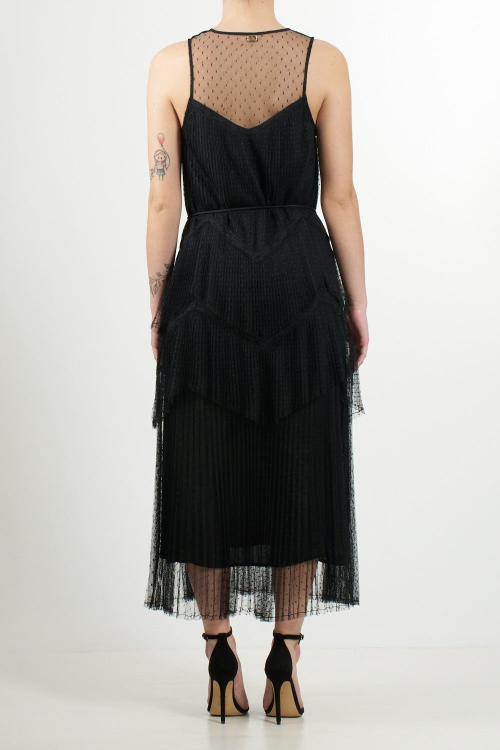 Long dress in tulle point d'esprit with pleated flounces and lace inserts, featuring a V-neck, wide shoulder straps and a transparent yoke. The design is completed by a thin belt in tone and an invisible side zip, for an elegant and feminine look.