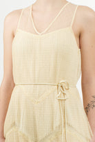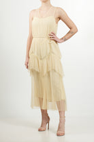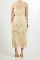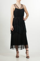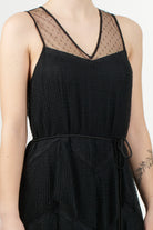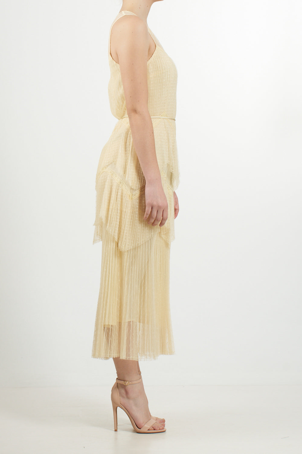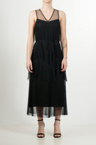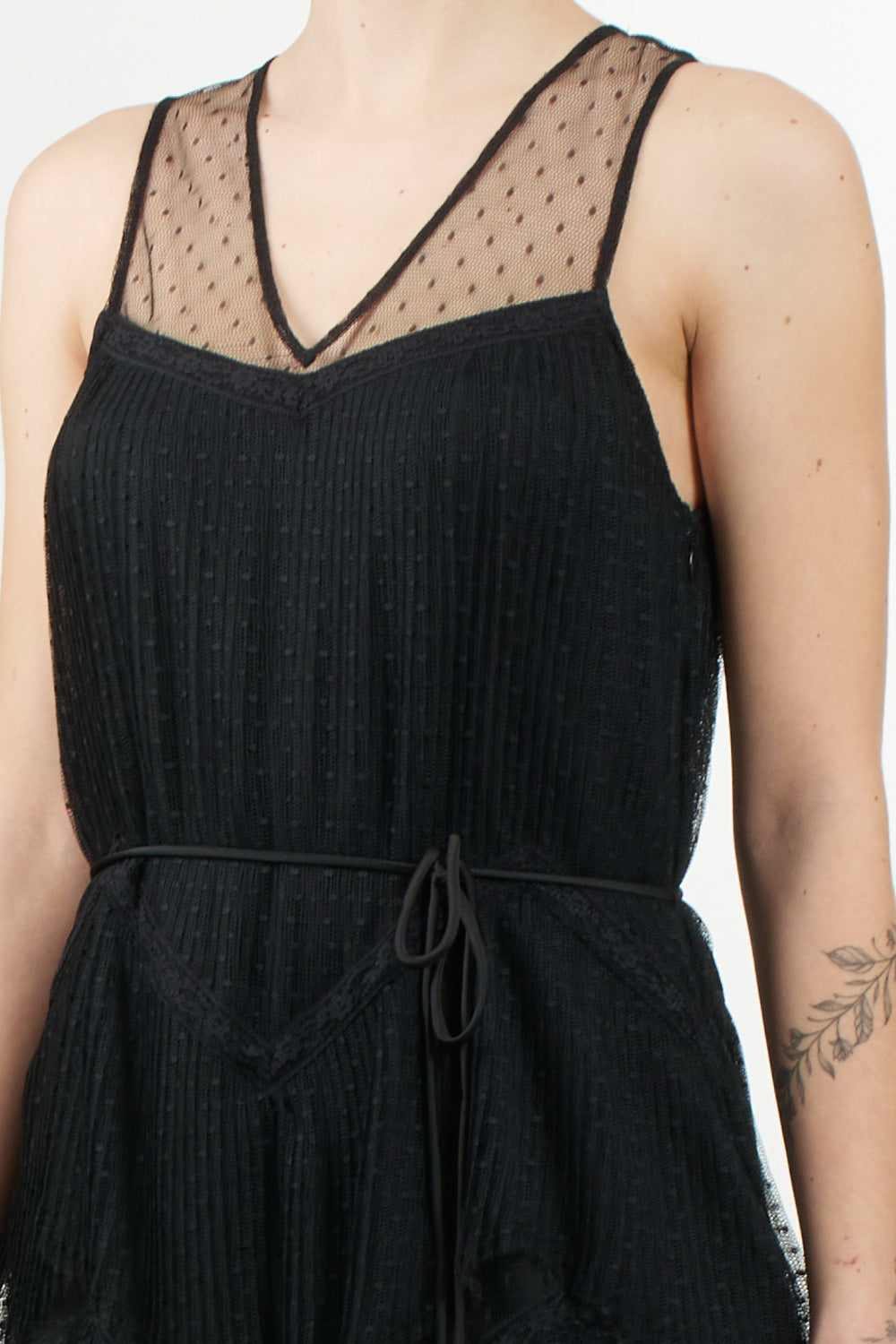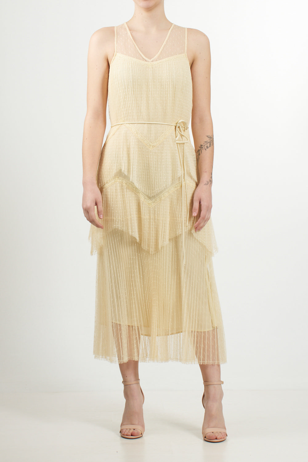 Long dress in tulle point d'esprit with pleated flounces and lace inserts, featuring a V-neck, wide shoulder straps and a transparent yoke. The design is completed by a thin belt in tone and an invisible side zip, for an elegant and feminine look.