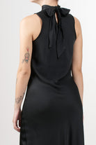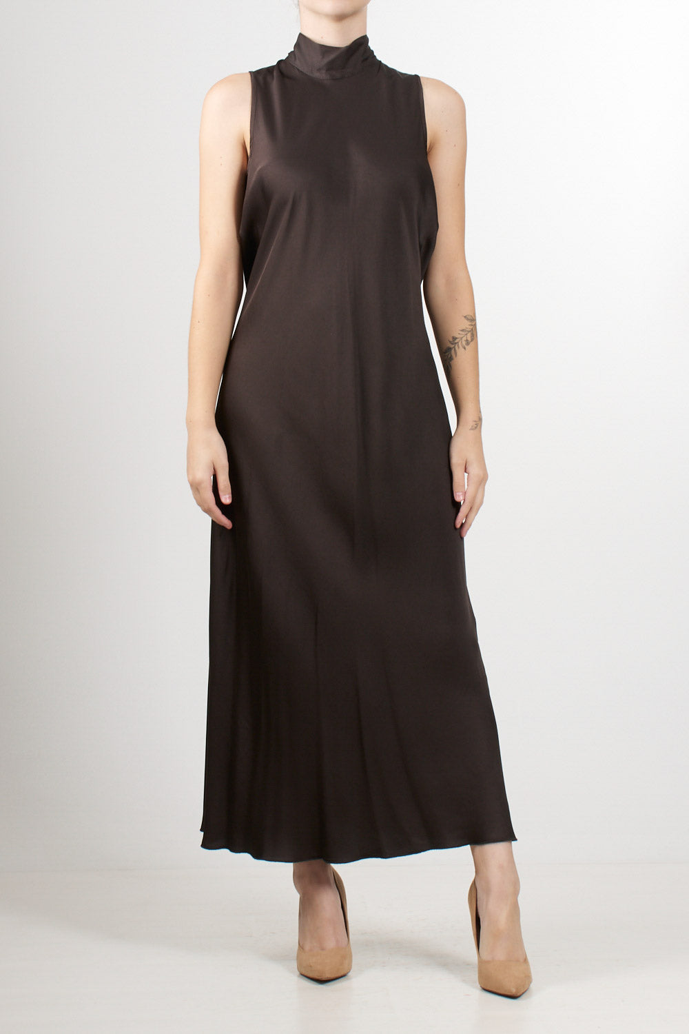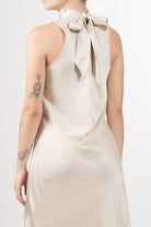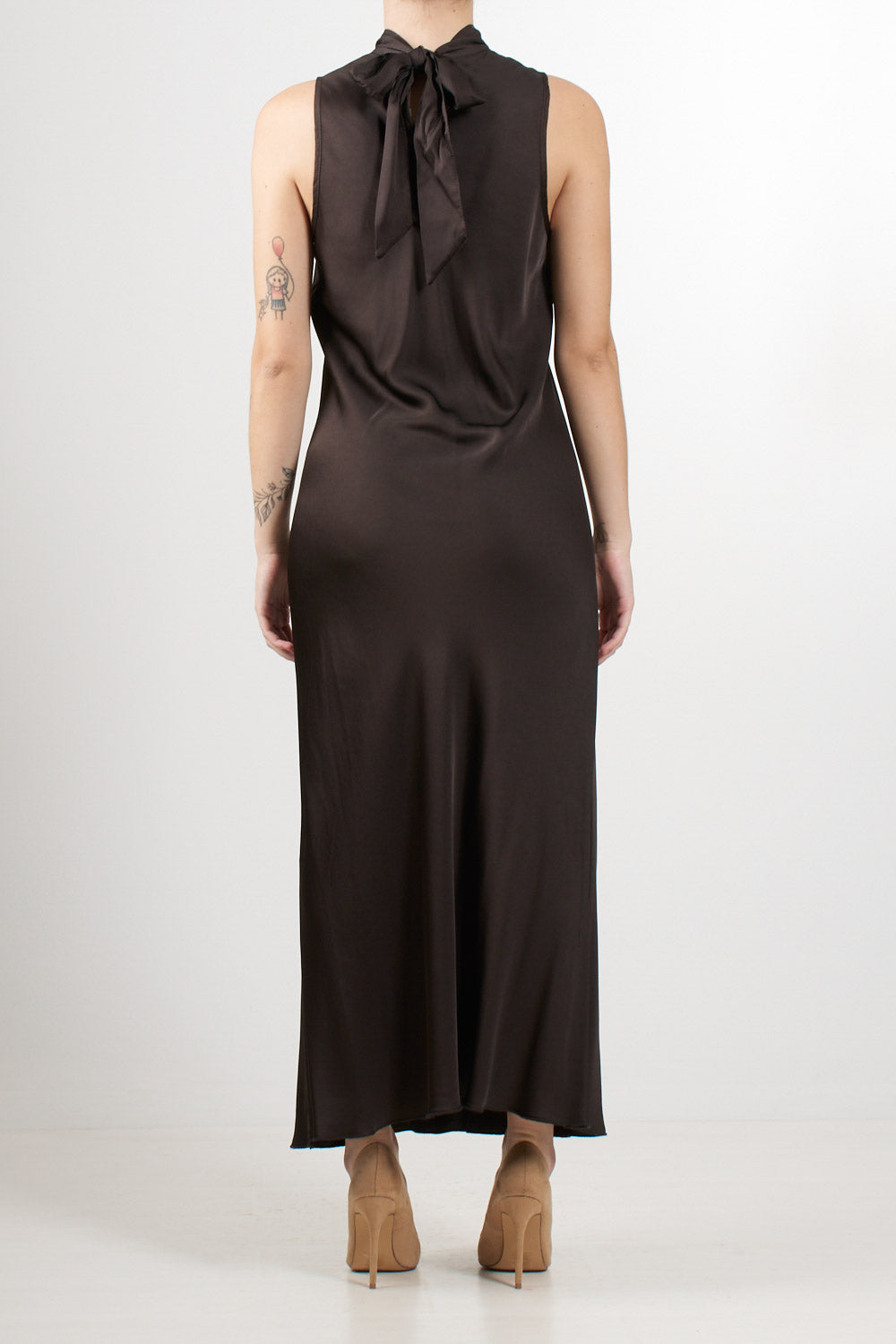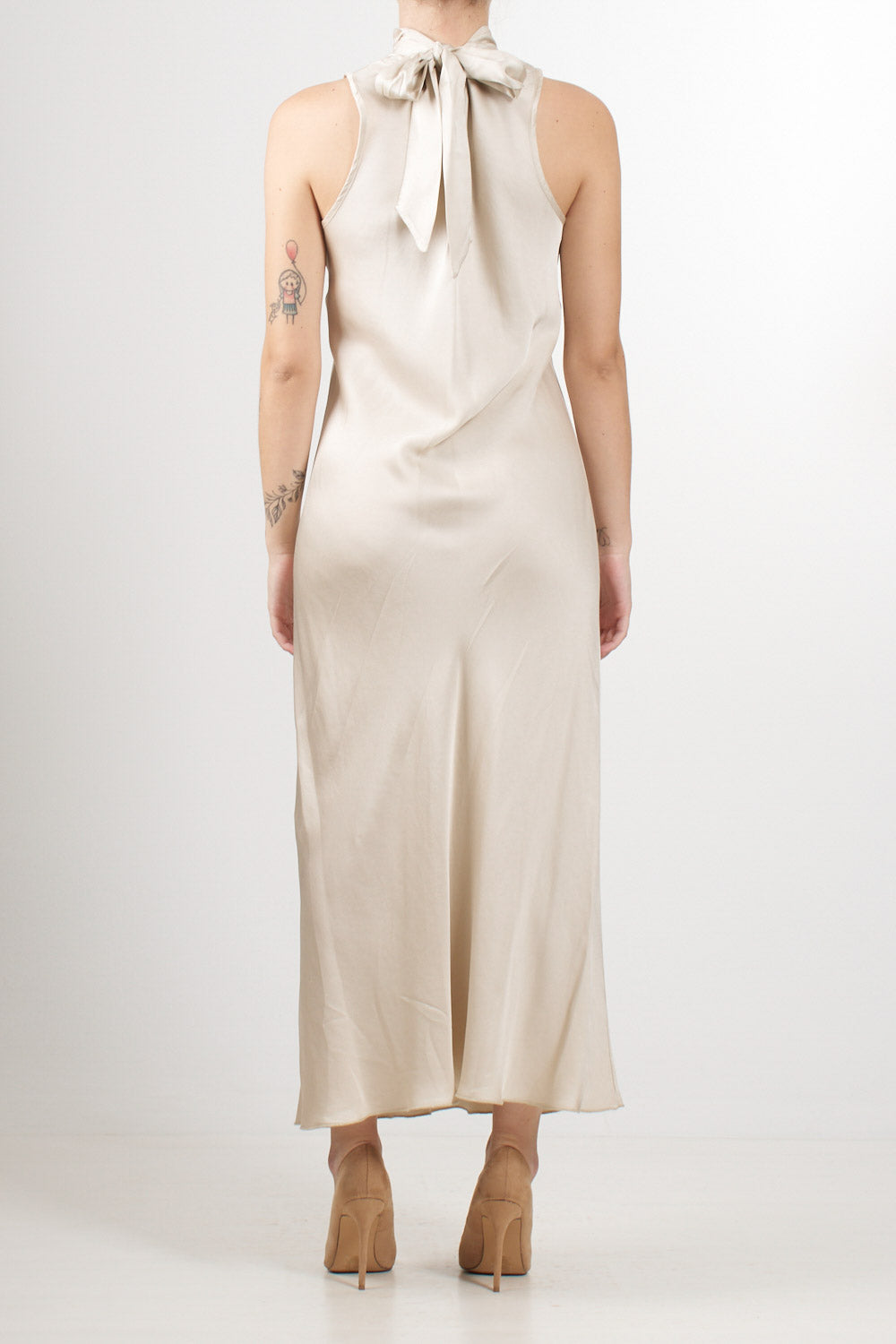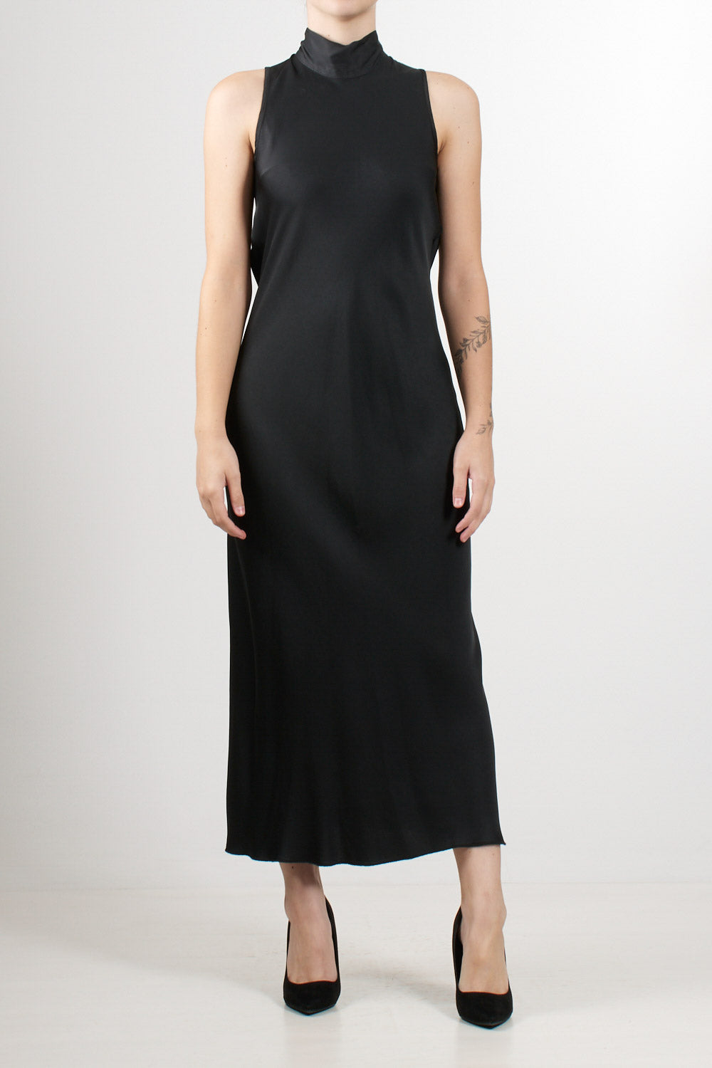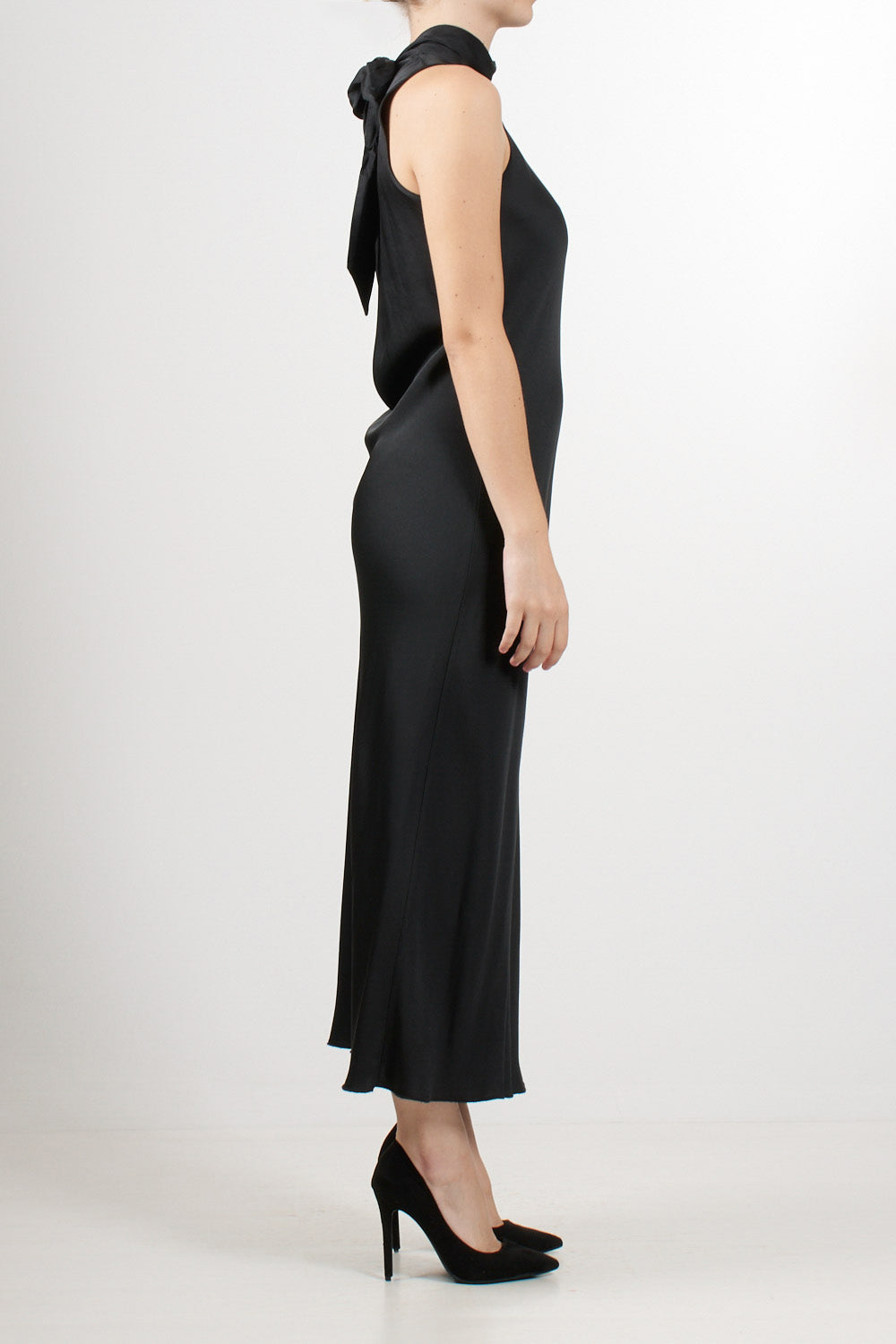 Long sleeveless dress in flowing viscose, featuring a high neck with a knotted bow detail on the back, a clean and slightly flared line that elegantly accompanies the silhouette.