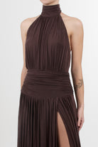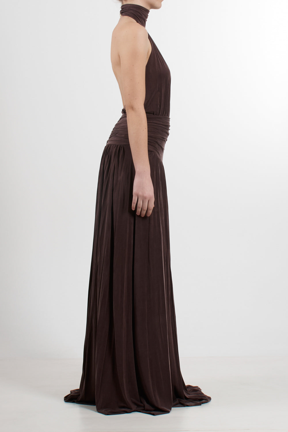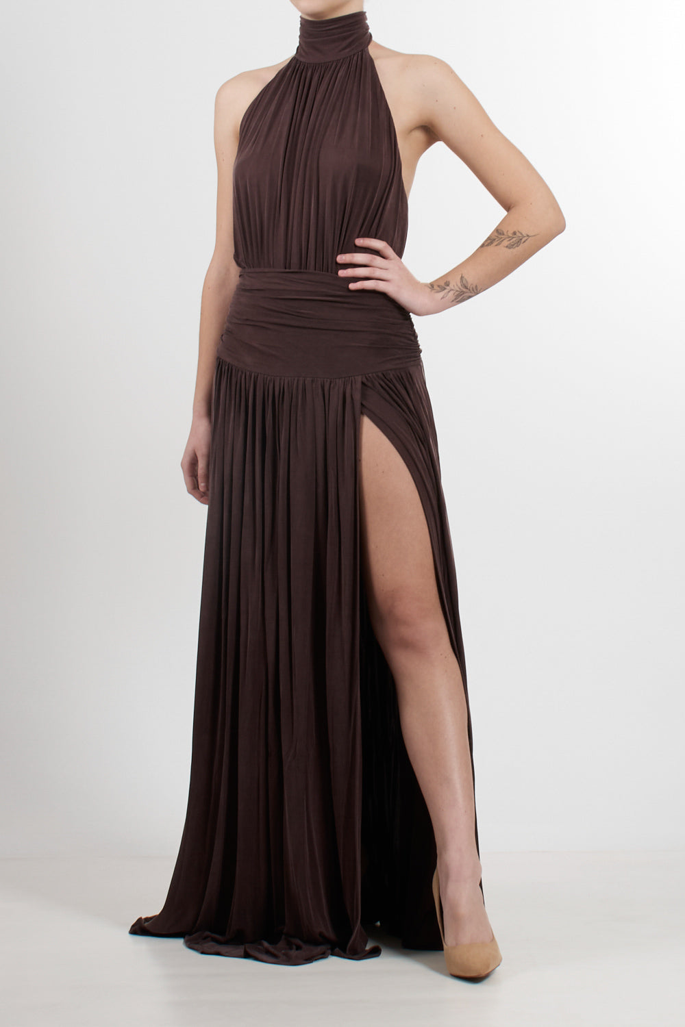 Elisabetta Franchi dress in cupro jersey, halterneck with deep back, wide side slit, back fastening with gold metal buttons and invisible zip fastening, Regular fit