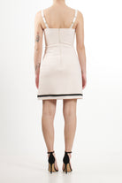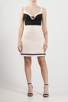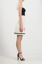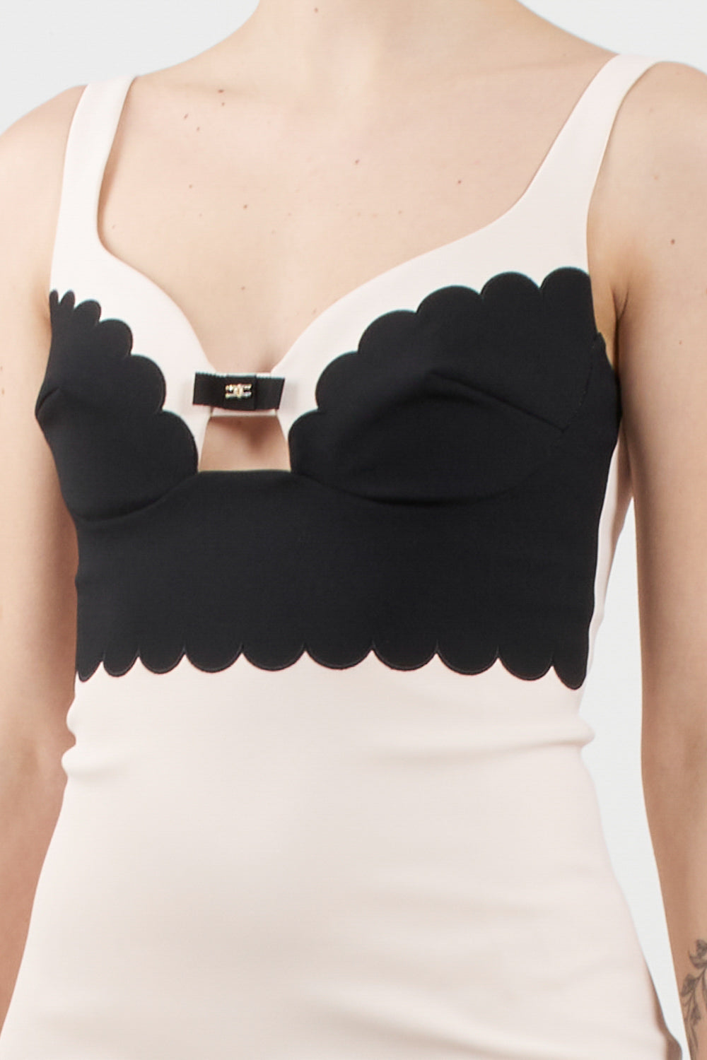 A refined and iconic bustier dress by Elisabetta Franchi. The structure elegantly enhances the silhouette, thanks to the bodice with shaped cups and scalloped edges, which give a distinctive graphic effect. The grosgrain bow detail with gold plaque adds a sophisticated accent. Perfect for elegant events and evening cocktails.