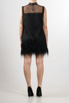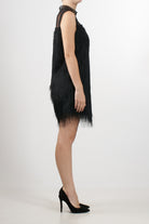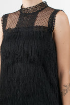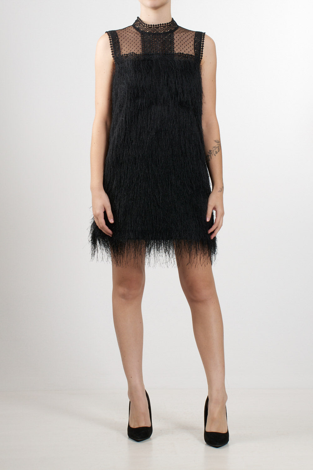 Short dress by Twinset made of fringed fabric with a plumetis tulle yoke, embellished with lace trim along the edges. The sleeveless design with a round neck and keyhole back creates a refined and feminine effect.