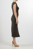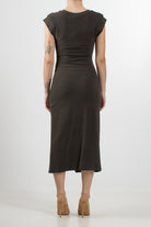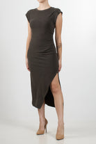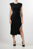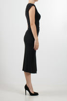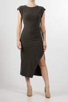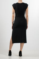 The Eleh dress features a simple, fitted silhouette, short sleeves, and a round neckline. The midi skirt with side slit adds a feminine detail that slims the figure, making it suitable for both casual and evening wear.
