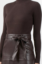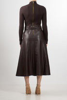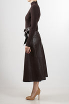 Twinset flared midi dress with a ribbed stretch viscose blend top, a turtleneck, and long sleeves. The bottom is made of a leather-look fabric with exposed stitching and a matching belt that accentuates the waist. Zip closure at the back.