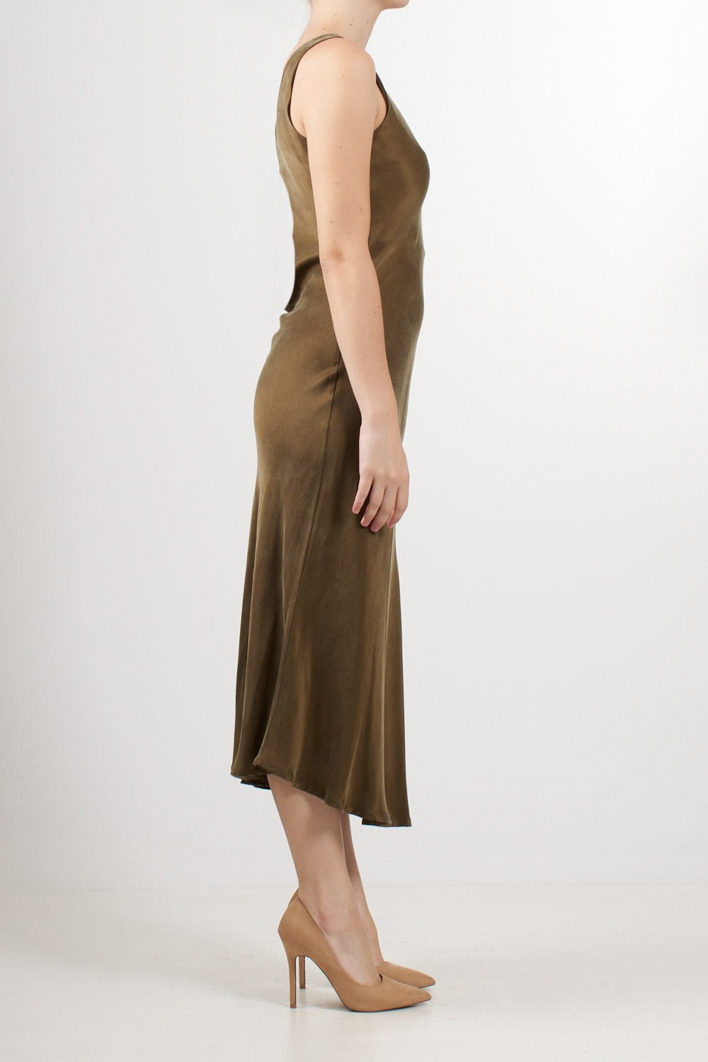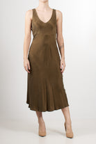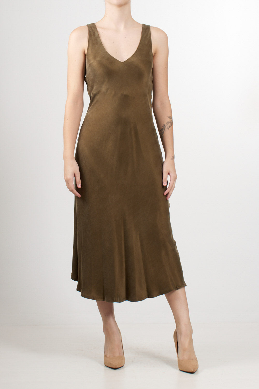 Sleeveless cupro midi dress with a V-neck and flared hem. The flowing cut naturally flatters the figure, while the flowing, soft finish makes it perfect for both elegant occasions and more casual looks.