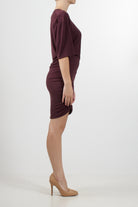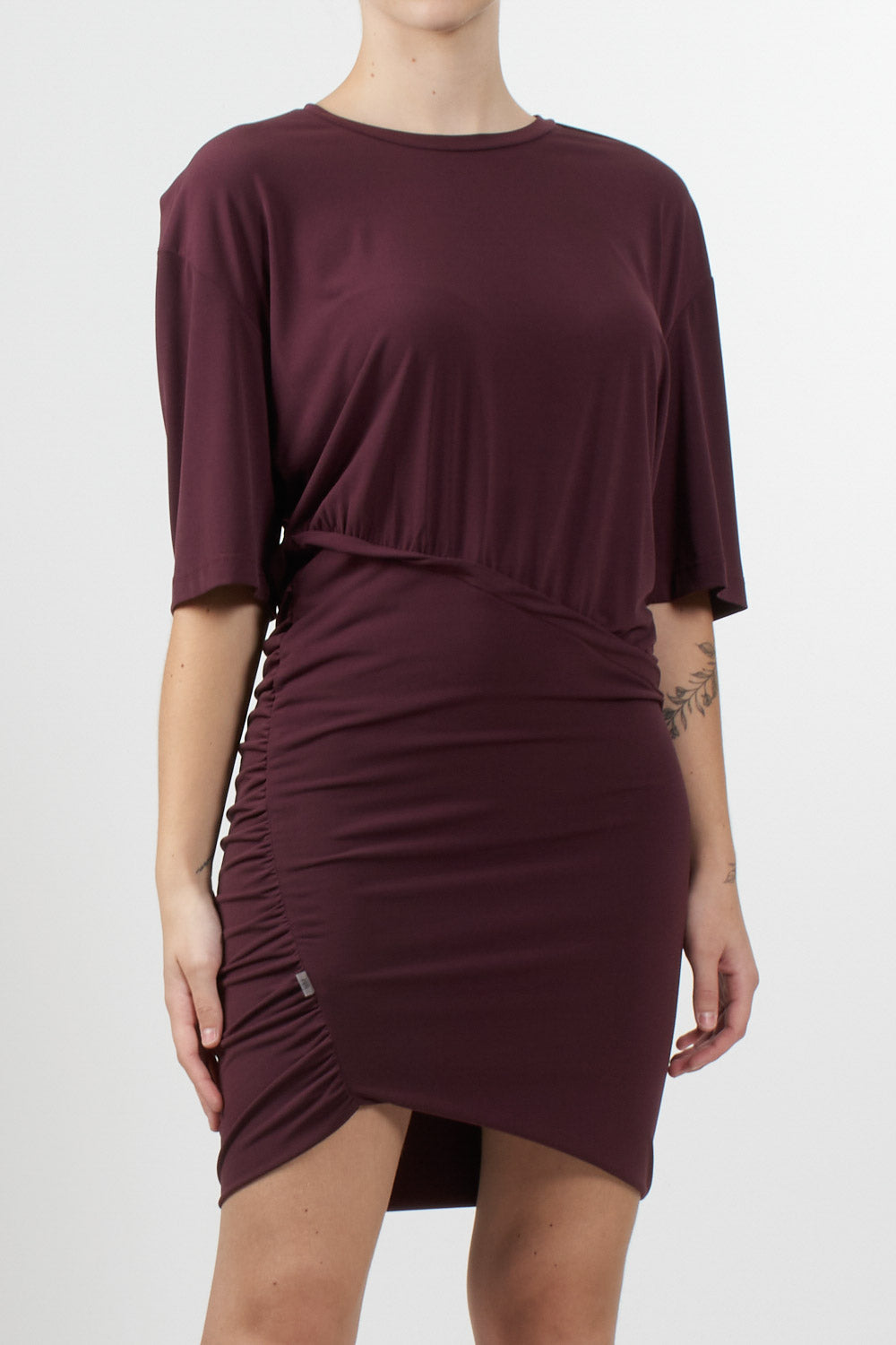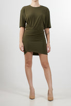 Jijil short dress with wide sleeves and a round neckline. The design features a loose fit at the top and a fitted skirt with side draping that creates an asymmetrical effect. A contemporary design, perfect for versatile looks from day to night.