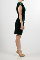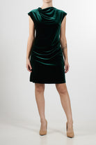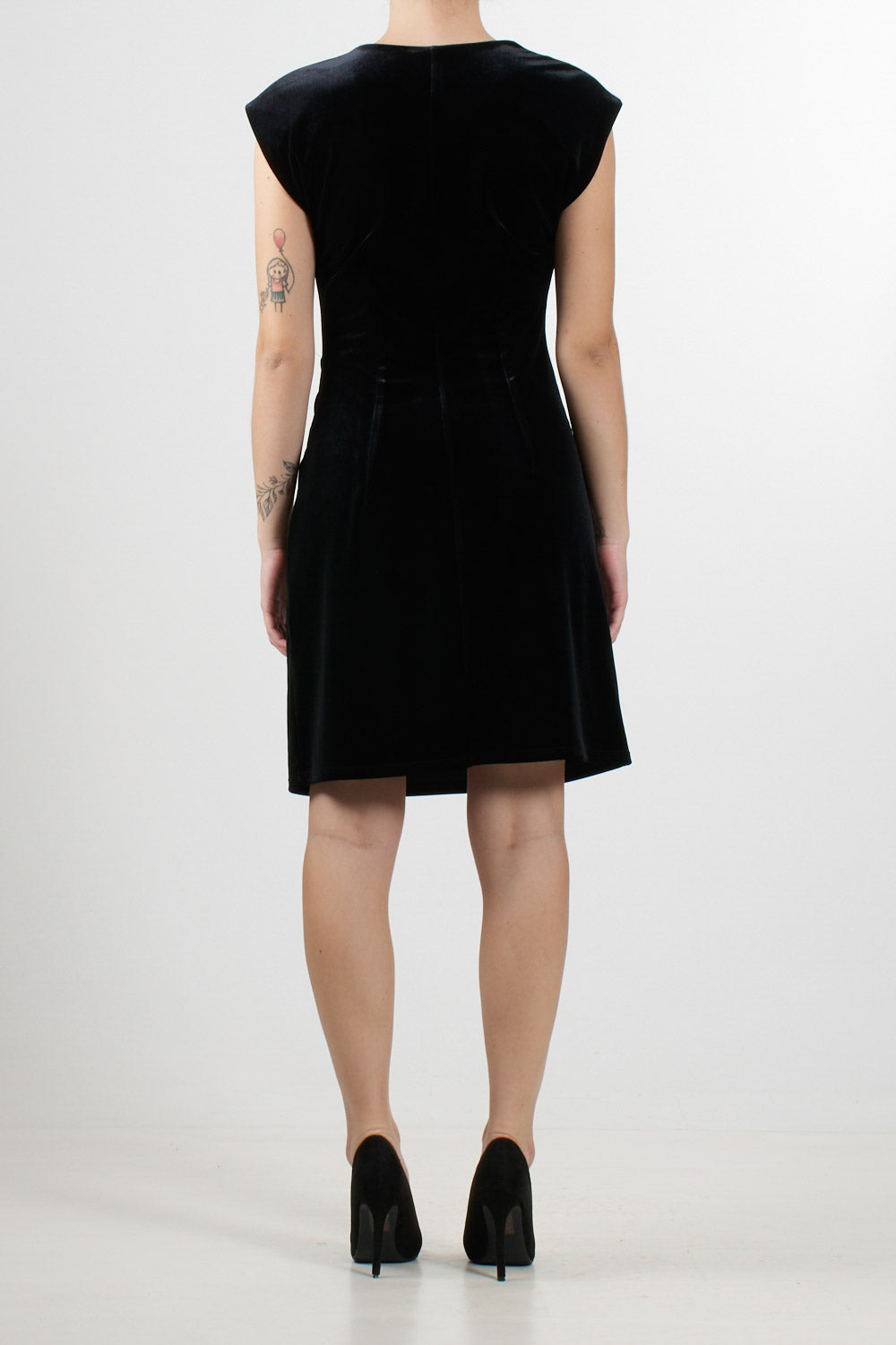 This short sleeveless dress by Tensione In is crafted from soft velvet and features a soft, draped neckline and side pleats that flatter the silhouette. The simple yet refined design makes it perfect for elegant occasions or special evenings.