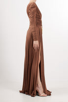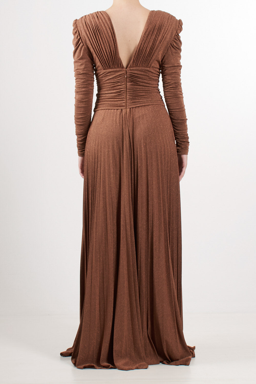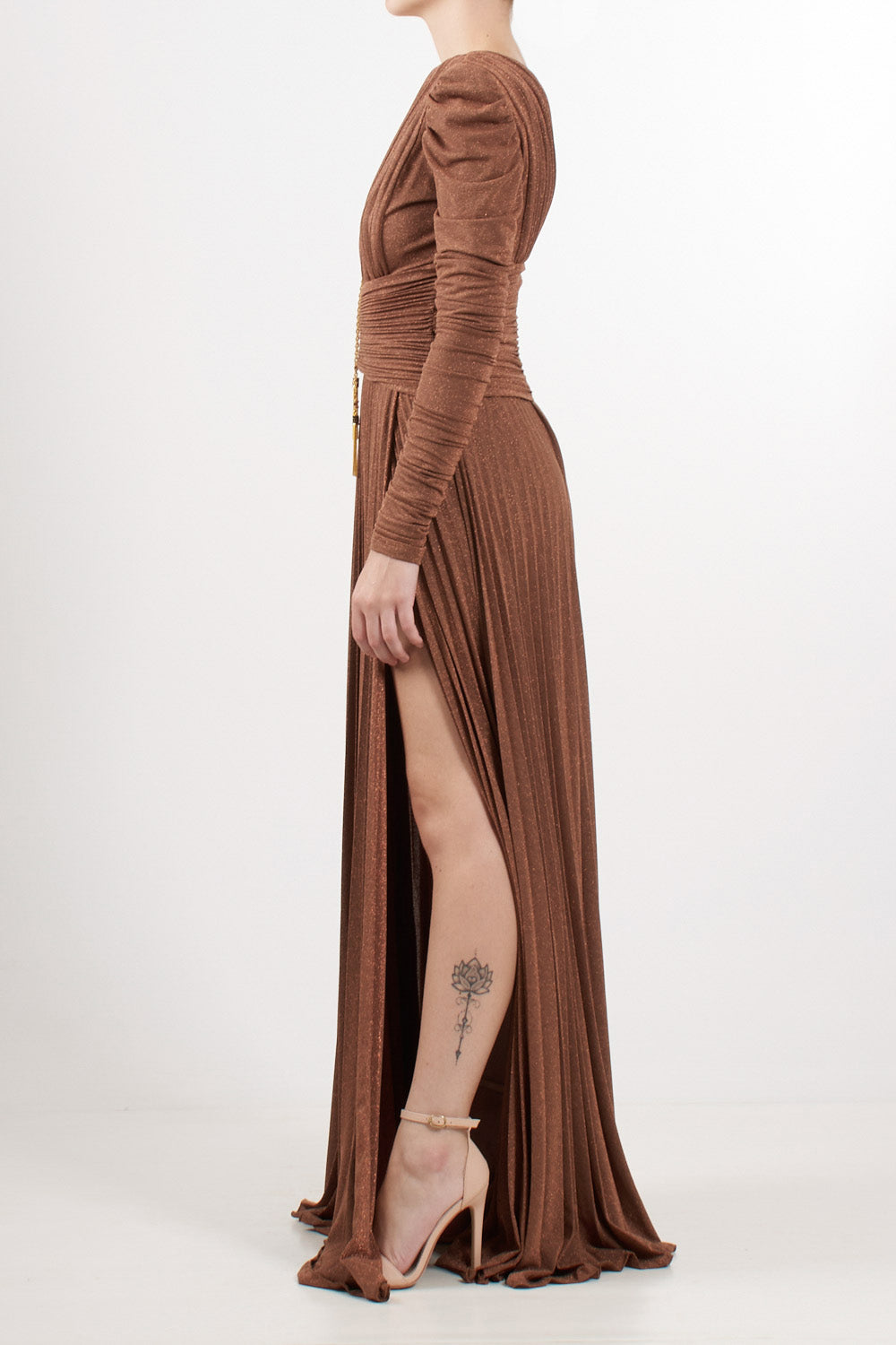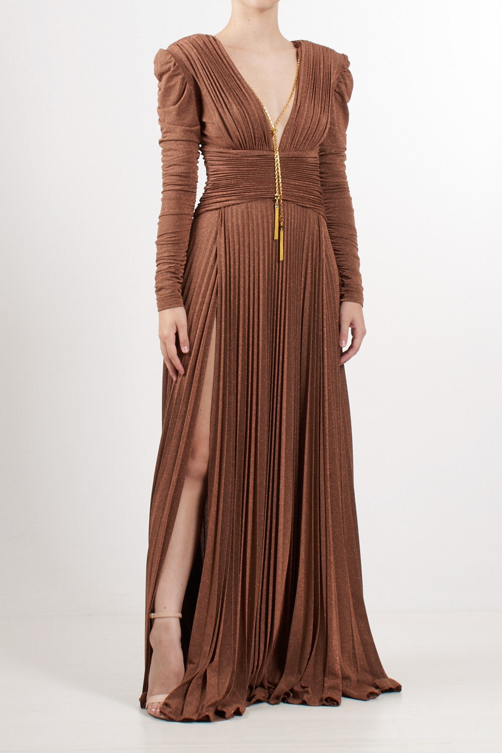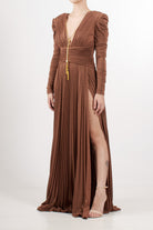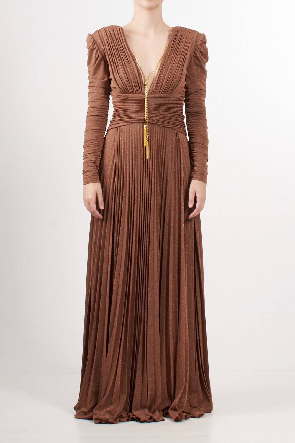 Long evening dress in shiny lurex jersey, slim fit, deep V-neck and structured shoulders with long gathered sleeves, pleated skirt with double side slits, drapes highlight the waist, removable gold metal jewel accessory with logo and tassels.