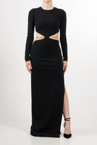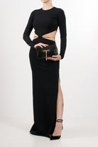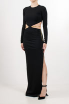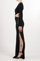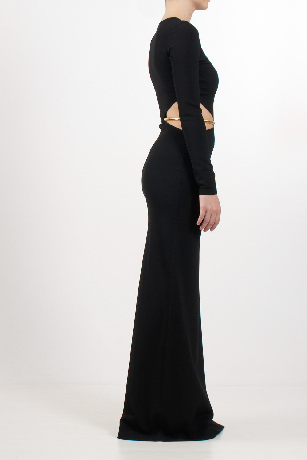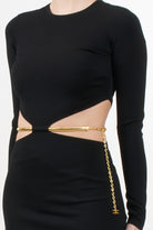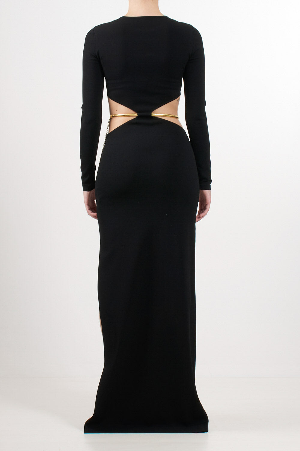 Long knitted dress with a fitted cut, long sleeves and a crew neck, stands out for its deep side cut-outs that leave the hips exposed, connected by a snake-effect jewel belt in gold metal, side slit adds further elegance to the silhouette.