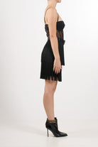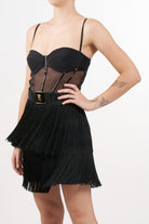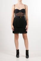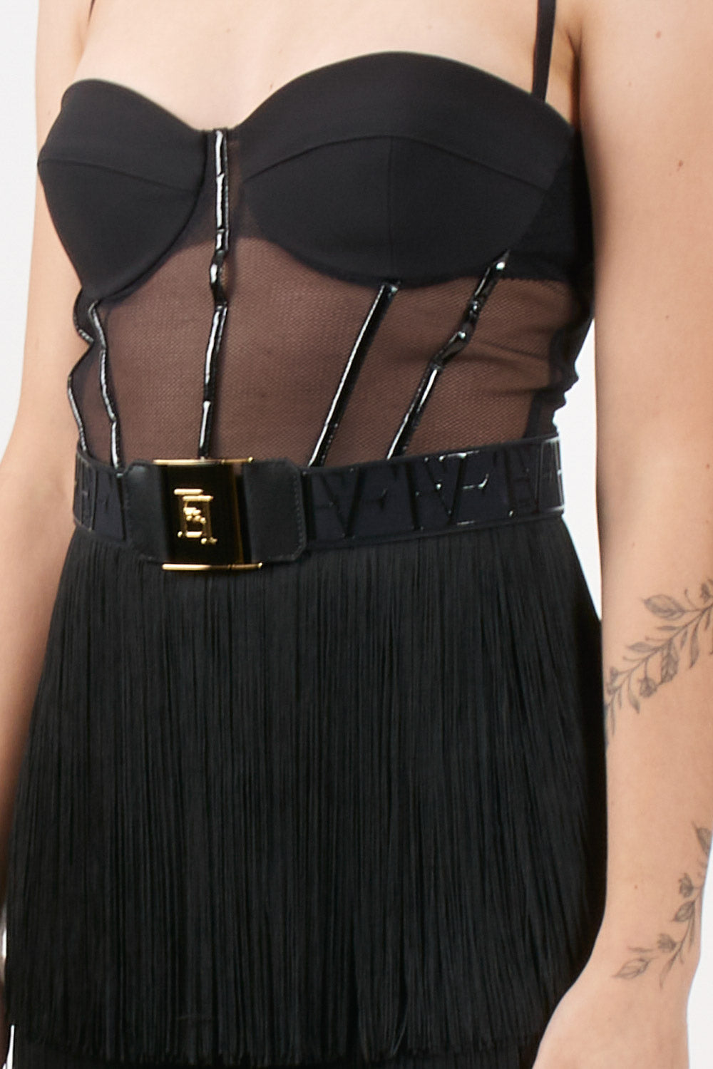 Mini dress featuring a bustier with tulle inserts and corset-effect boning. The bottom is embellished with a double fringed ruffle that adds movement and lightness to the look. Completed with a gold logo belt, it's perfect for a glamorous evening.