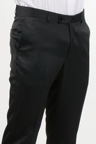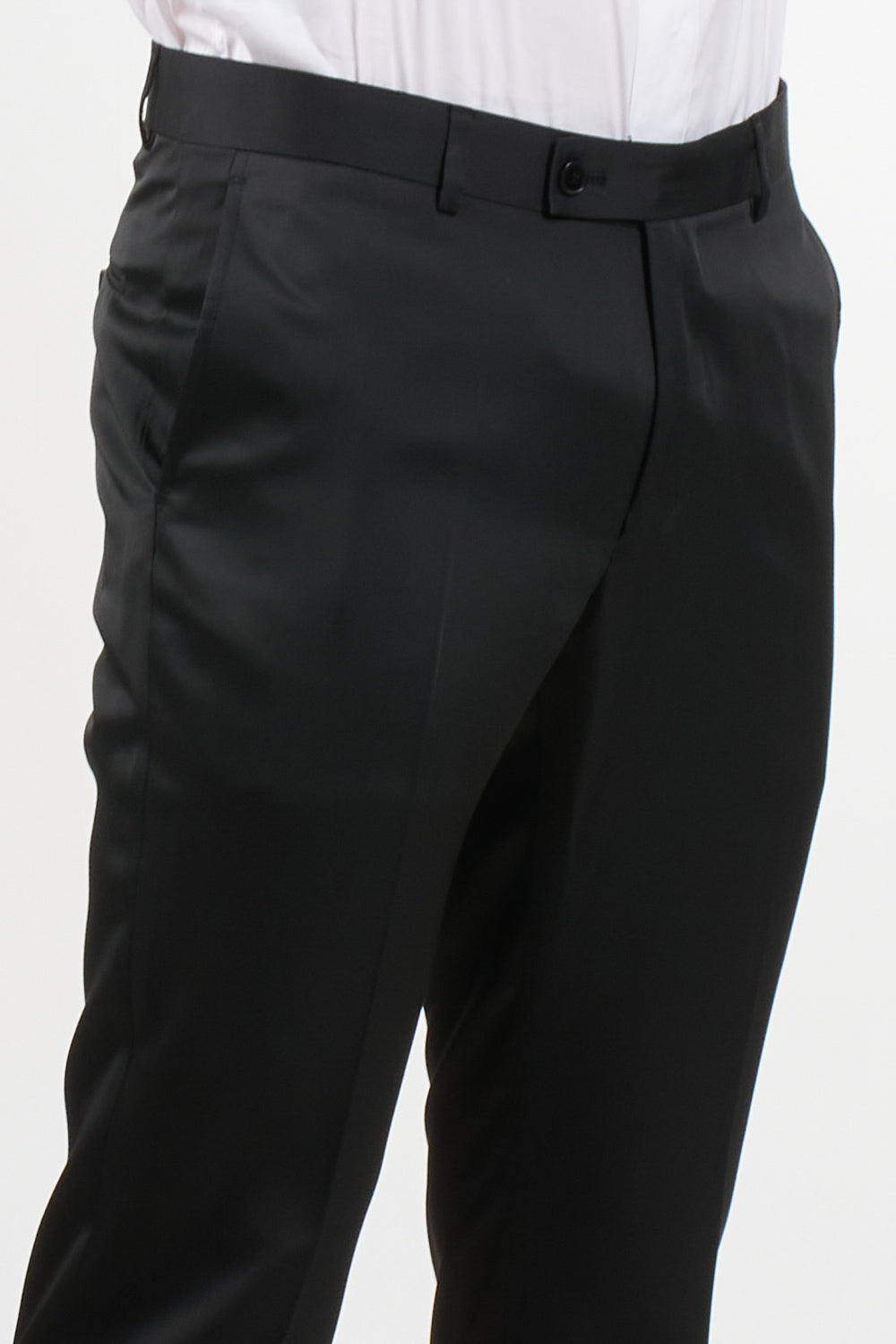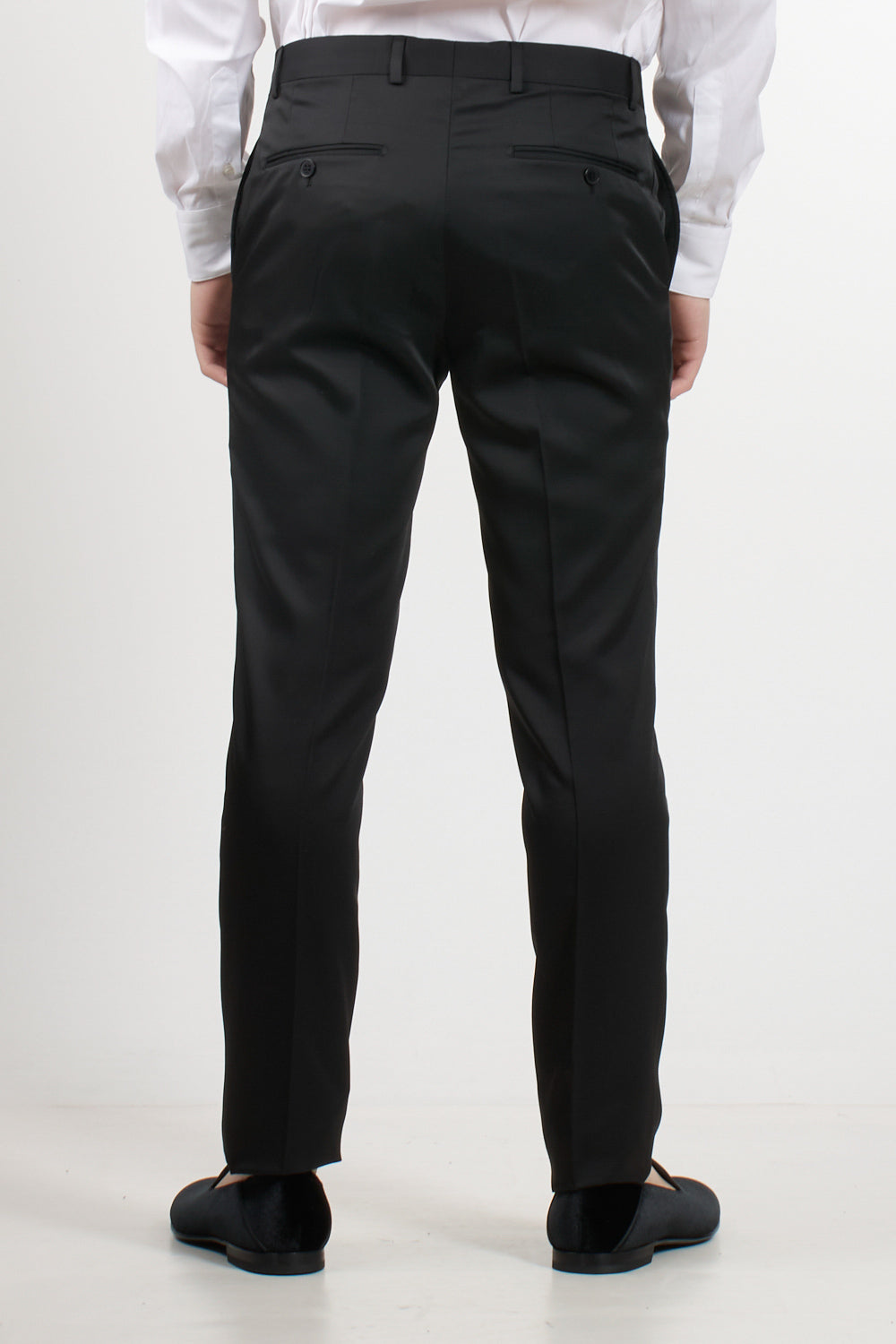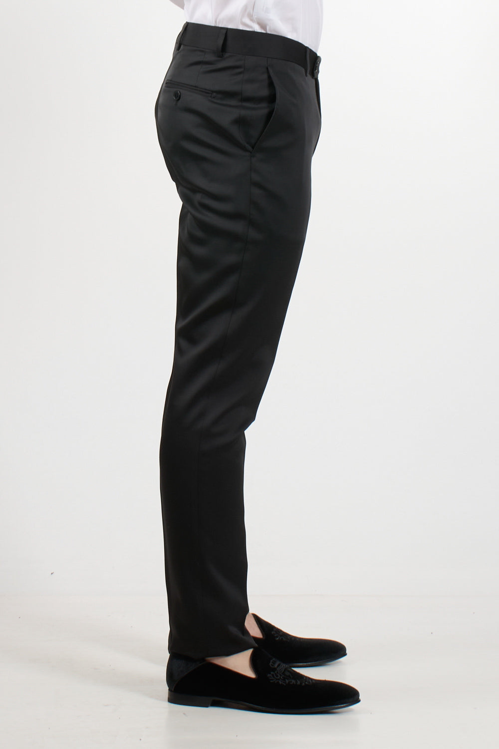 Trousers: slim fit, belt loops, side button fastening, side pockets, welt pockets on the back