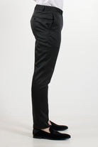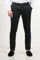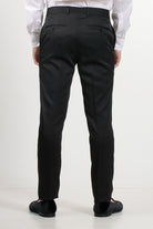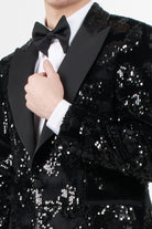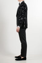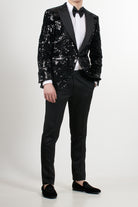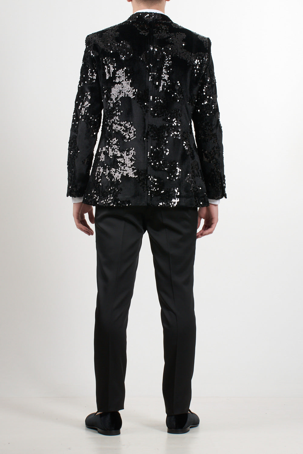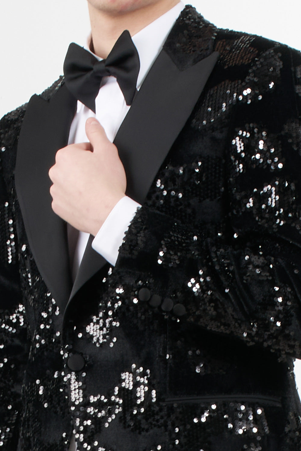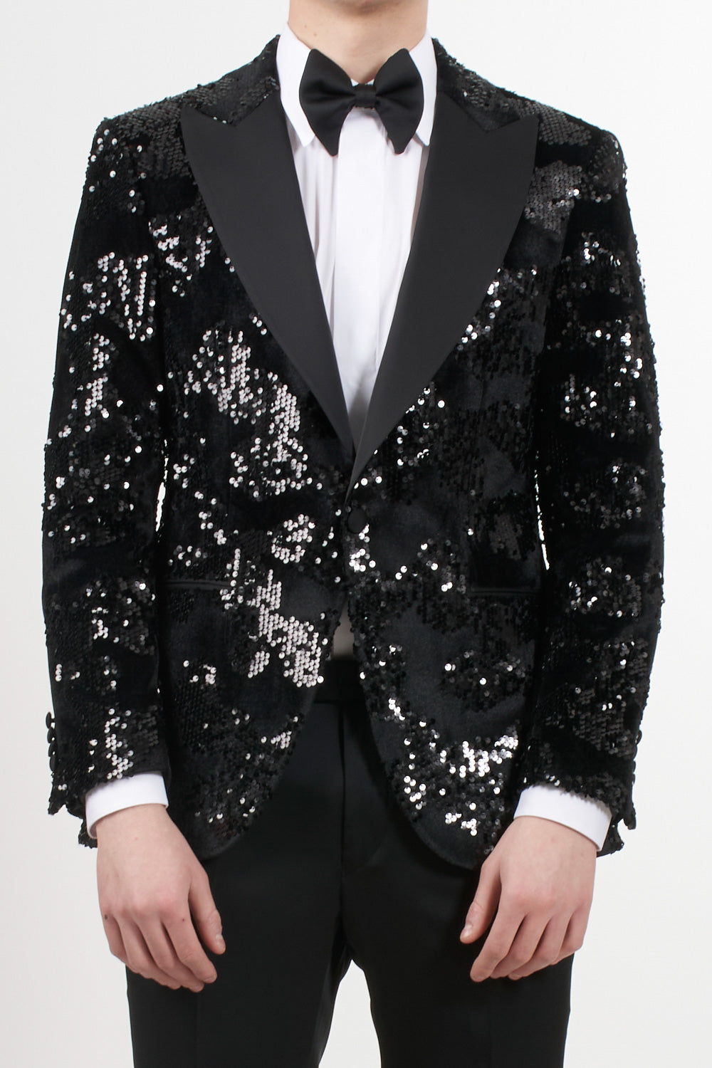 Jacket: Black tuxedo with black satin peak lapels, button fastening, jet pocket and black satin buttons on the cuffs, jacket embellished with sequins that give a sparkling effect and bow tie