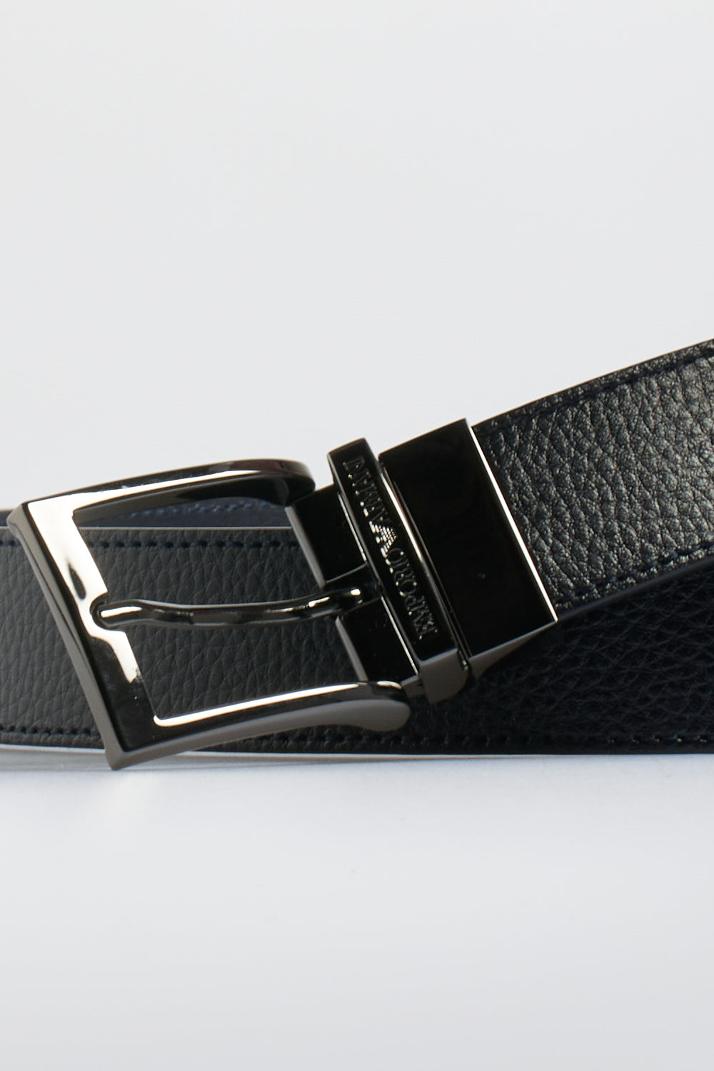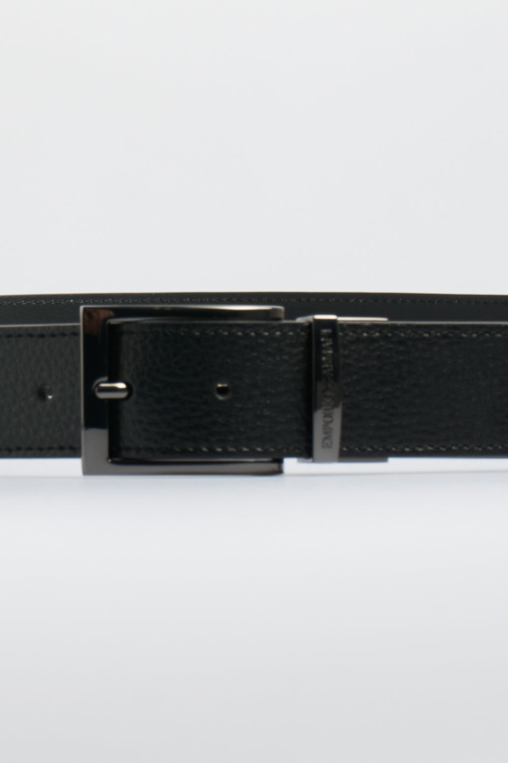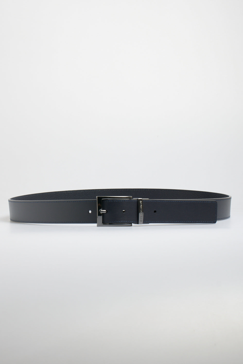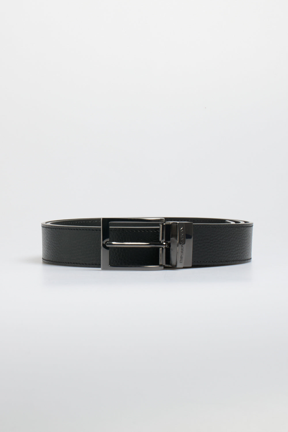 An essential accessory with a refined character, signed by Emporio Armani. This hammered leather belt stands out for its shiny metal buckle with engraved logo, perfect for completing elegant and casual outfits with style.