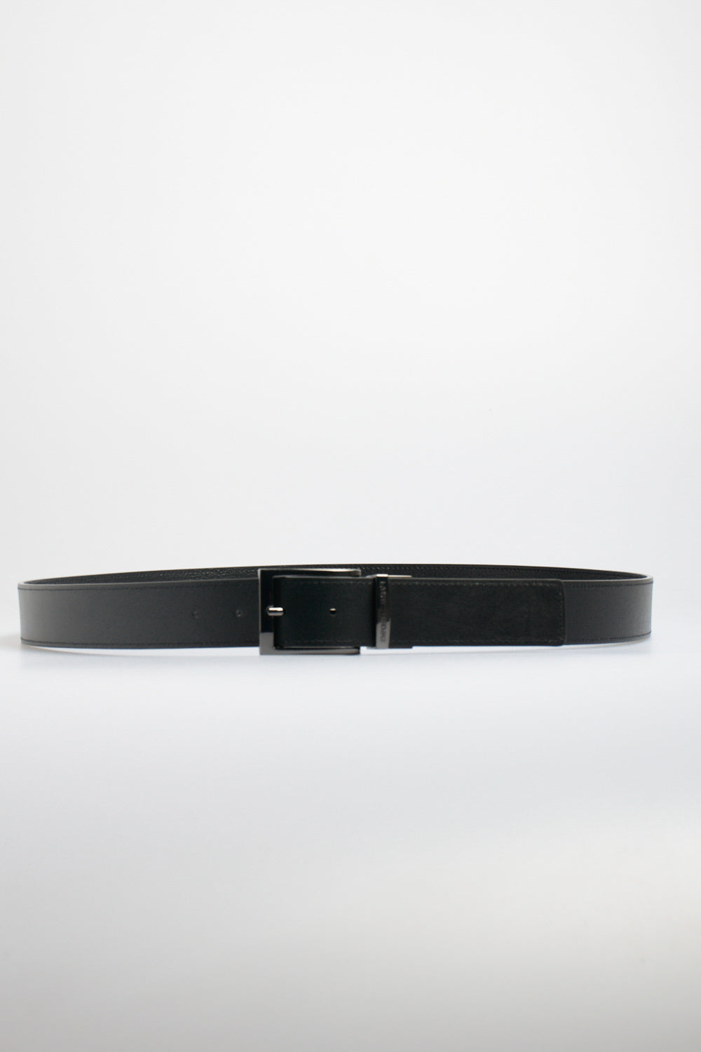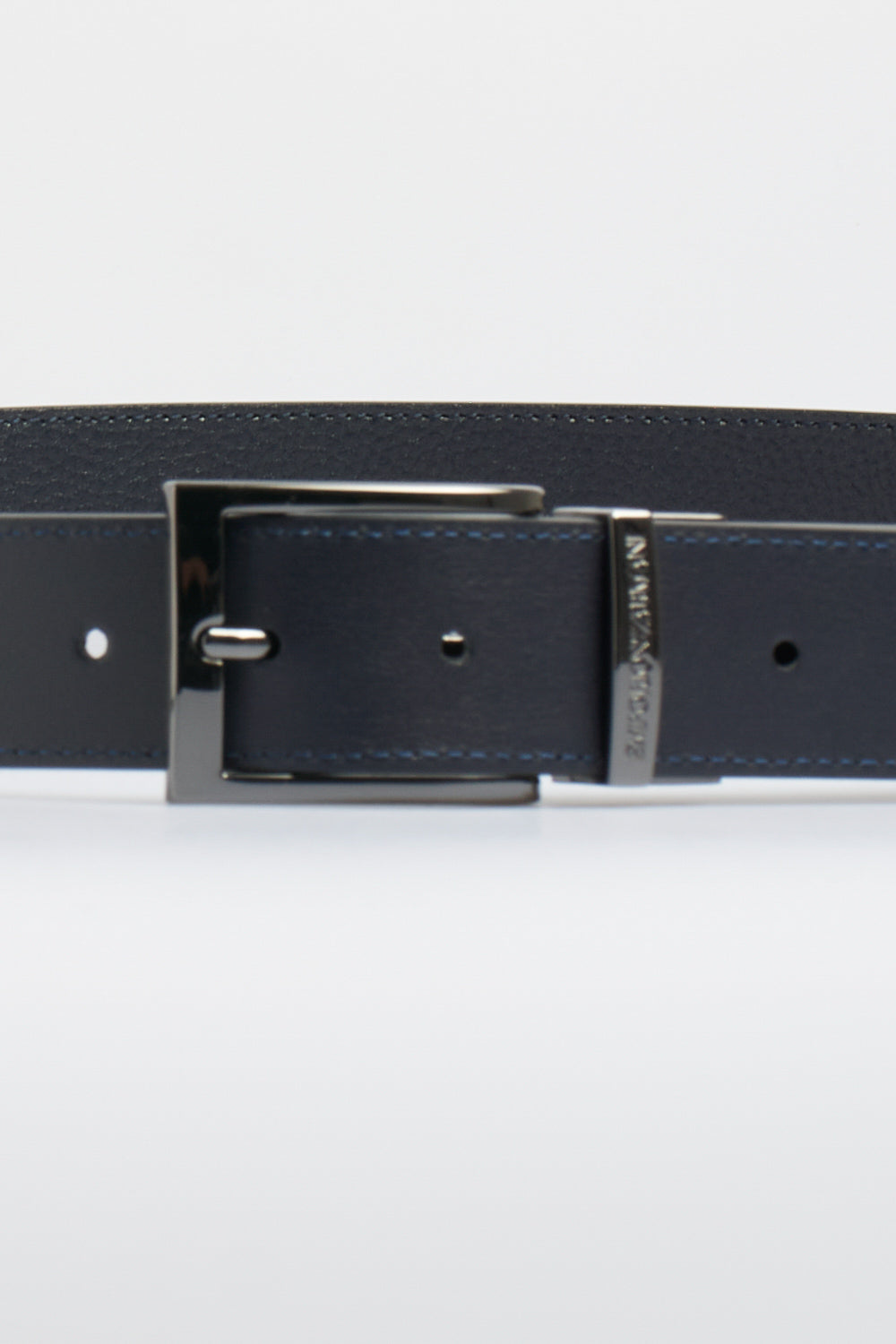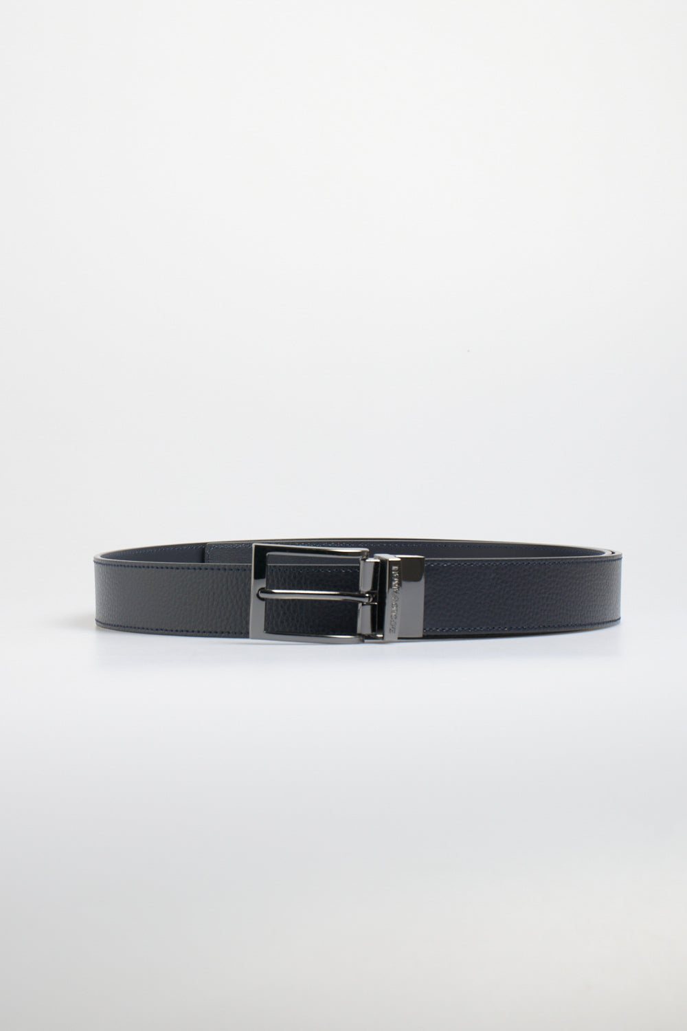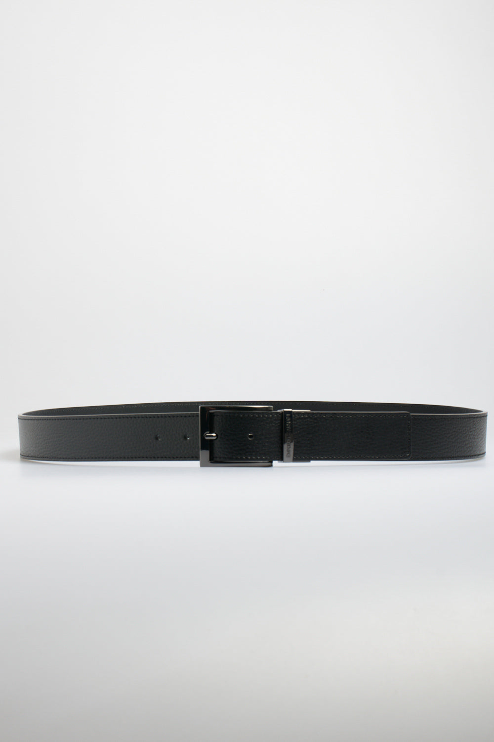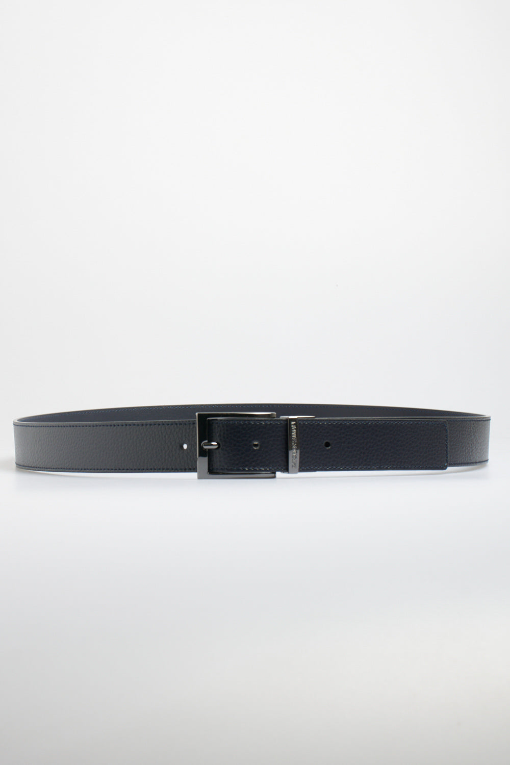 An essential accessory with a refined character, signed by Emporio Armani. This hammered leather belt stands out for its shiny metal buckle with engraved logo, perfect for completing elegant and casual outfits with style.