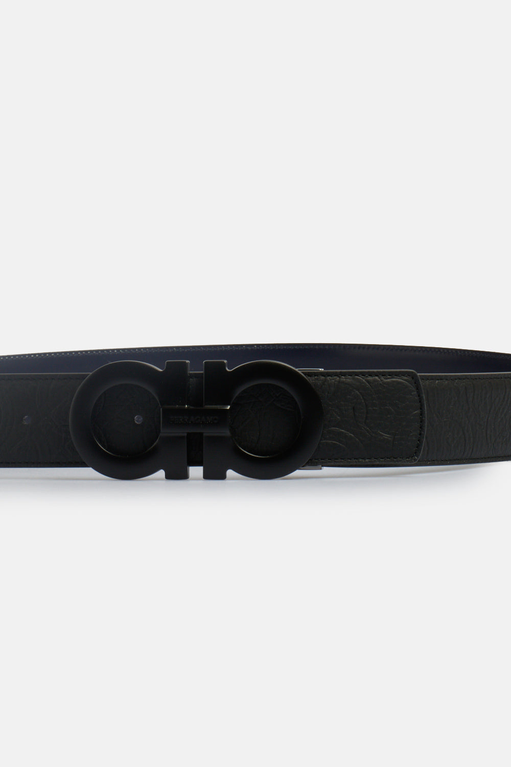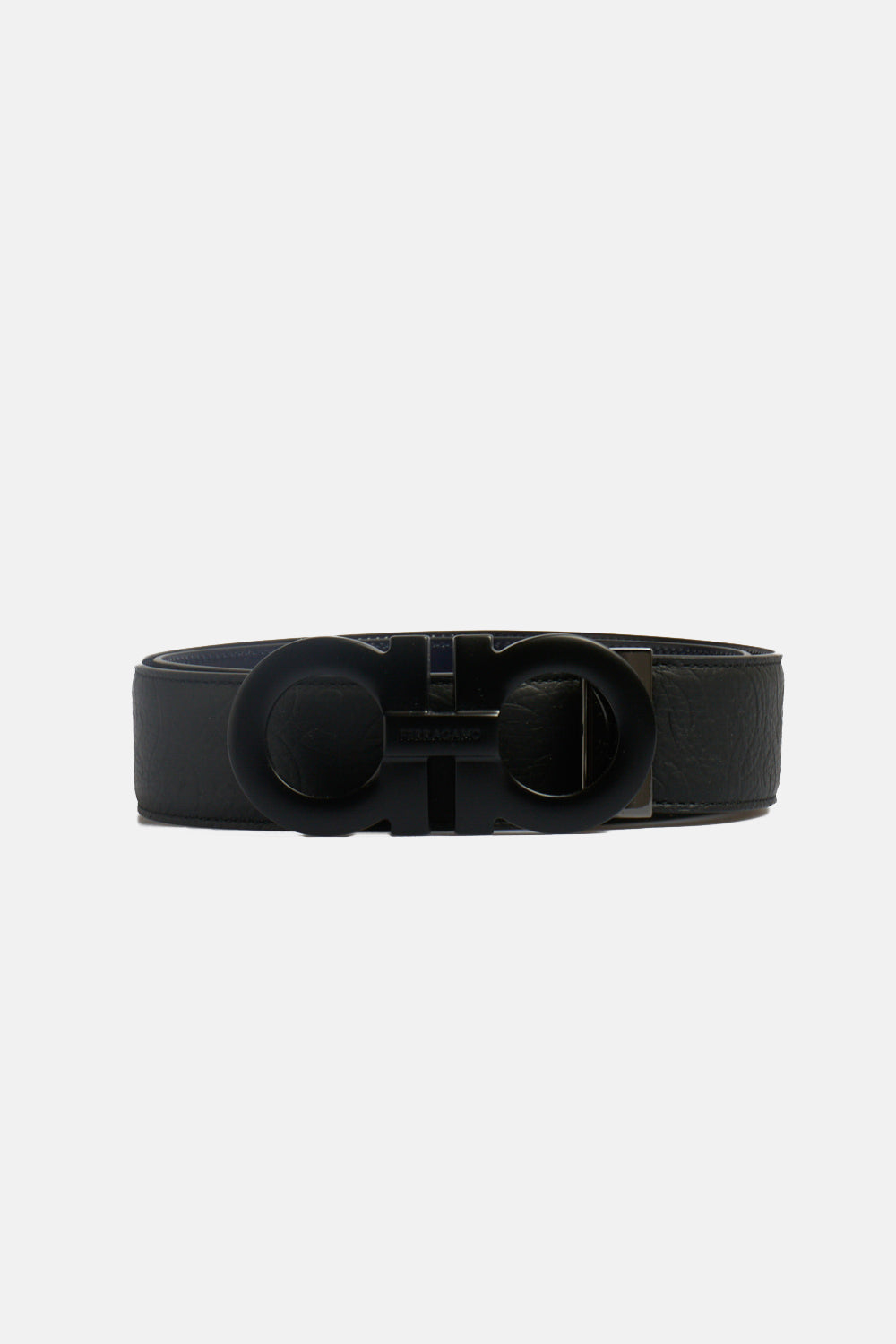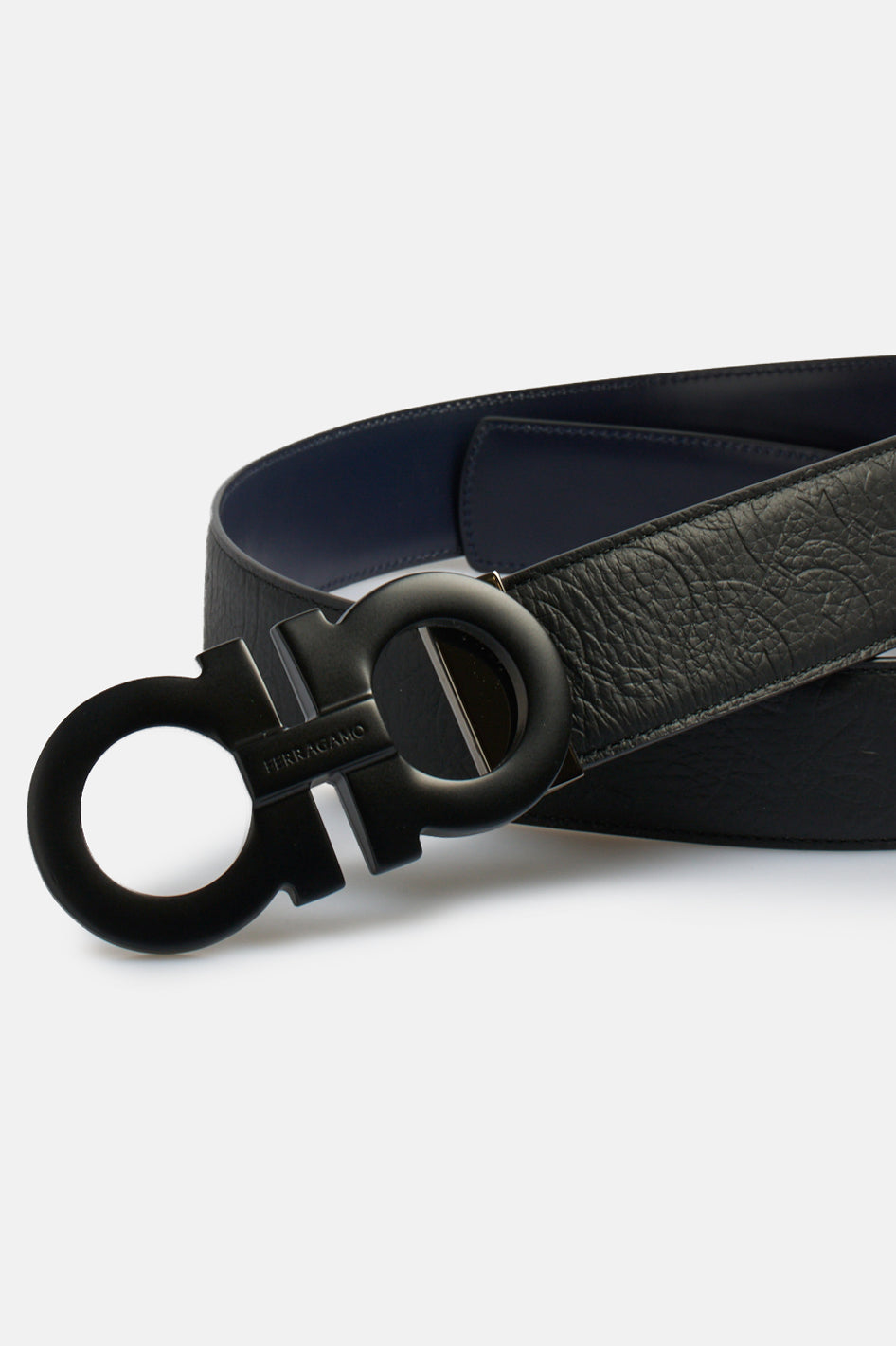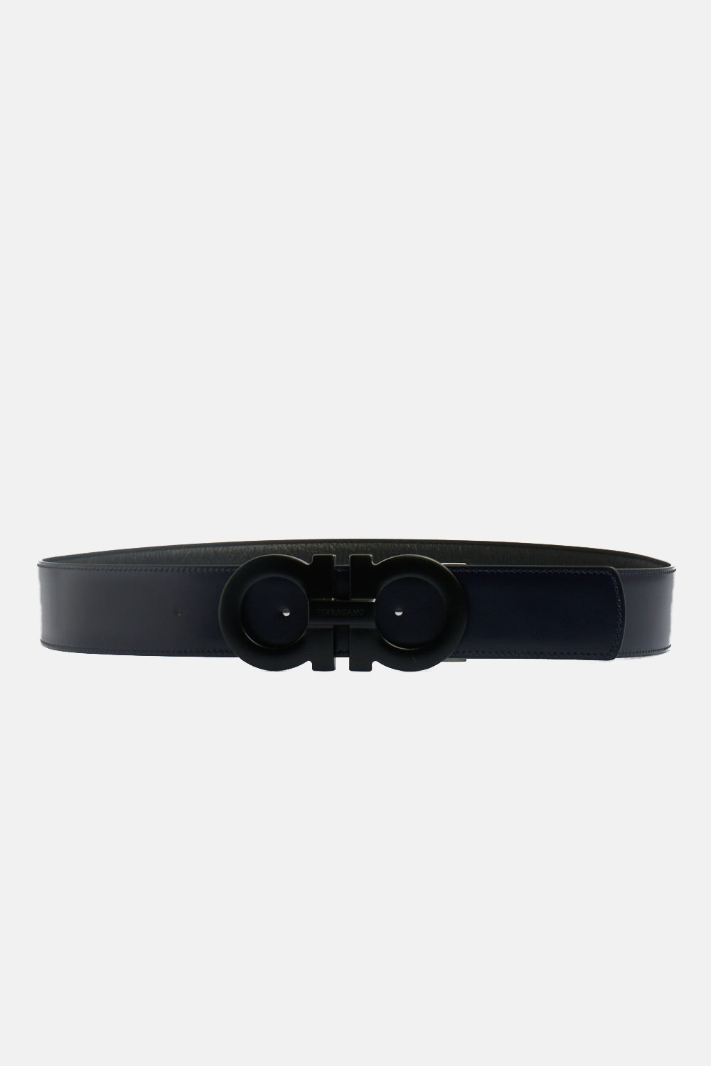 Ferragamo belt features one side in smooth blue calfskin and one in hammered black leather, logo buckle.