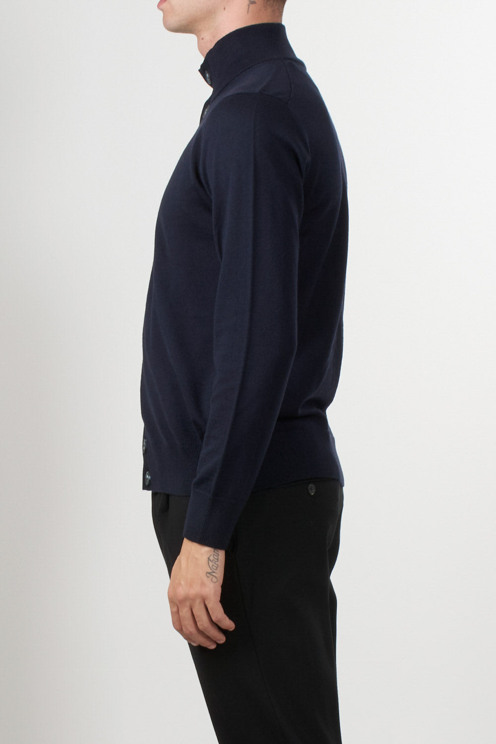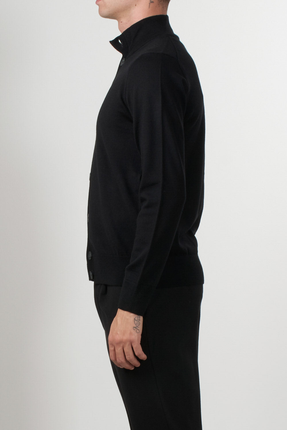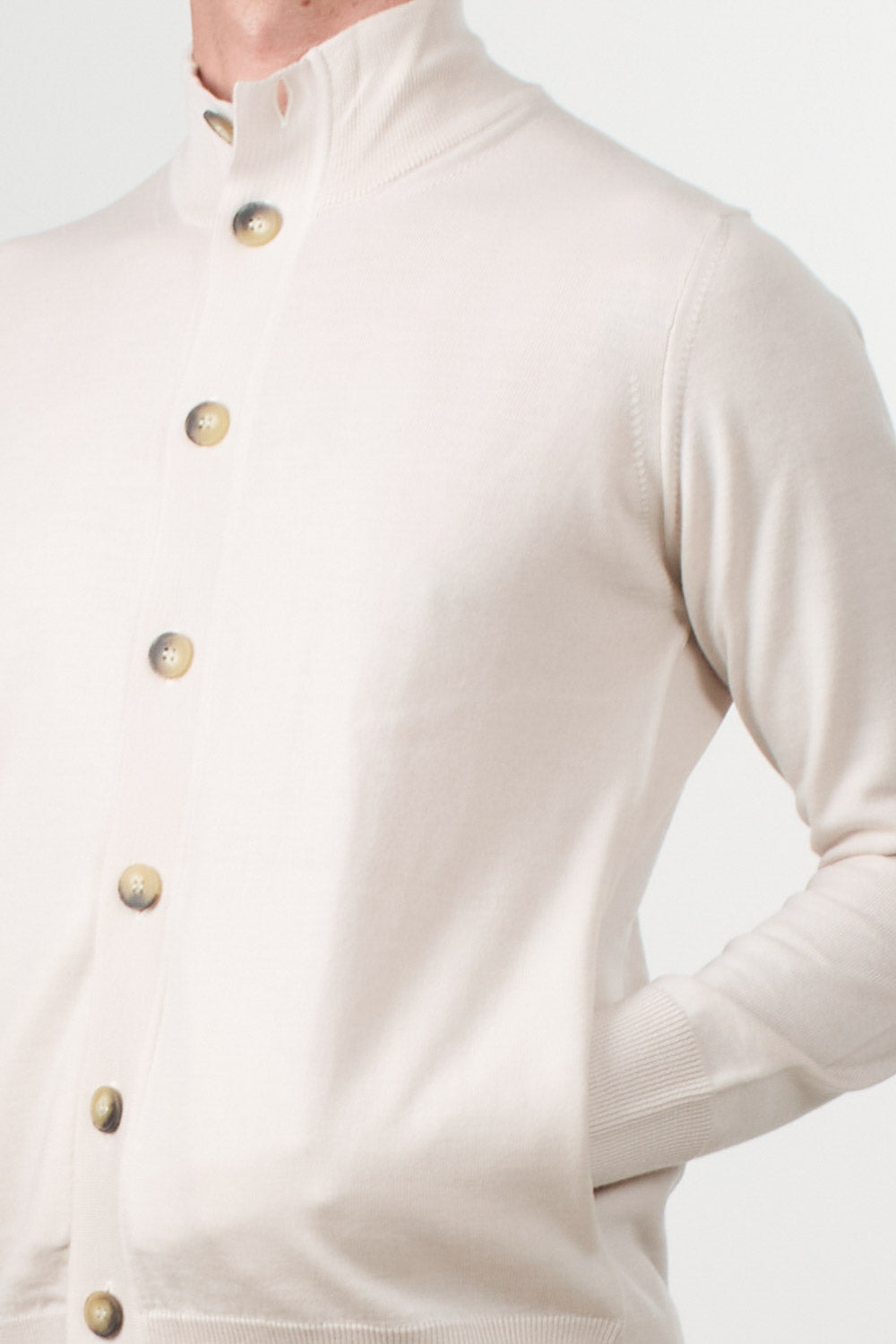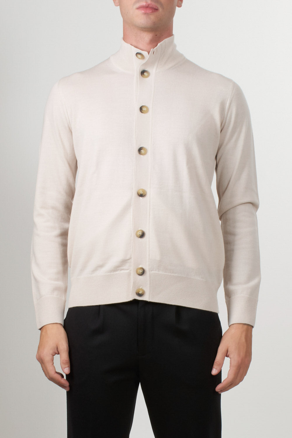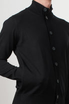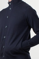 Alpha Studio pure merino wool cardigan, featuring a button-front closure and a high neck, perfect for tackling colder days in style and comfort. Finished with ribbed cuffs and hem for a clean, contemporary fit.