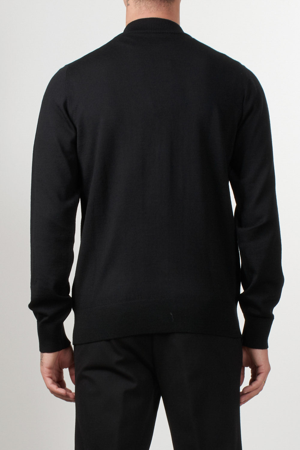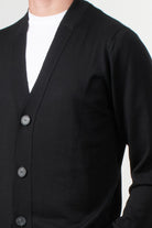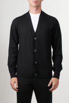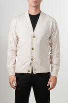Alpha Studio cardigan made of 100% merino wool, featuring a front button closure, a V-neck, and ribbed trims at the hem and cuffs. A simple and refined design, this piece is ideal for completing casual or formal outfits with a touch of contemporary elegance.