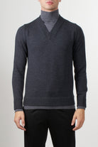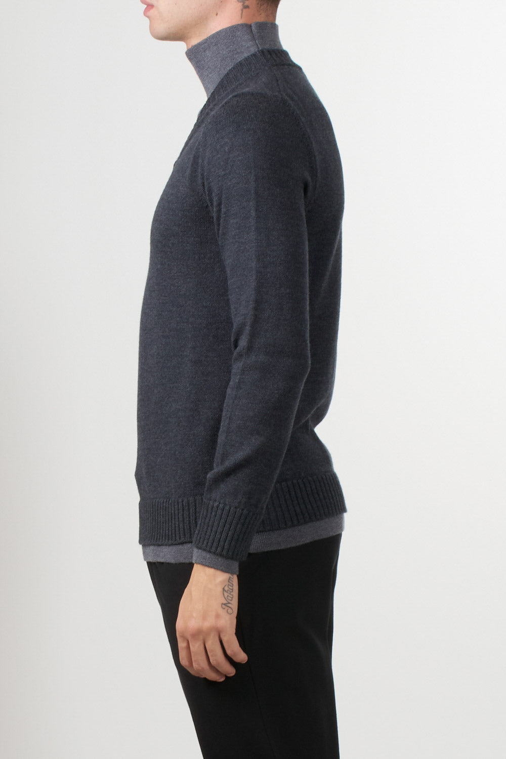 Alpha Studio sweater made of 100% merino wool, this model features an elegant double collar with an external V-neck and internal turtleneck, for a refined and modern layered effect. Finished with ribbed edges at the bottom and cuffs, it's ideal for casual chic looks or under a jacket during the colder months.