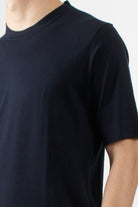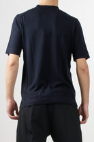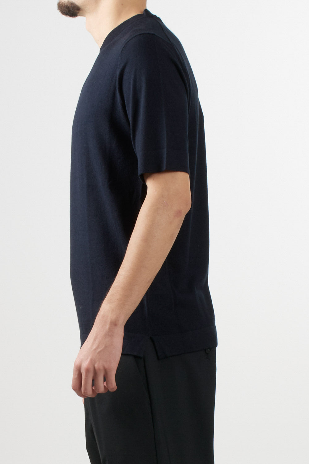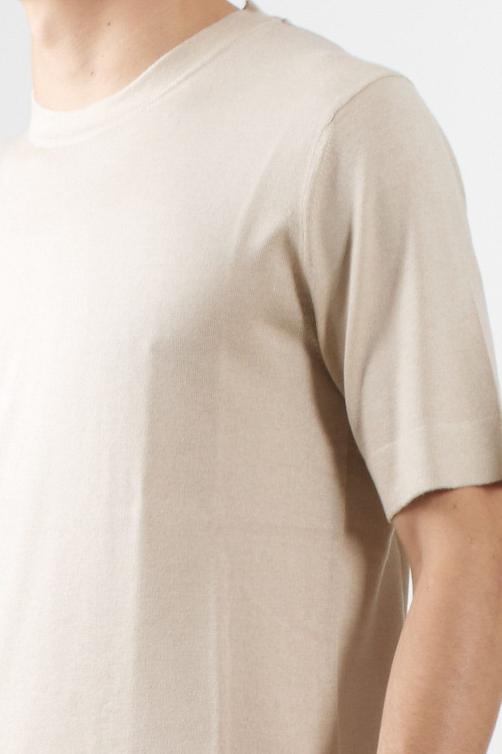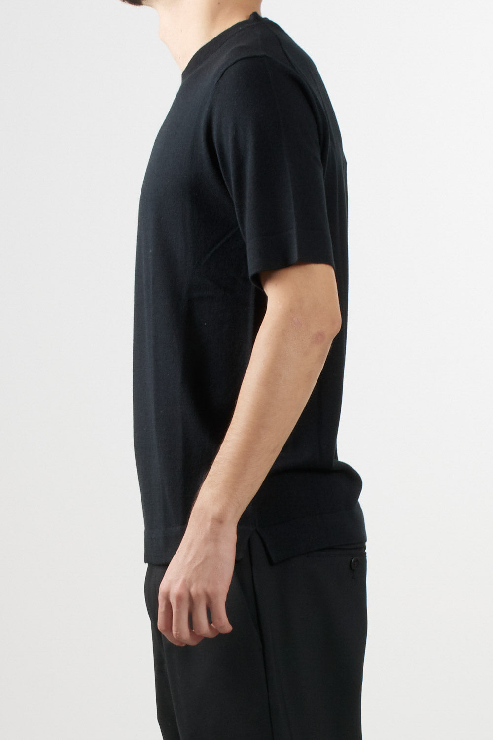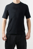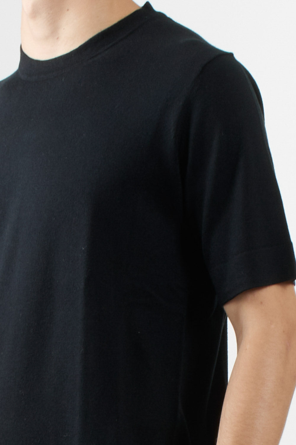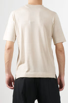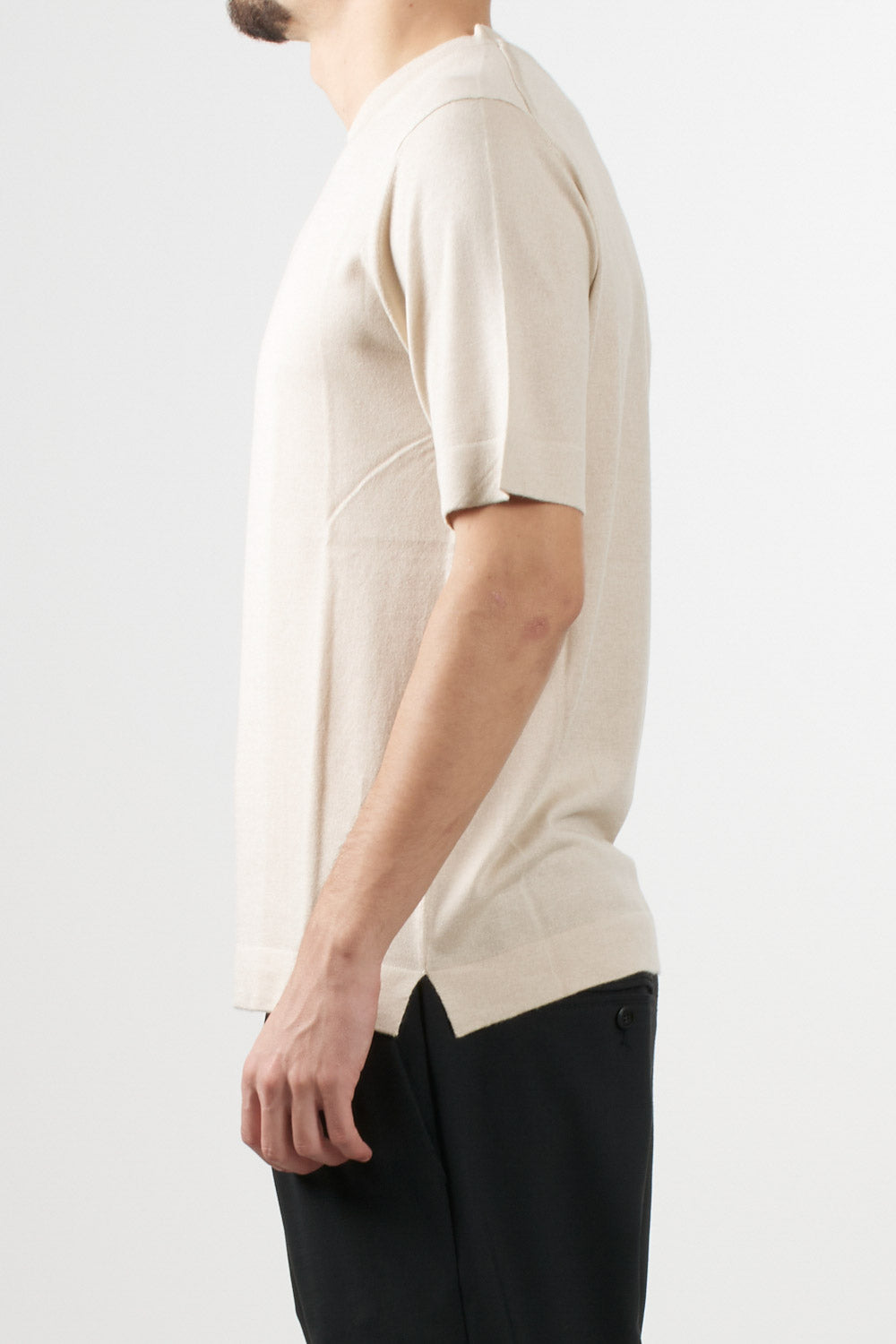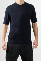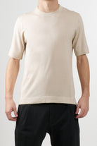 Short-sleeved sweater by Alpha Studio crafted from a premium Mulberry silk and cashmere yarn, providing a soft, lightweight feel. The simple design, featuring a crew neck and ribbed trims, enhances the clean, refined style of the piece, ideal for a casual-chic look or under a jacket.