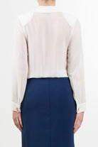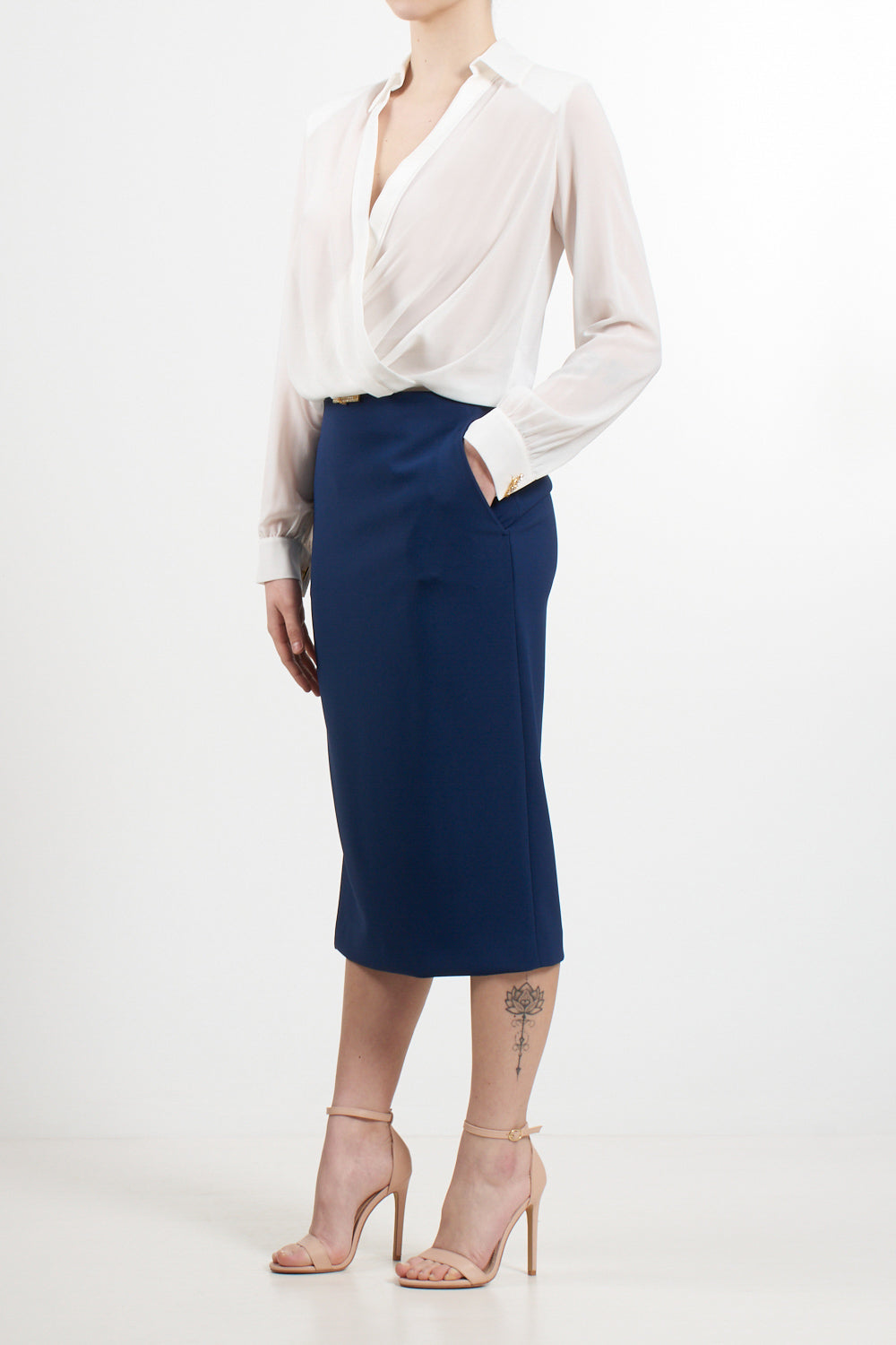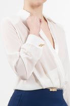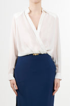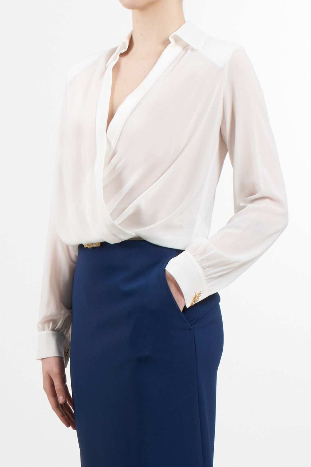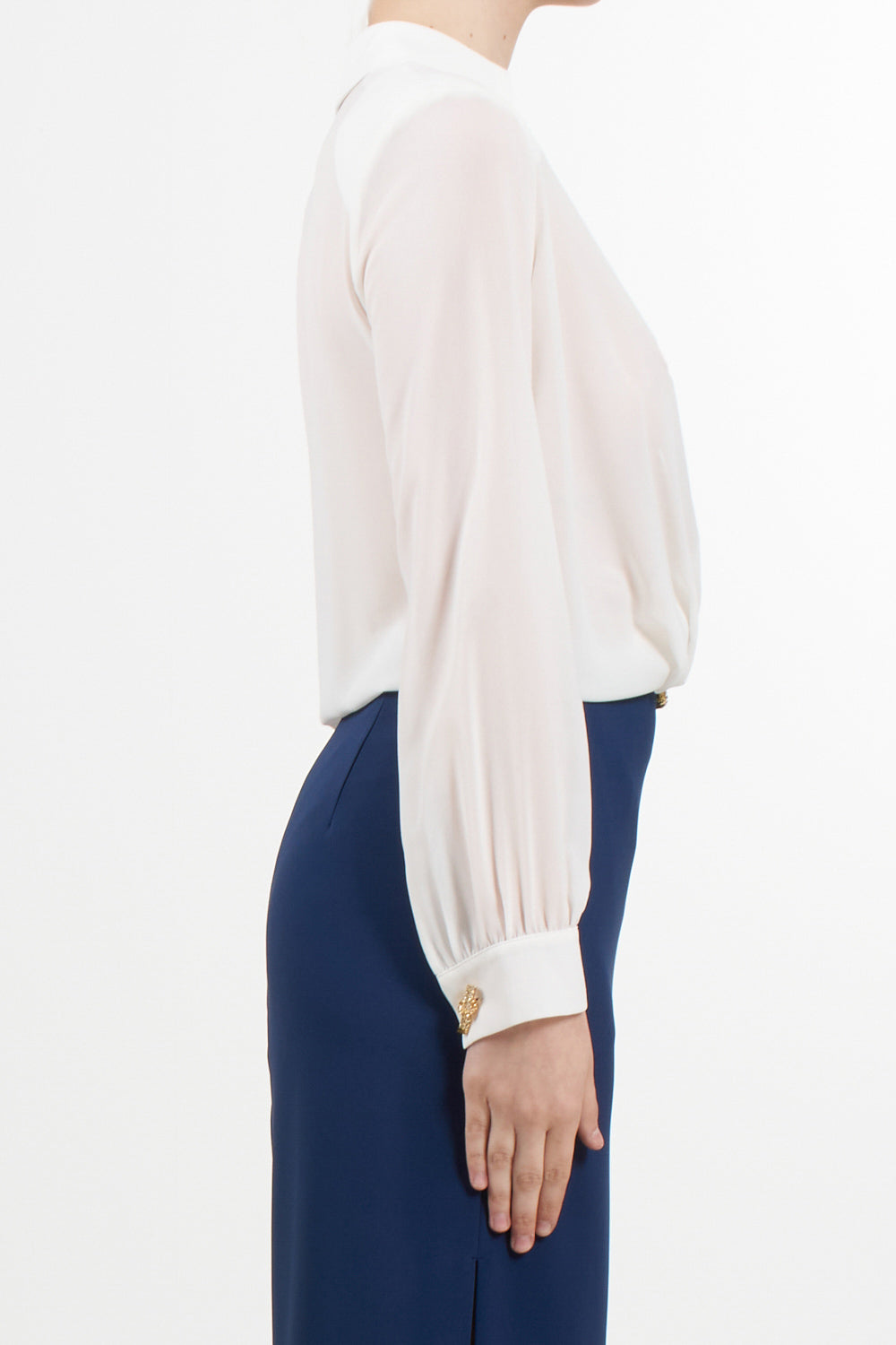 Body Shirt in georgette with long sleeves, draped on the front, embellished with a satin ribbon on the neckline and jewel cufflinks on the cuffs