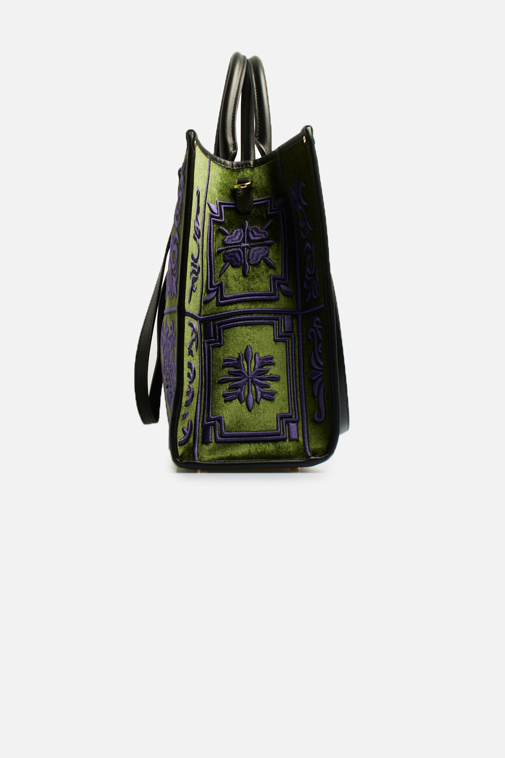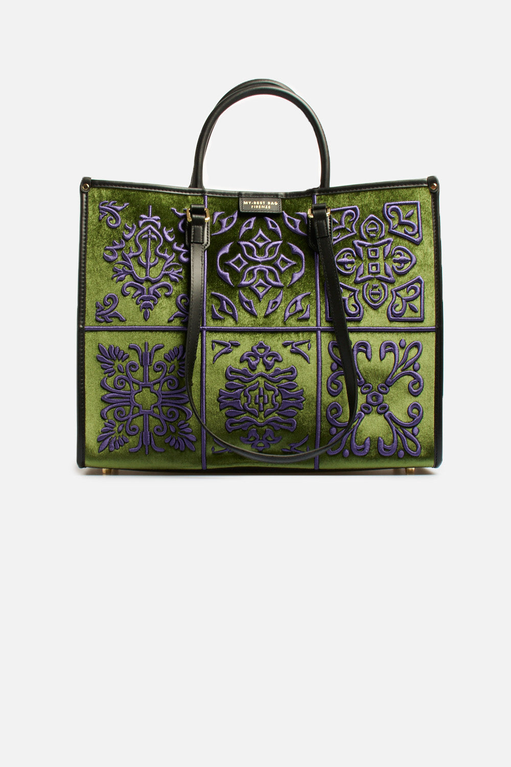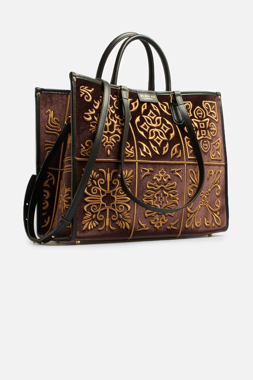 The Atena Lisbona Velvet bag from My Best Bag Firenze is a refined and elegant shopper, perfect for those seeking a distinctive accessory with a strong personality. Crafted from velvet embroidered with geometric and floral motifs, it features smooth leather handles and an adjustable shoulder strap. Inside, it features a practical removable zip pouch. Its rigid structure and iconic design make it suitable for both formal and everyday occasions, always maintaining a sophisticated style.