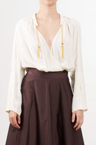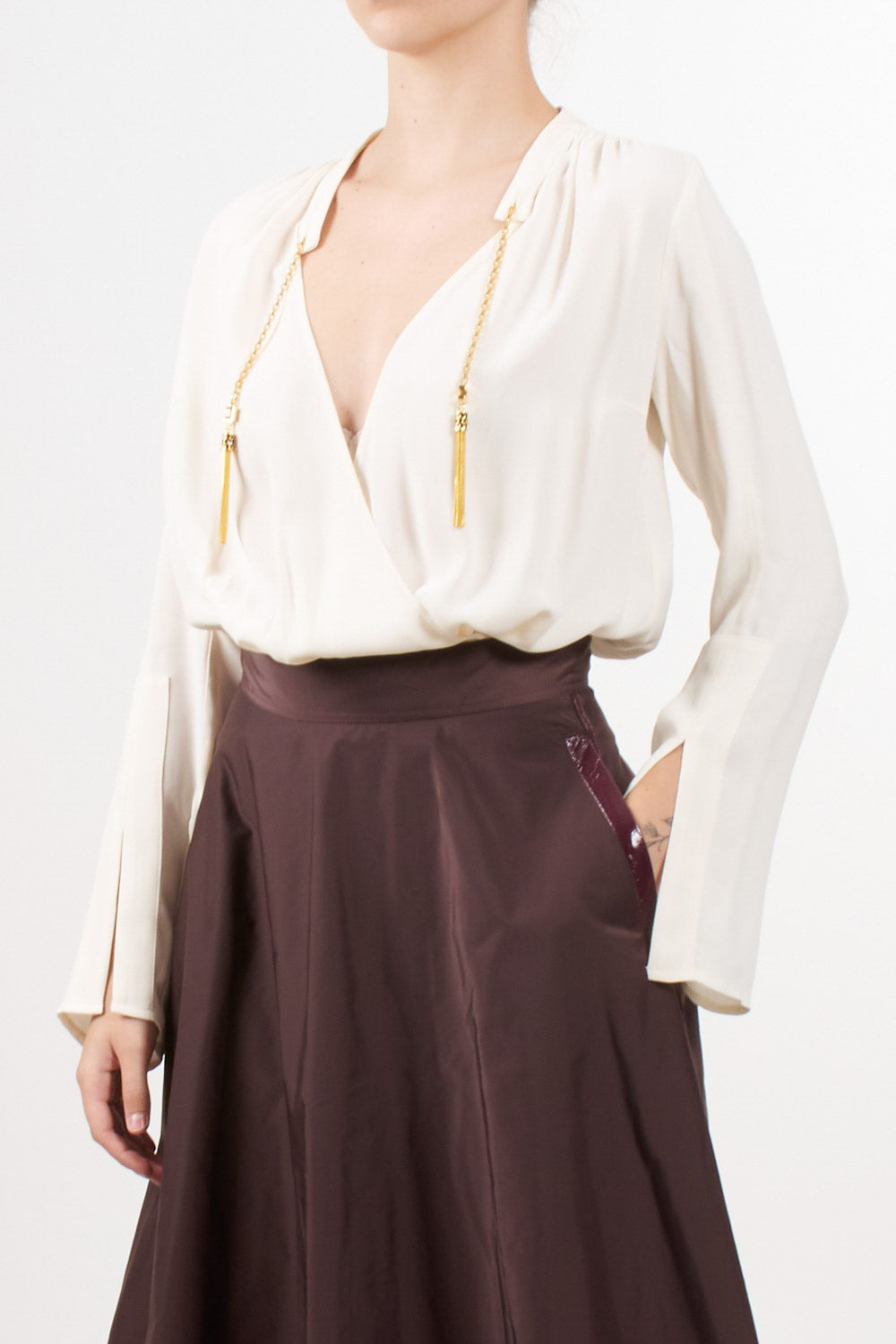 Slim-fit georgette bodysuit featuring a crossover V-neck with a mandarin collar and long sleeves with slits at the bottom. The piece's distinctive detail is the bejeweled cufflinks: gold chains with logo and tassels. Perfect for pairing with high-waisted skirts or trousers for a sophisticated look.