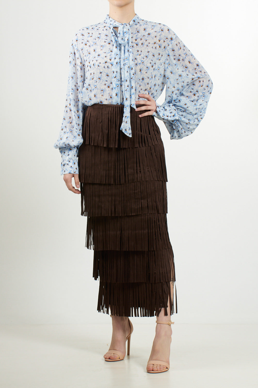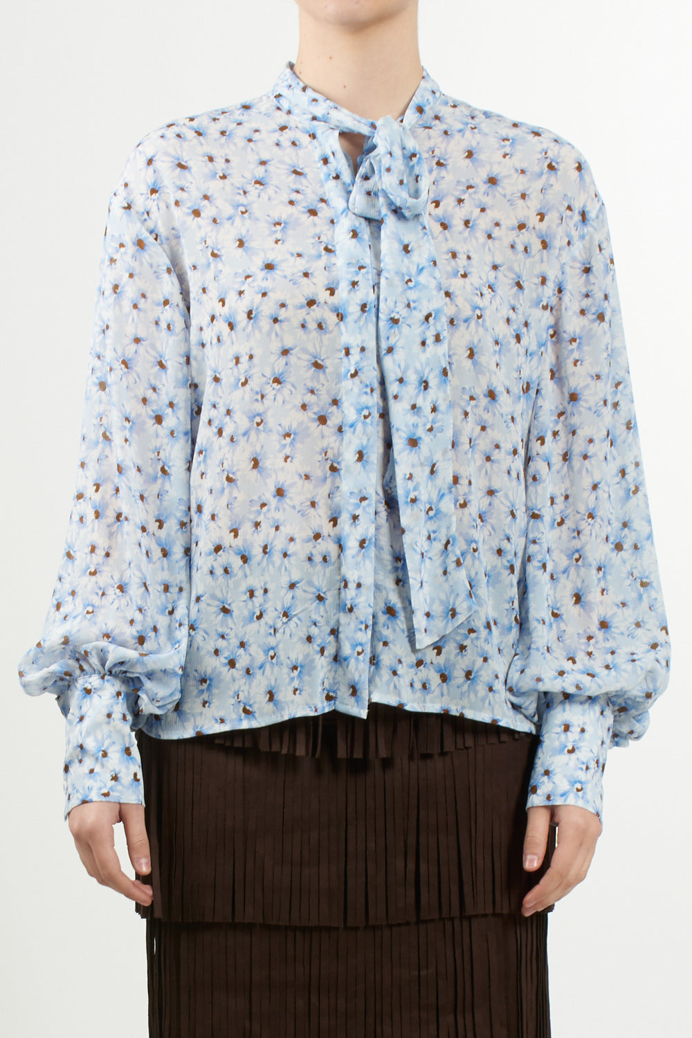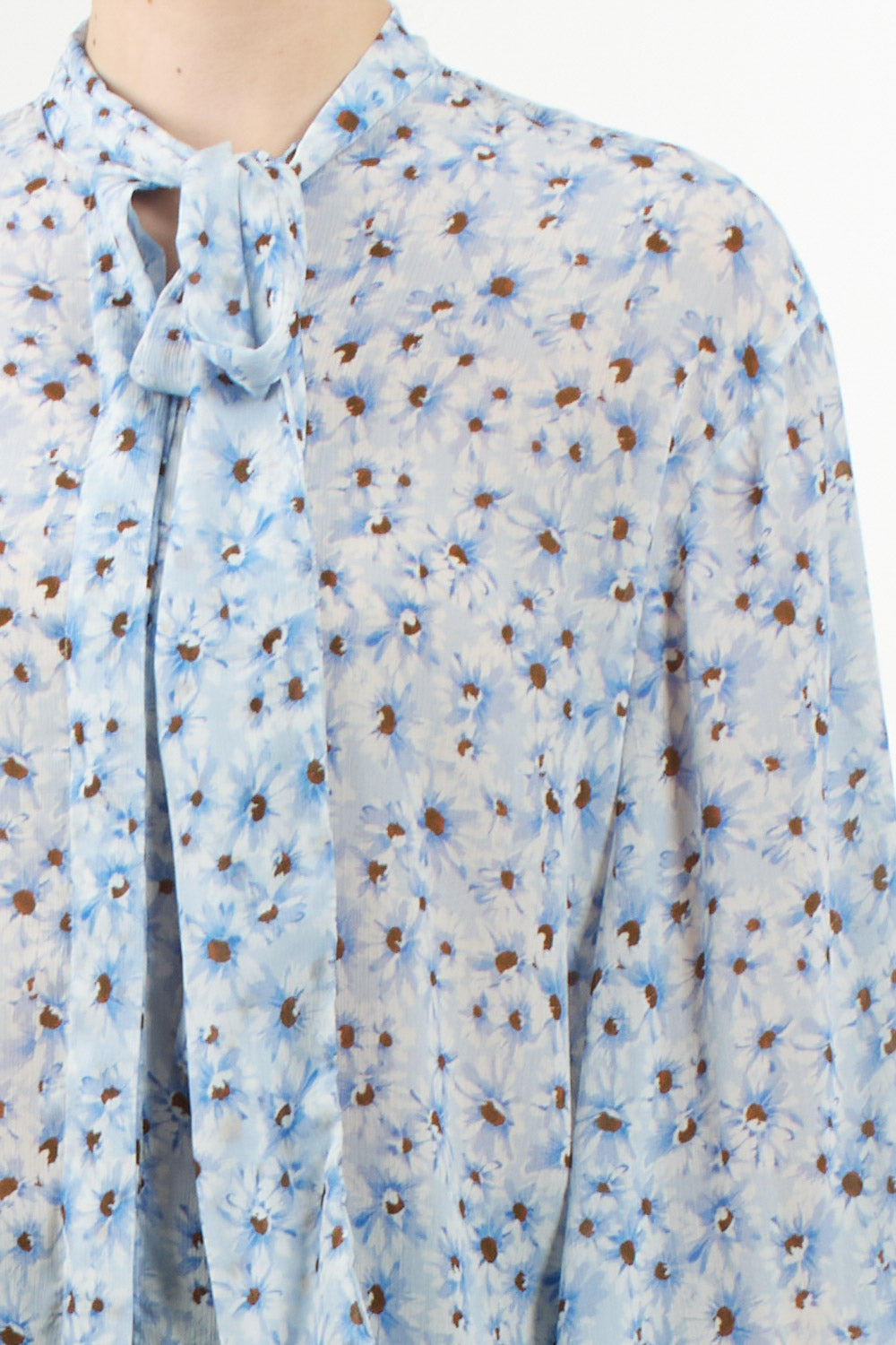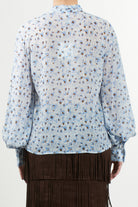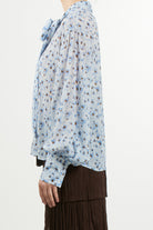 Light blue floral print shirt, with classic collar and long sleeves. The flowing fabric and delicate print make it perfect for the spring season, paired with jeans or skirts for a fresh and feminine look.