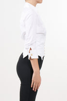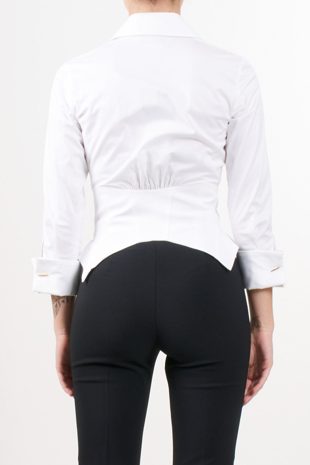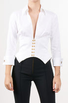 Stretch cotton shirt with a fitted cut, enhanced by a bustier construction that sculpts the silhouette. The V-neckline features three-quarter sleeves finished with logo cufflinks and a front closure with gold hooks. Slim fit.