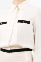 Fitted georgette shirt with a classic collar and triple bell cuffs for a touch of movement and lightness, while the enameled logo buttons add refined detailing. A versatile piece, ideal for elegant and sophisticated looks.