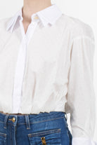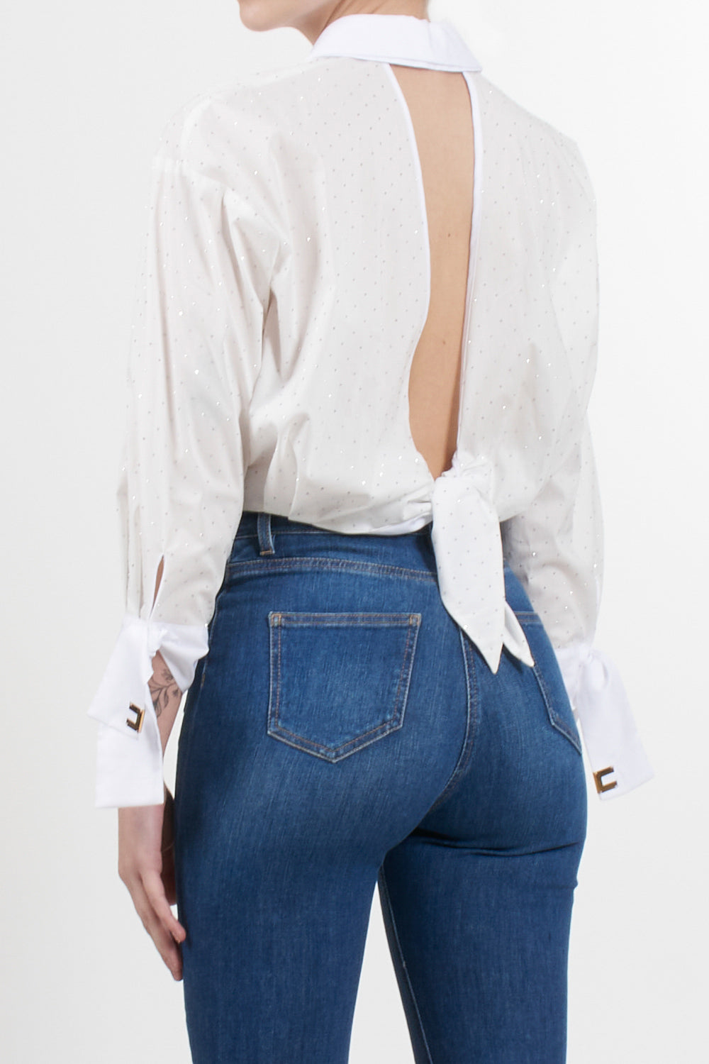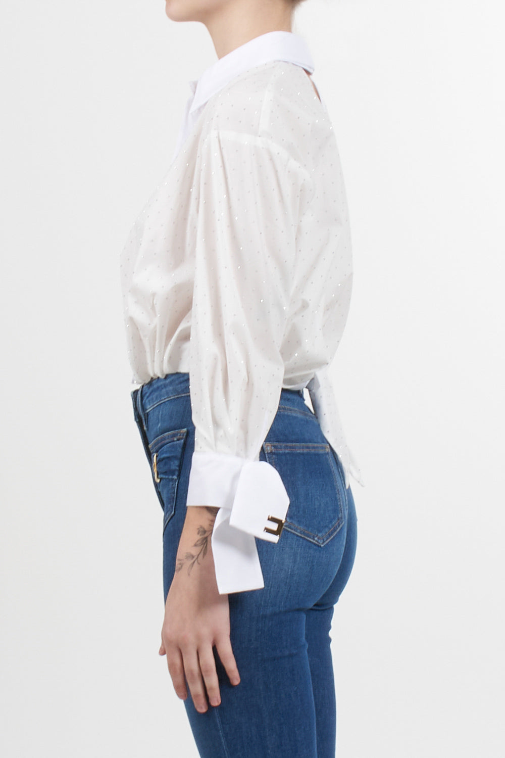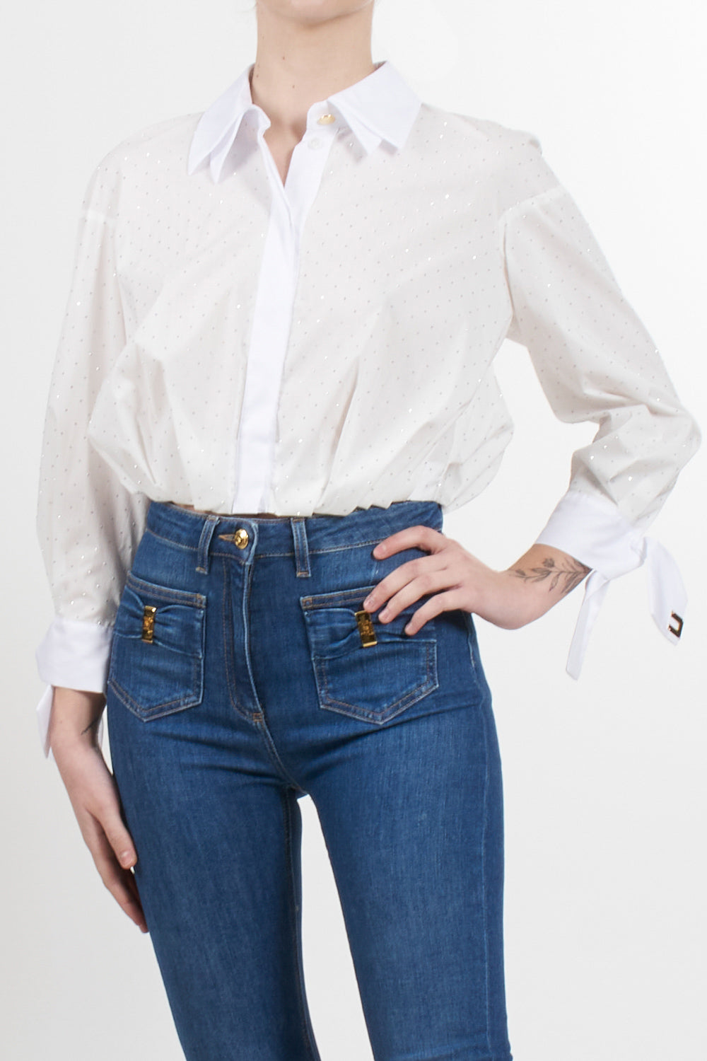 Cropped shirt by Elisabetta Franchi with all-over rhinestones, double collar and three-quarter sleeves with ribbon detail embellished with a button and gold metal logo applications, back with opening on the back and knotted at the bottom.