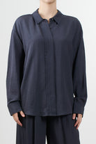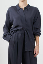 The Eleh long-sleeved shirt features a relaxed fit and a relaxed silhouette. Crafted from lightweight fabric with a classic collar and covered front closure, it's a versatile piece perfect for wearing with matching trousers or other casual or dressy outfits.