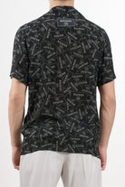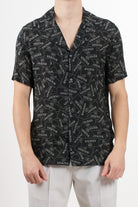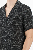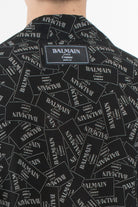 Viscose shirt with short sleeves and button closure. The model features an open collar and an all-over print with Balmain logos arranged regularly across the entire surface. The lightweight structure and straight cut make it suitable for casual summer contexts.