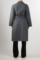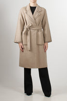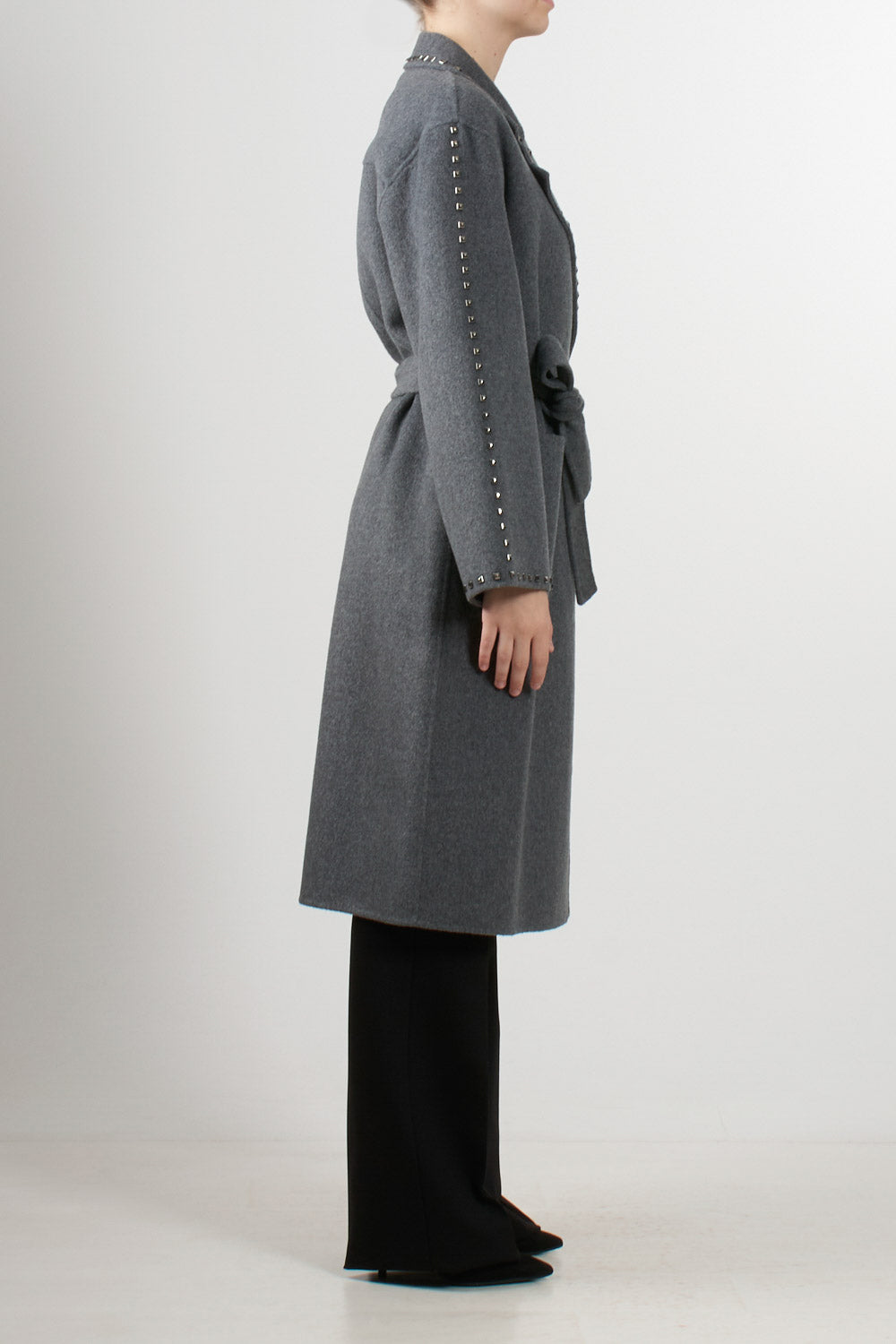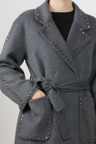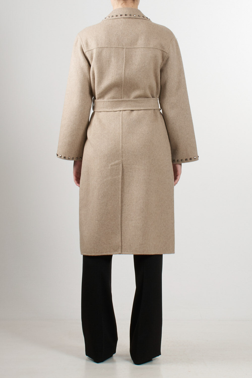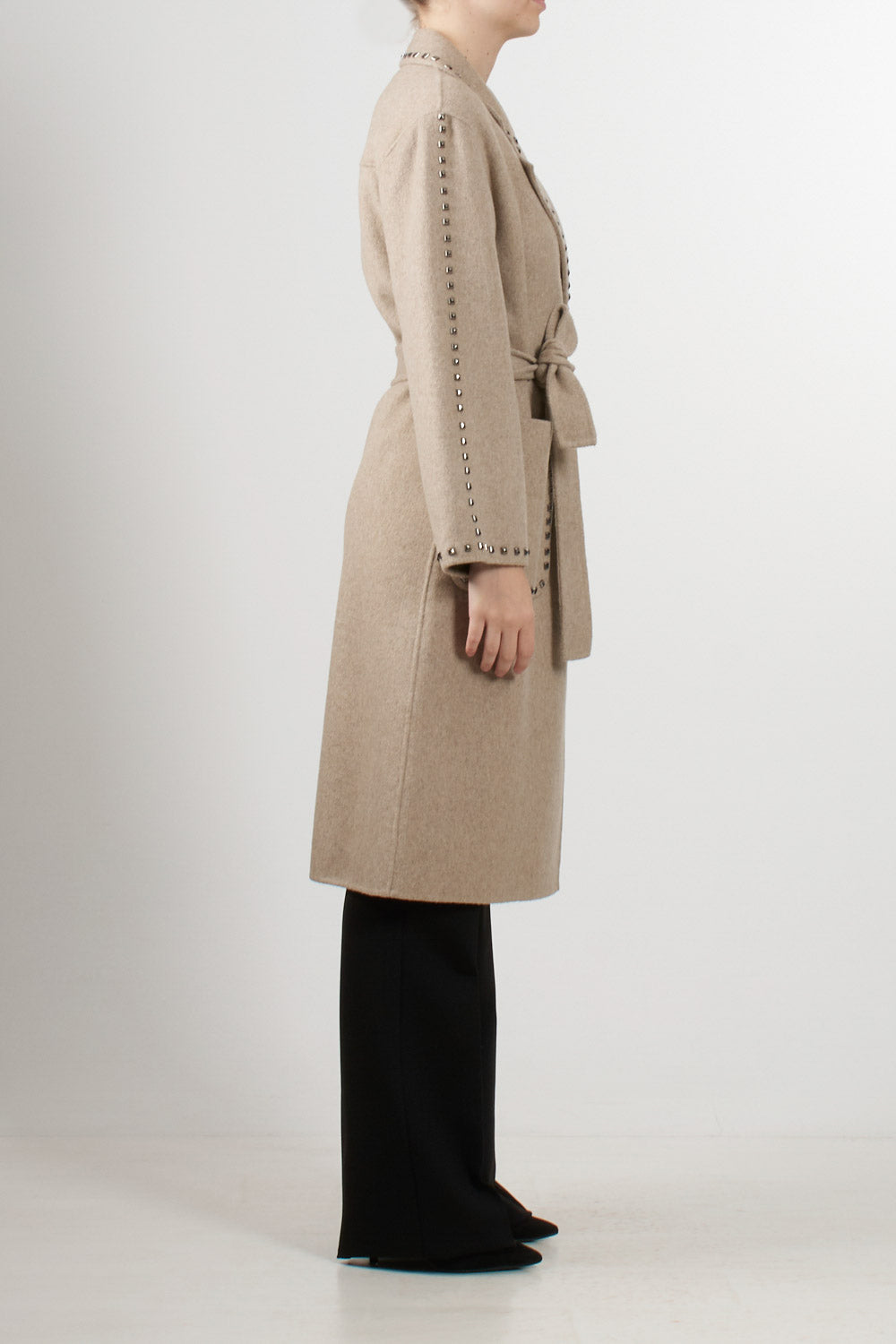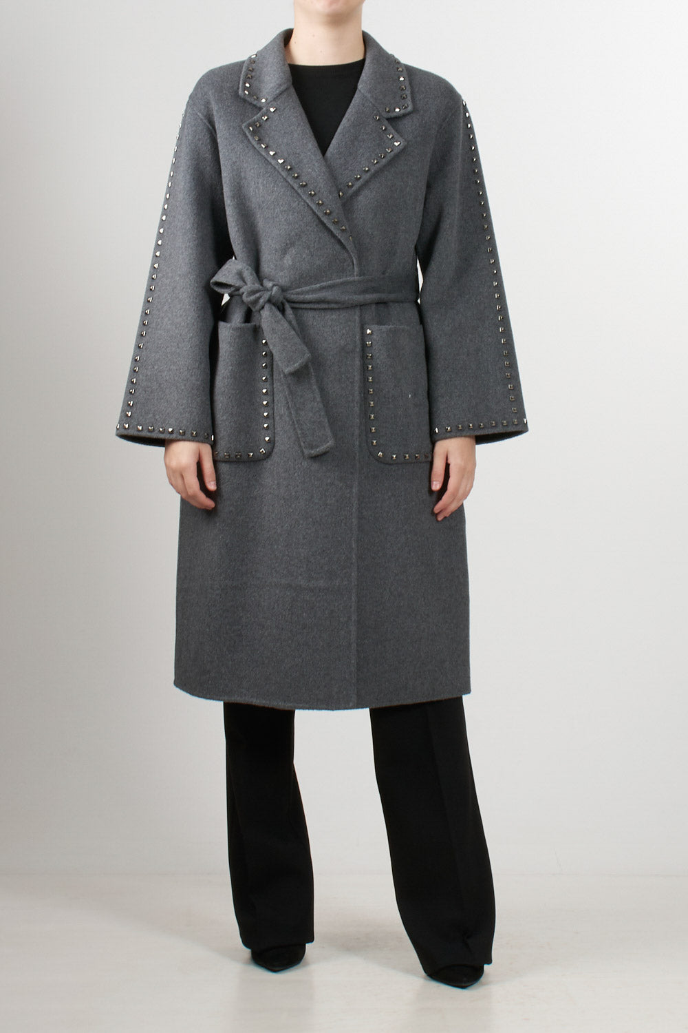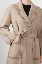 Women's wool blend coat, featuring a straight fit and a matching belt at the waist. The style features wide lapels, patch pockets, and trims decorated with metal studs that give the garment a contemporary touch. Perfect for completing elegant or casual-chic looks during the cold season.
