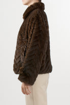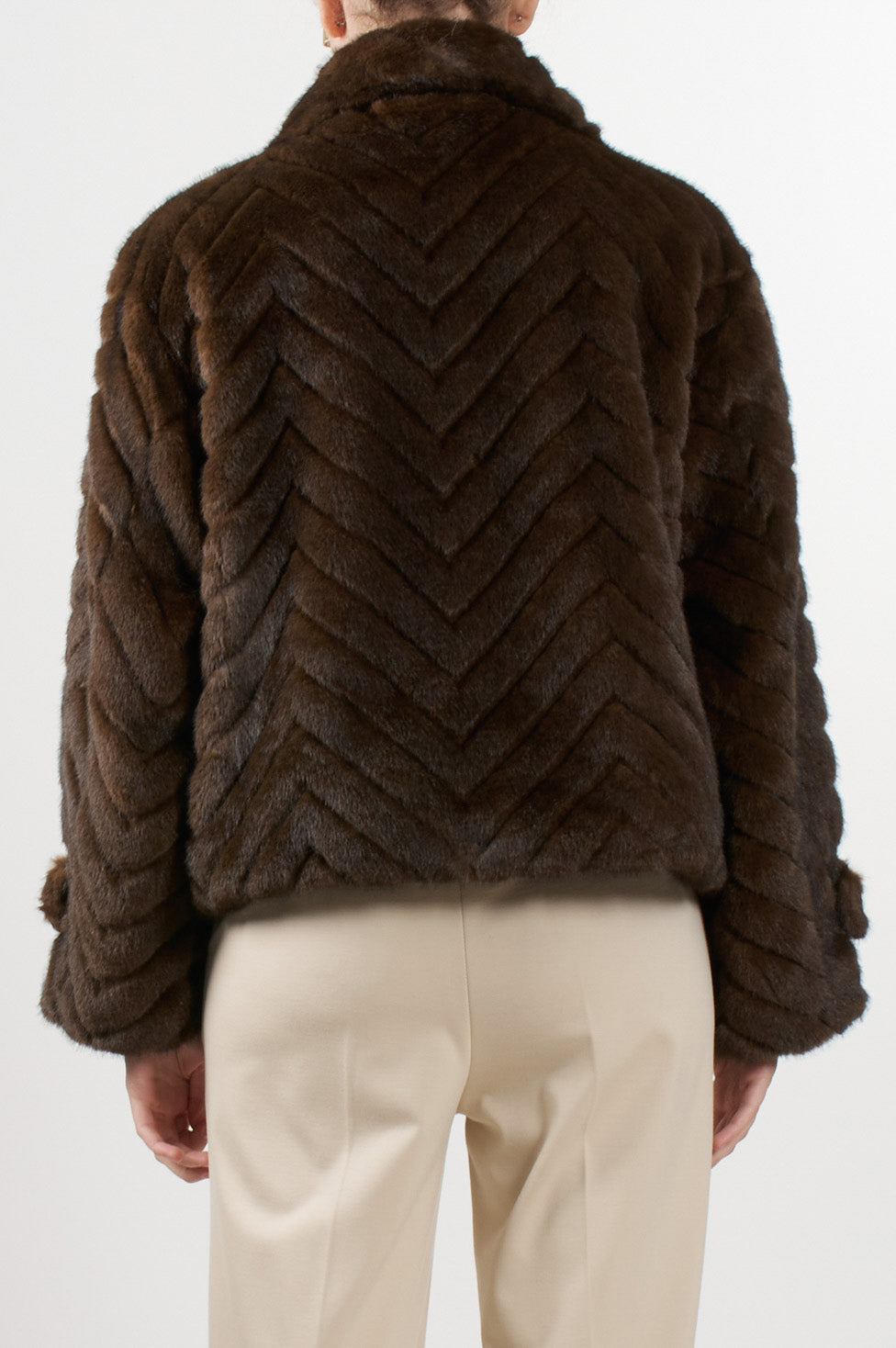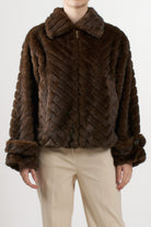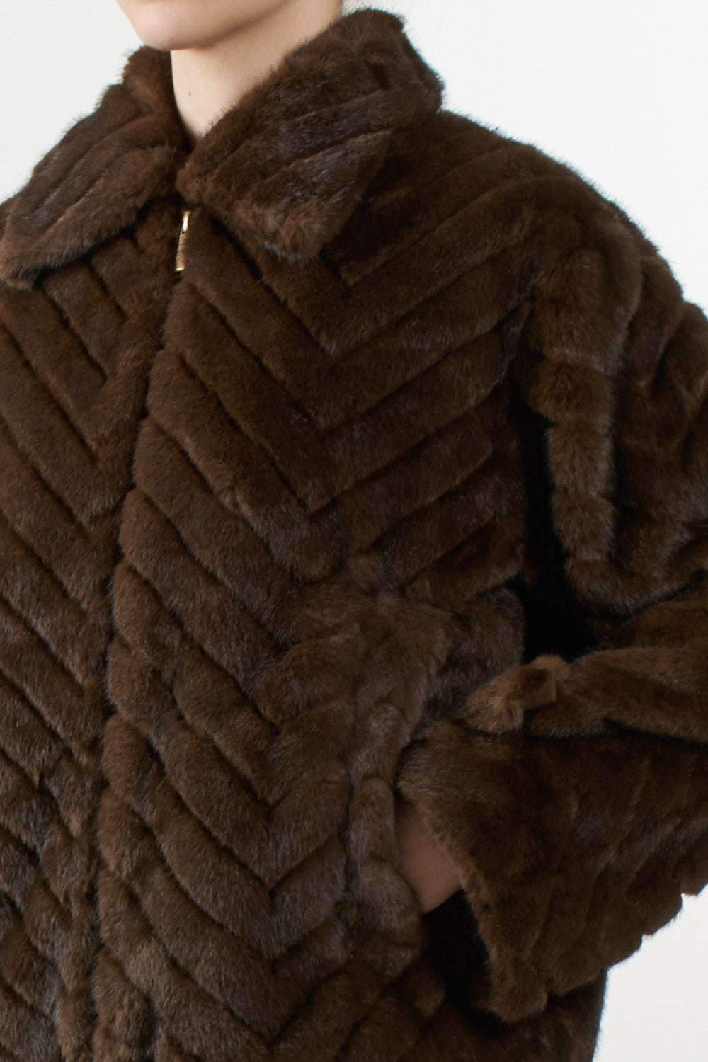 Vicolo faux fur coat, featuring a diagonal texture that creates a sophisticated and voluminous effect. It features a classic collar, a front zip closure, and cuffs finished with a band and button. A comfortable fit, it's ideal for elegant or casual-chic looks on colder days.