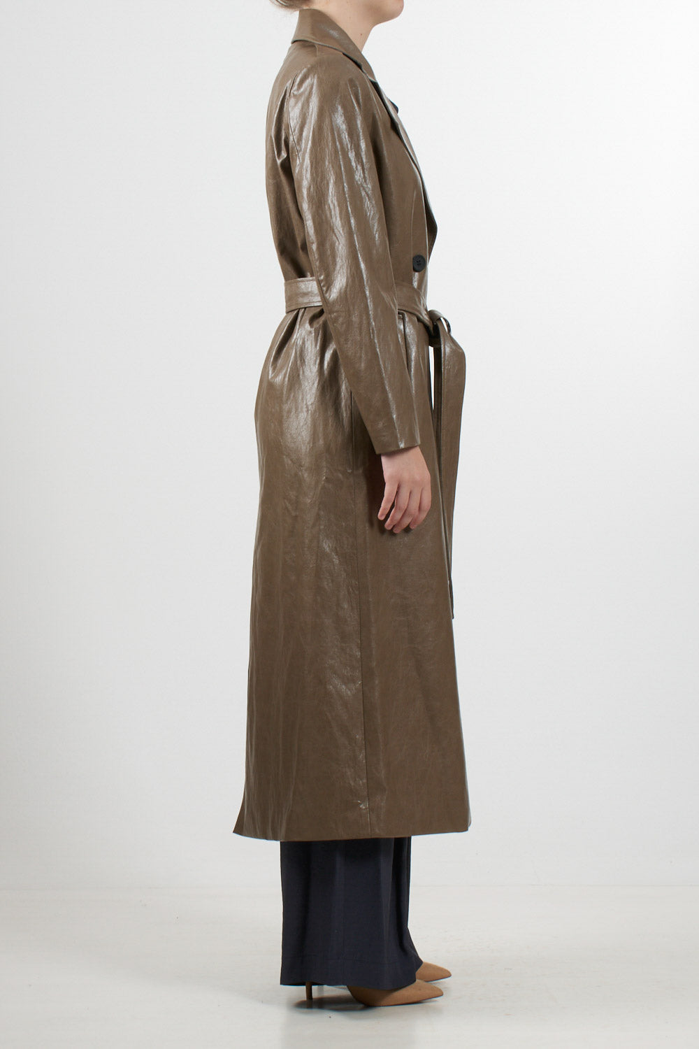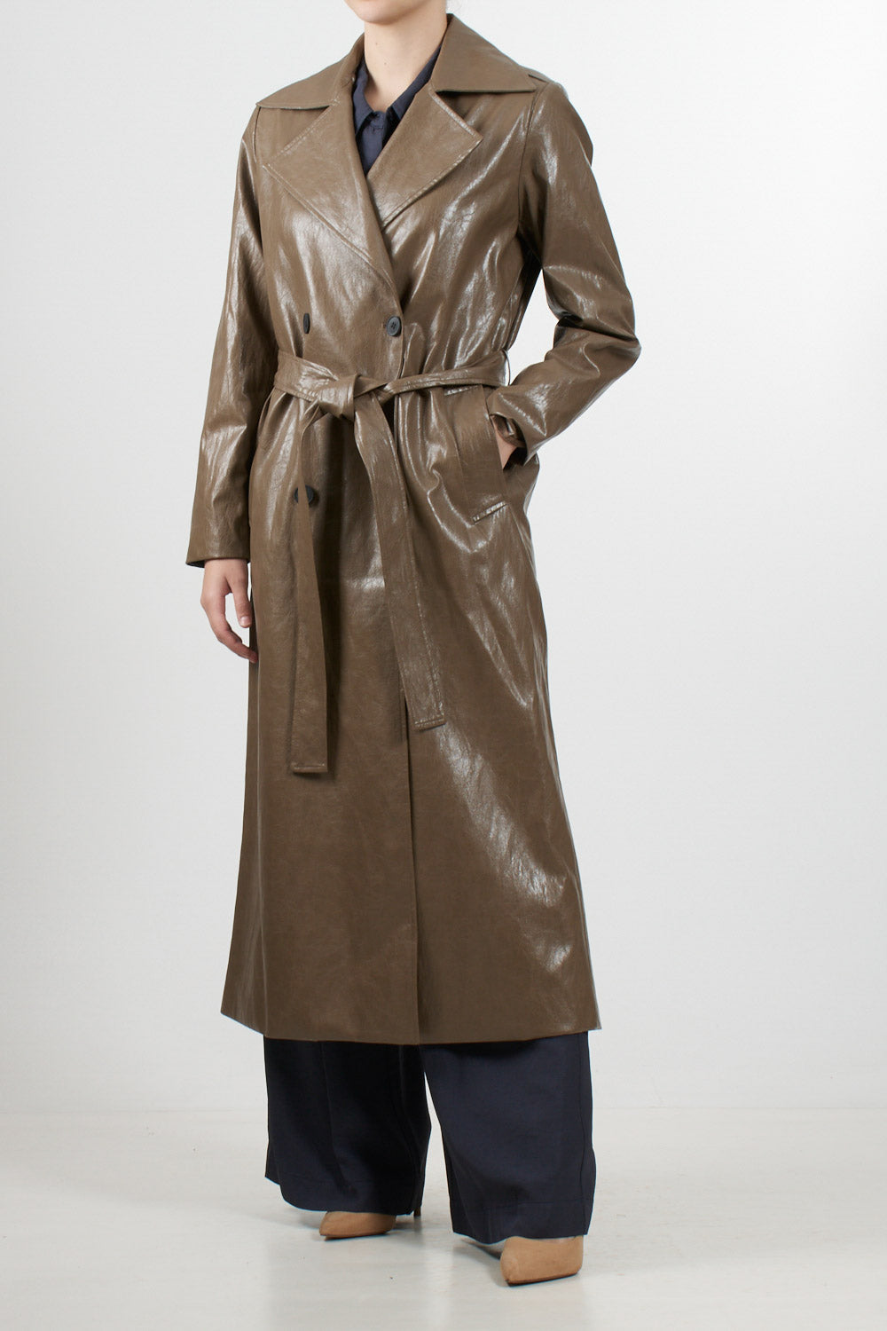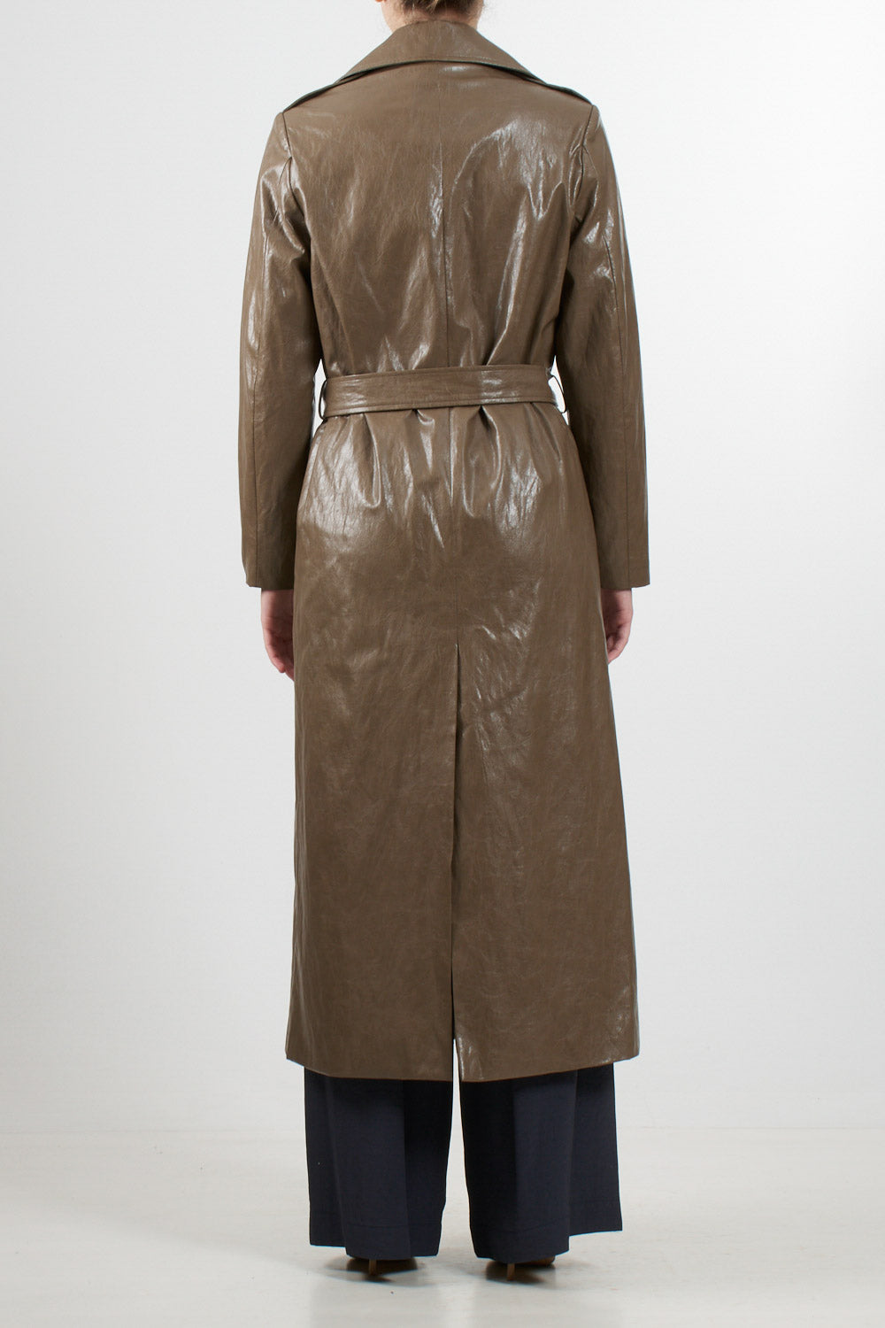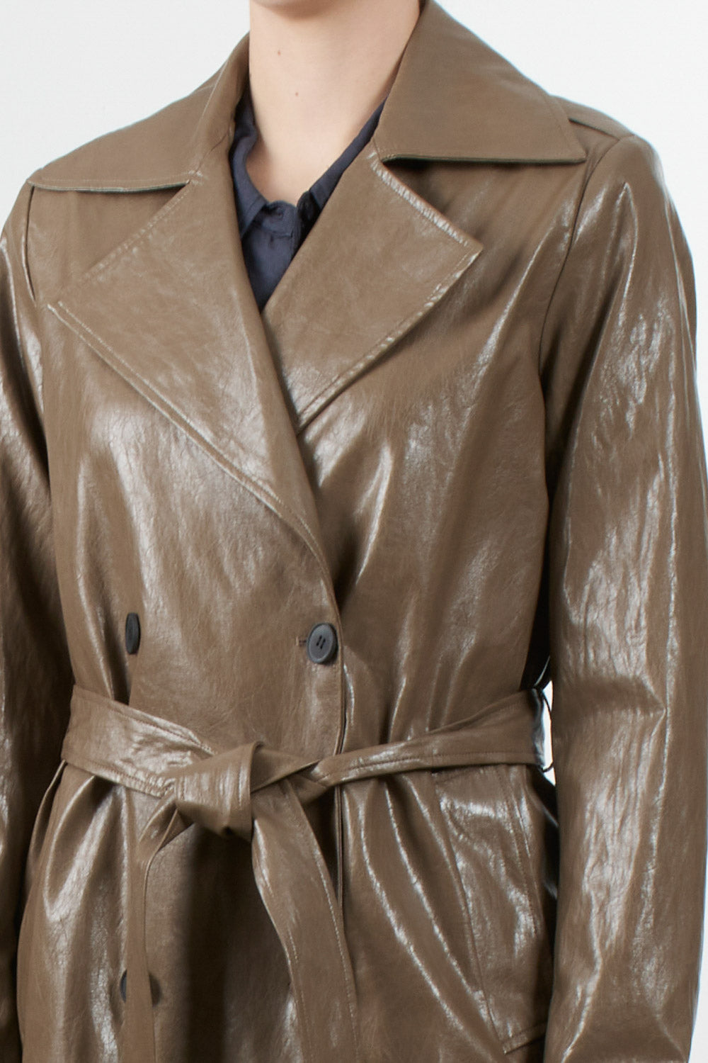 Eleh's classic-fit long trench coat is crafted from faux leather. It features a double-breasted button closure, a matching belt at the waist to define the silhouette, and side pockets.