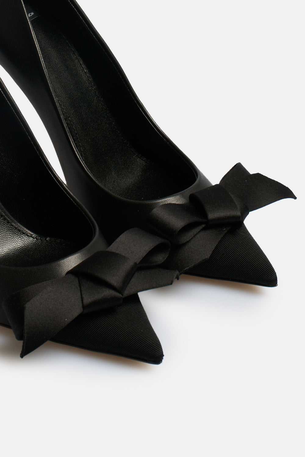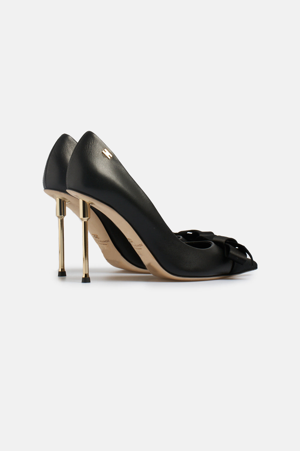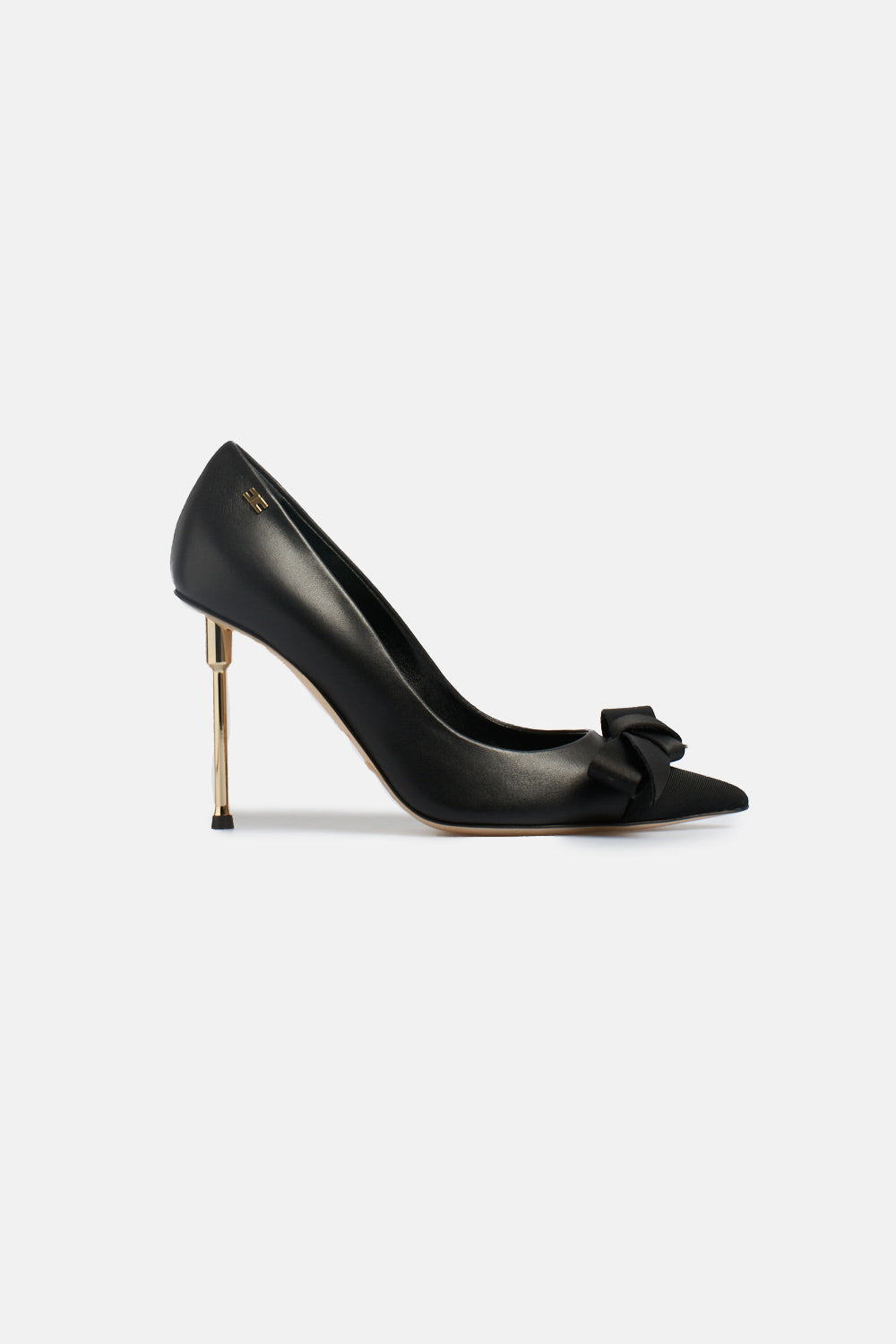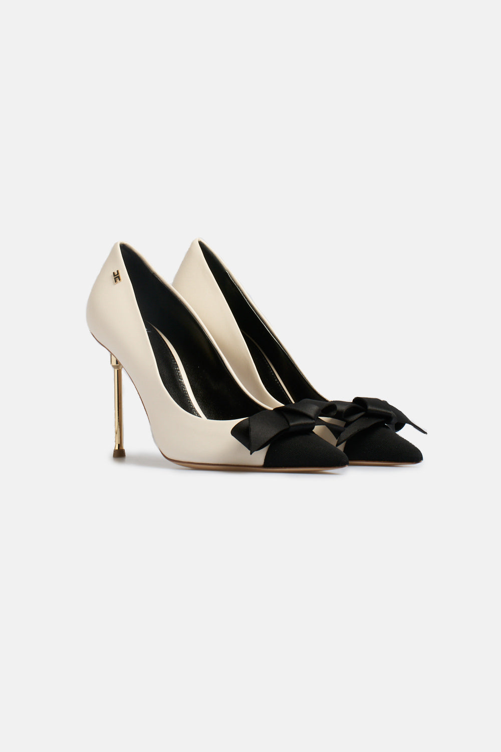 Elisabetta Franchi décolleté made of soft nappa, with a contrasting tapered toe decorated with a maxi satin bow, thin heel in gold-colored metal