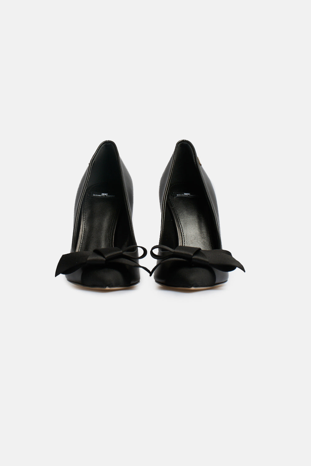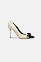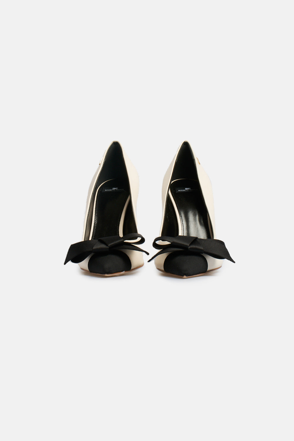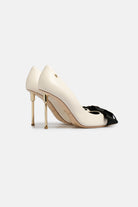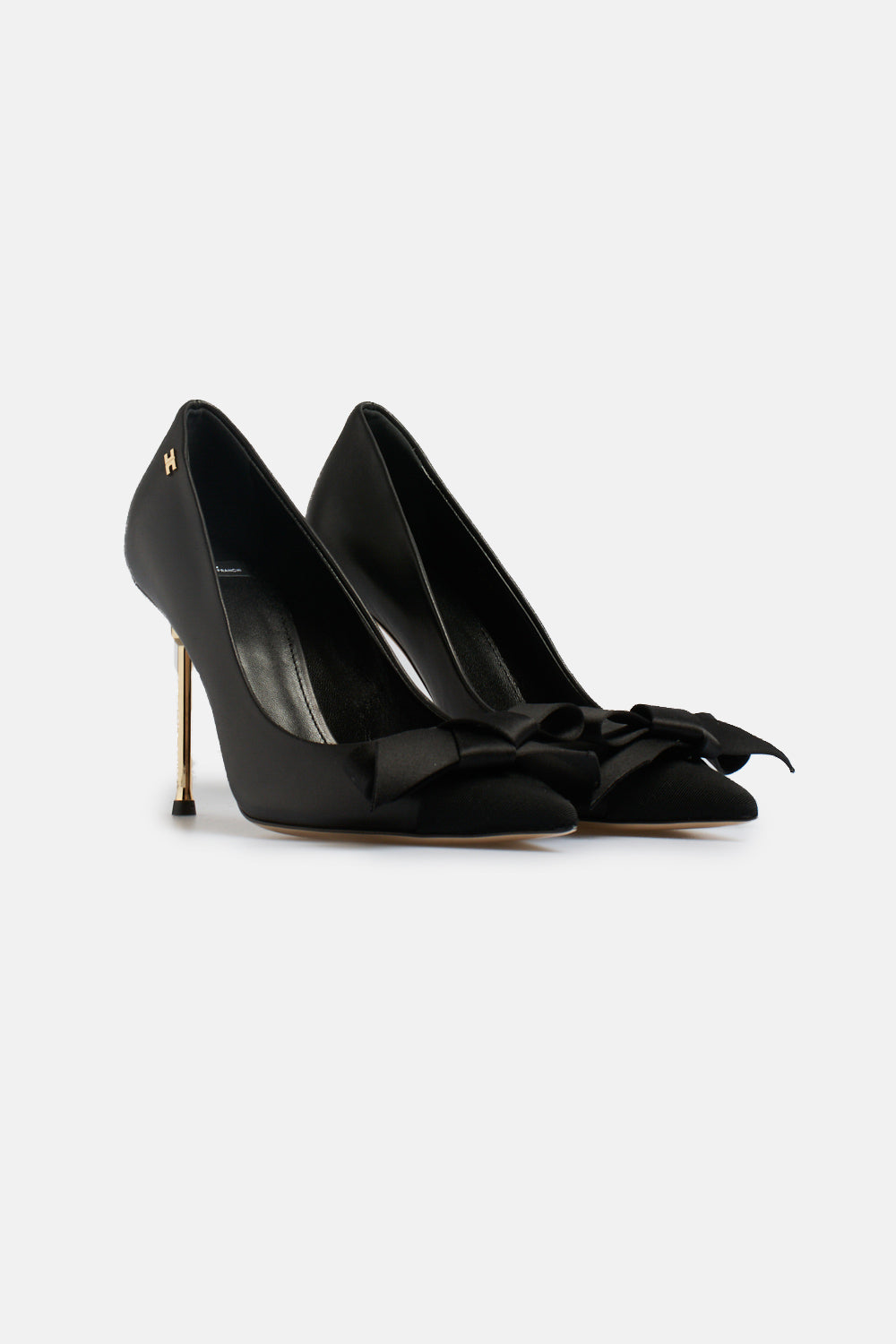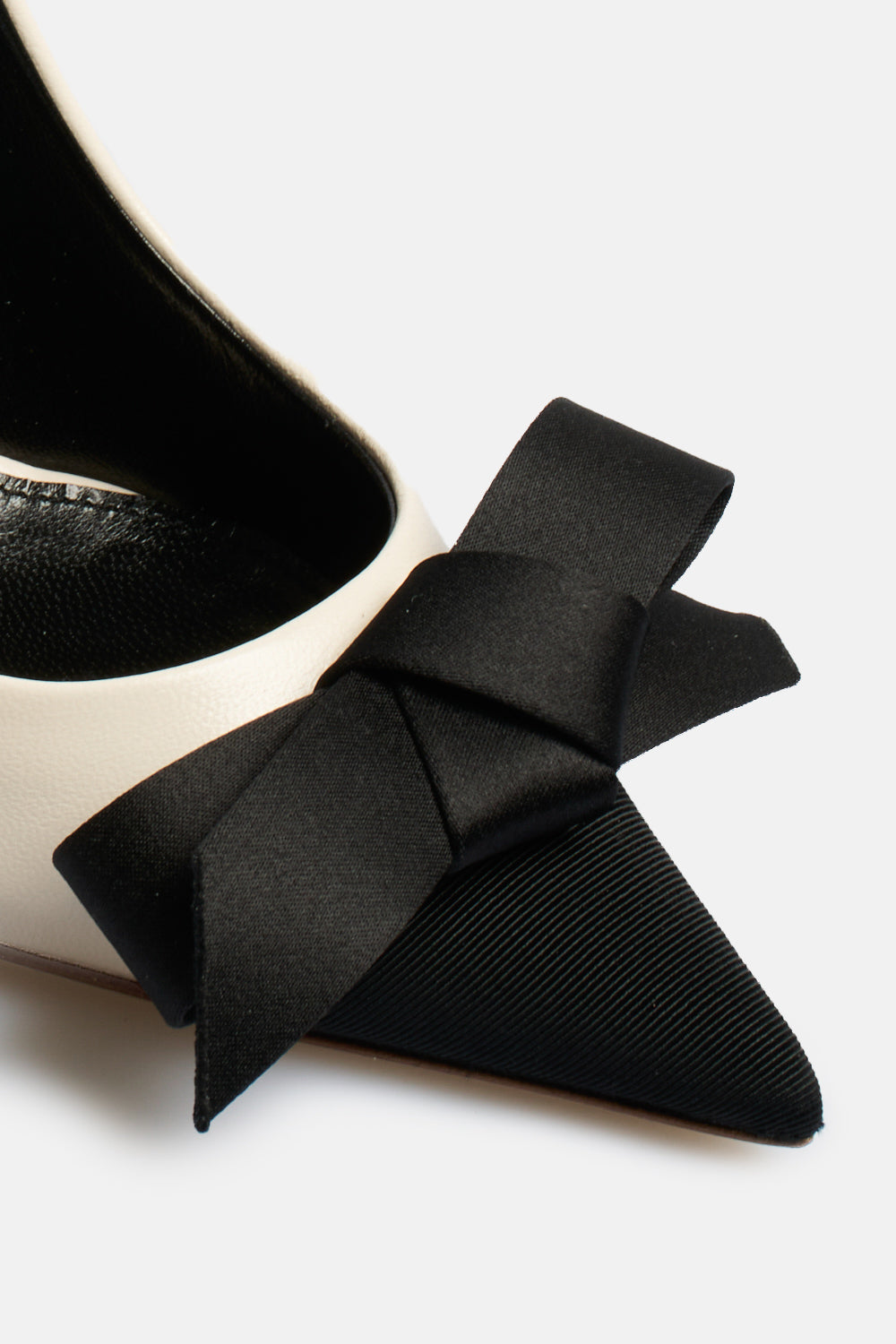Elisabetta Franchi décolleté made of soft nappa, with a contrasting tapered toe decorated with a maxi satin bow, thin heel in gold-colored metal