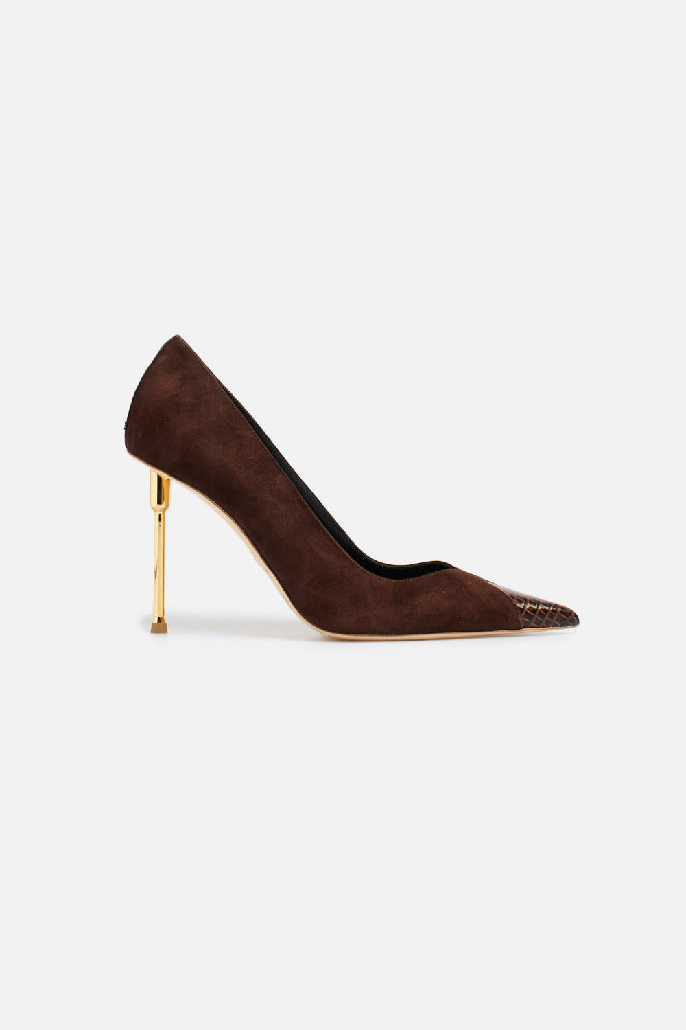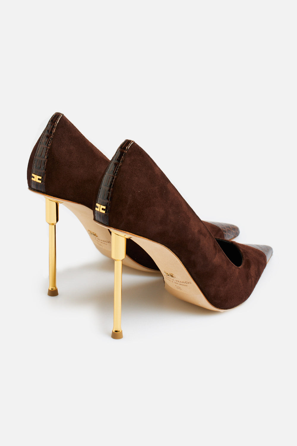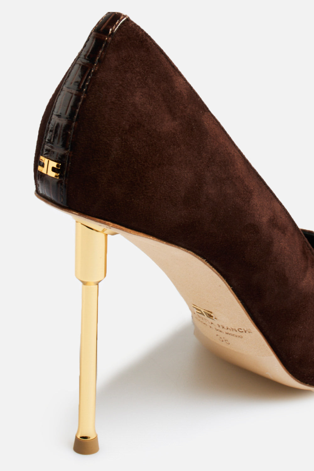 Leather pumps by Elisabetta Franchi, sculptural heel with gold finish that slims the figure and gives a geometric line, leather sole